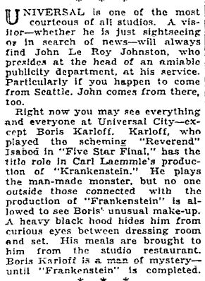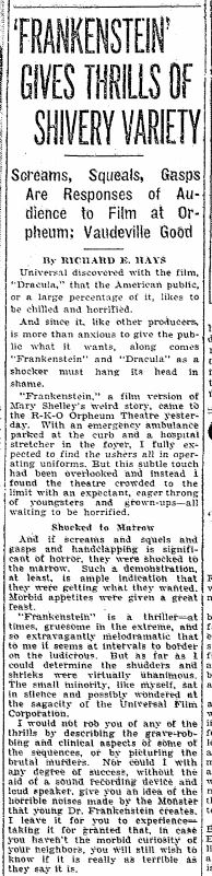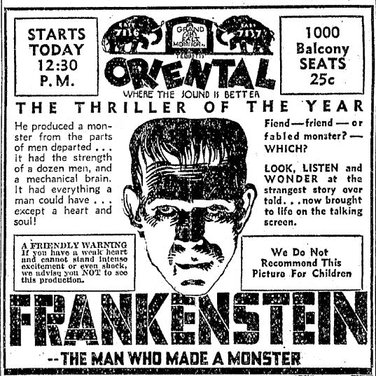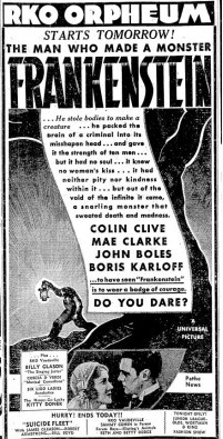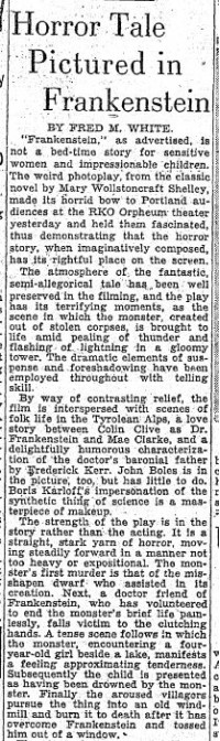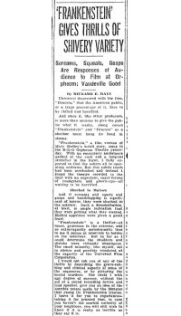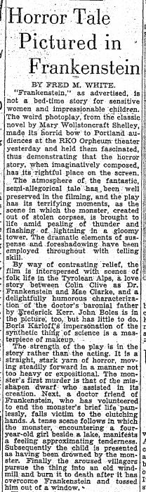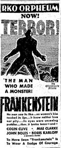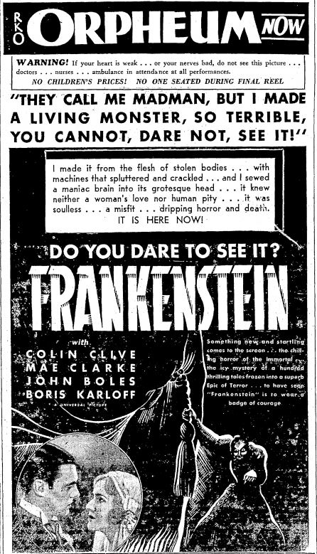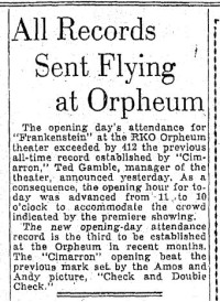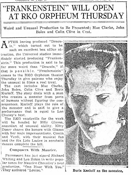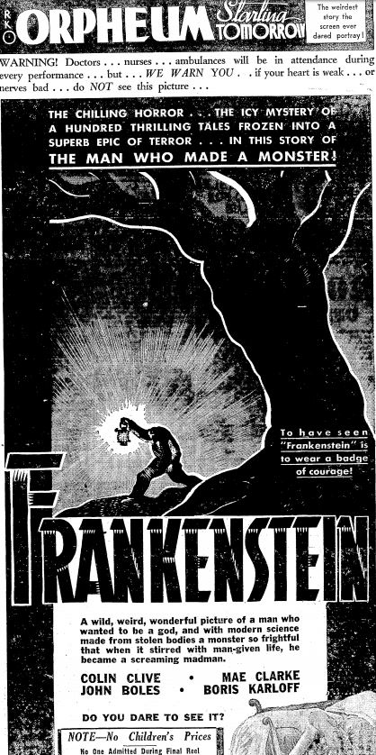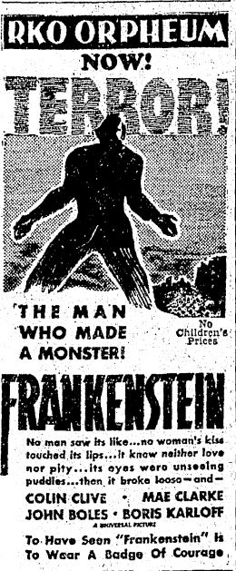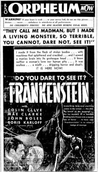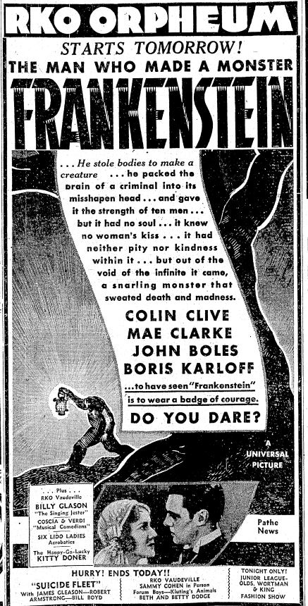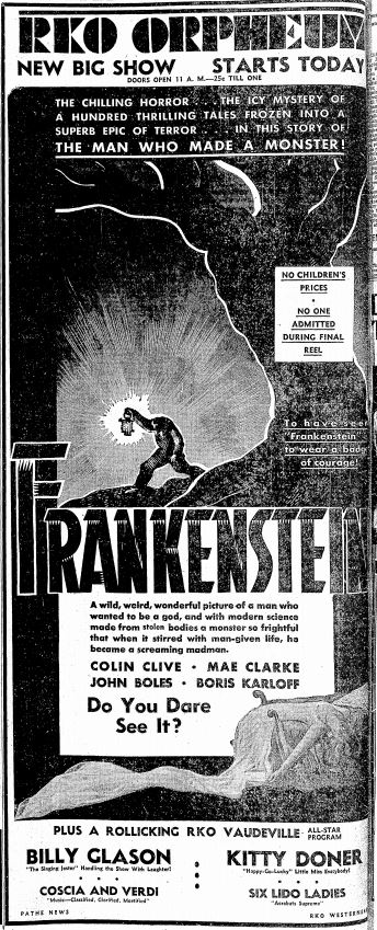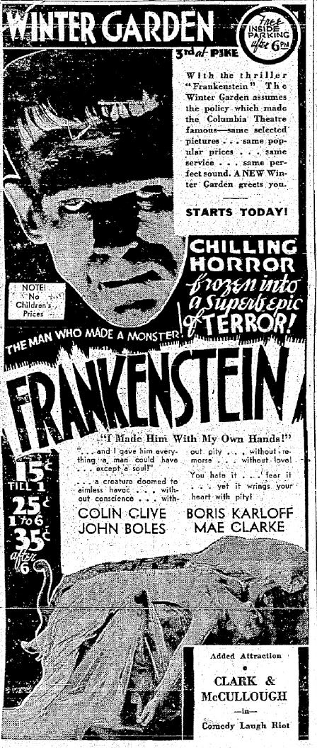 Below you will find a collection of images from the time "Frankenstein" played in Seattle and Portland. Seattle's Orpheum got the film first, then Portland's Orpheum.