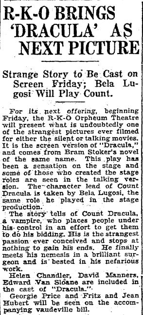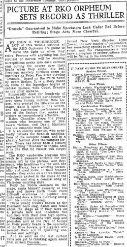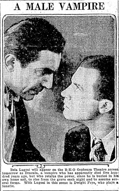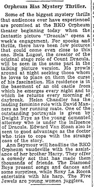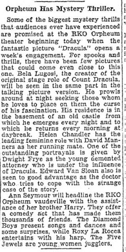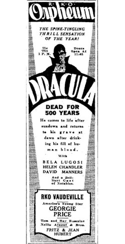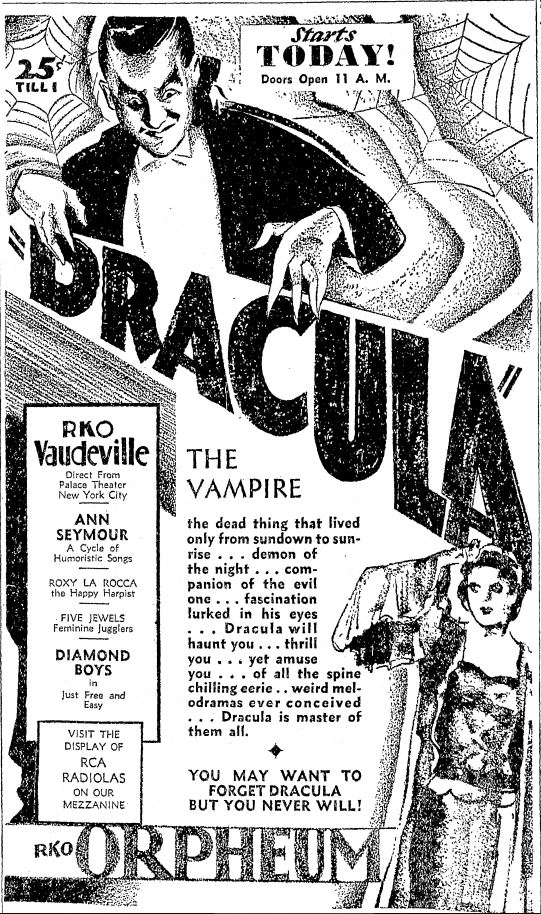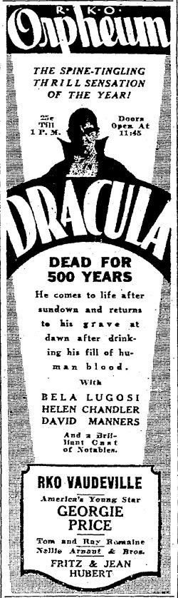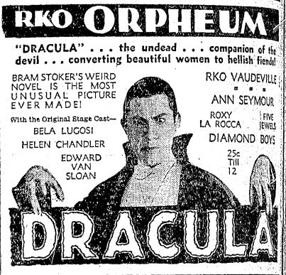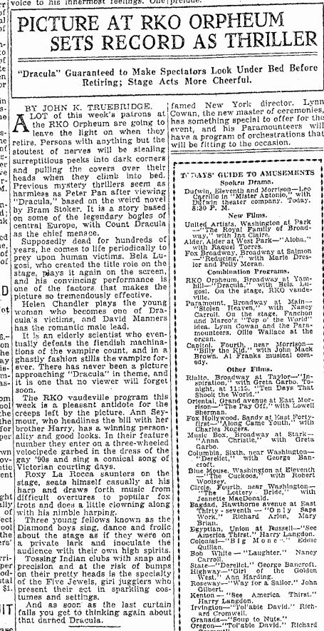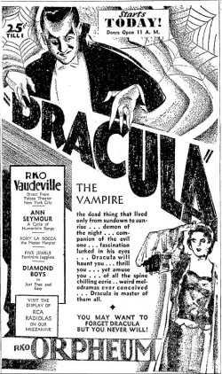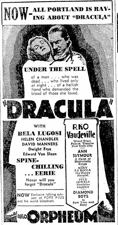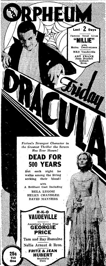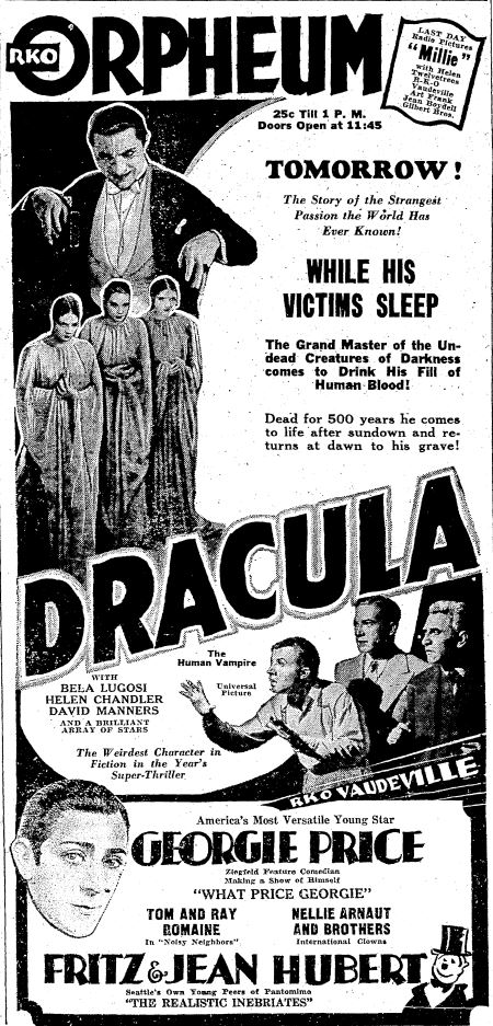 Below you will find a collection of images from the time "Dracula" played in Seattle and Portland. Portland's Orpheum got it a day sooner than Seattle's.