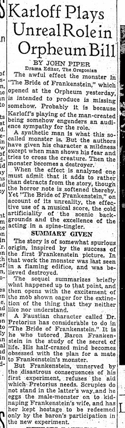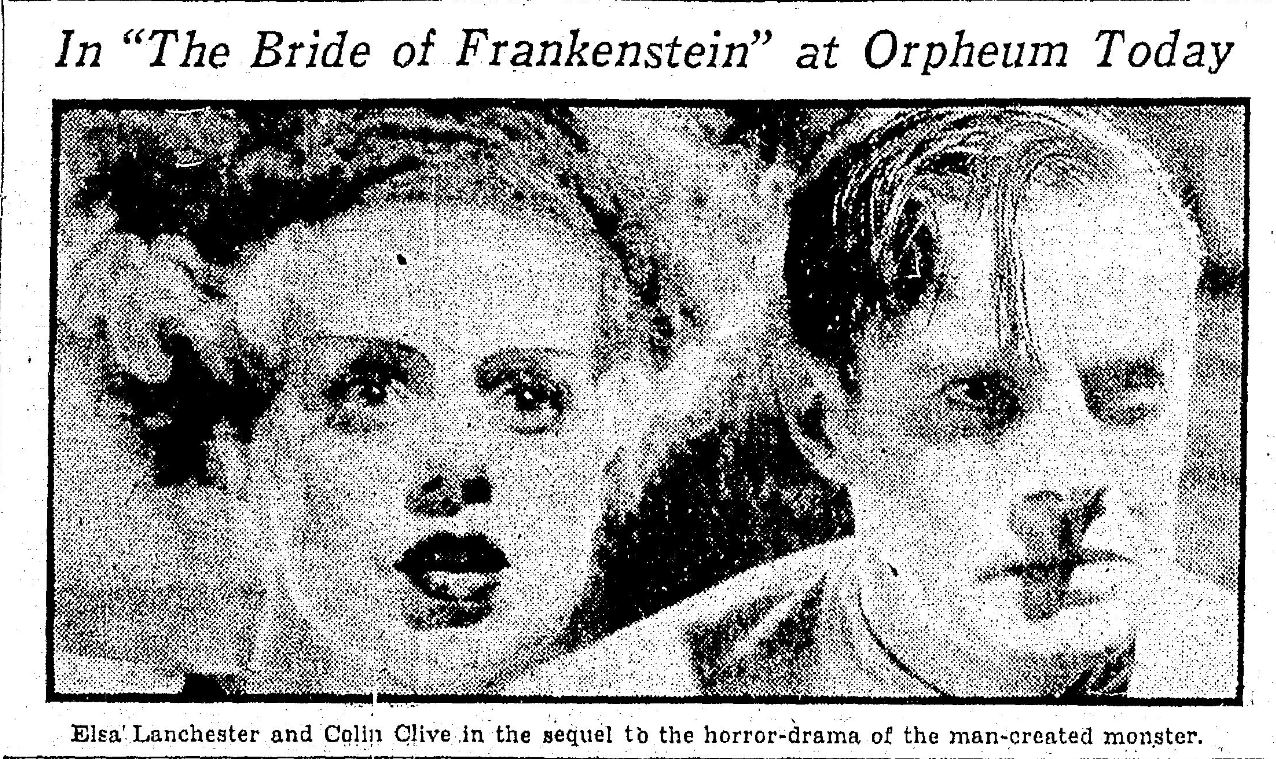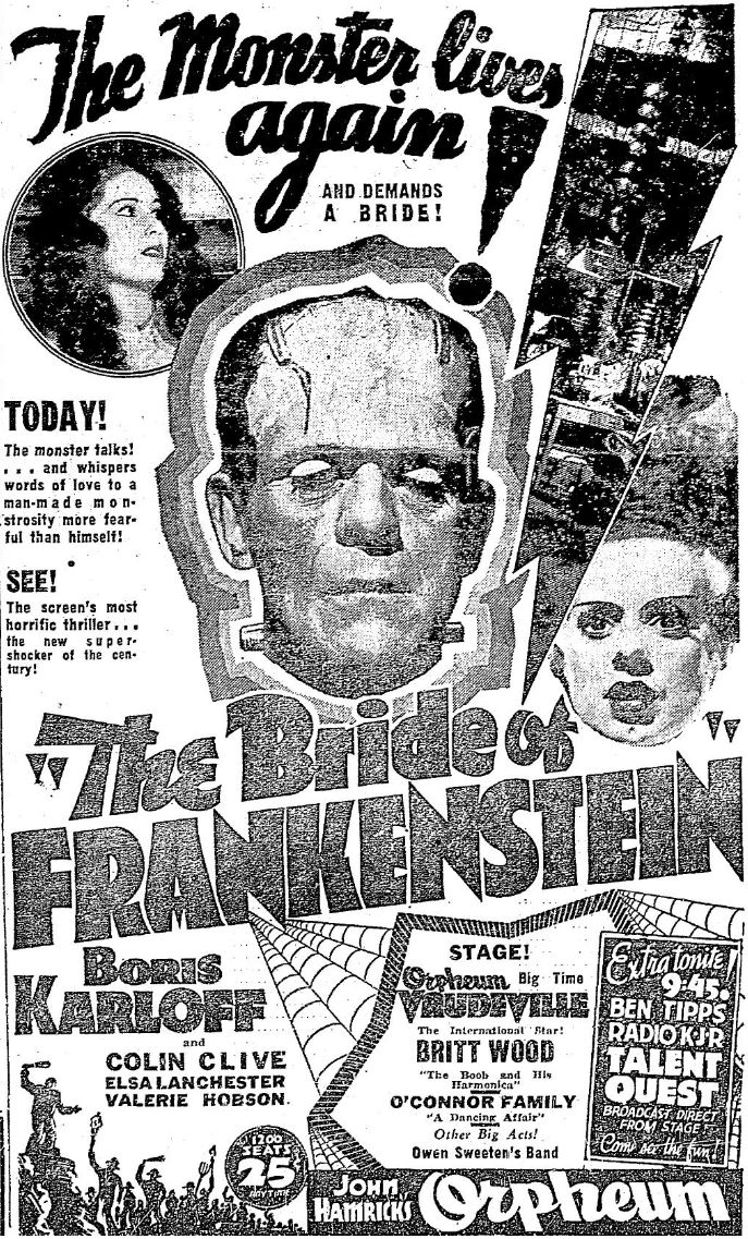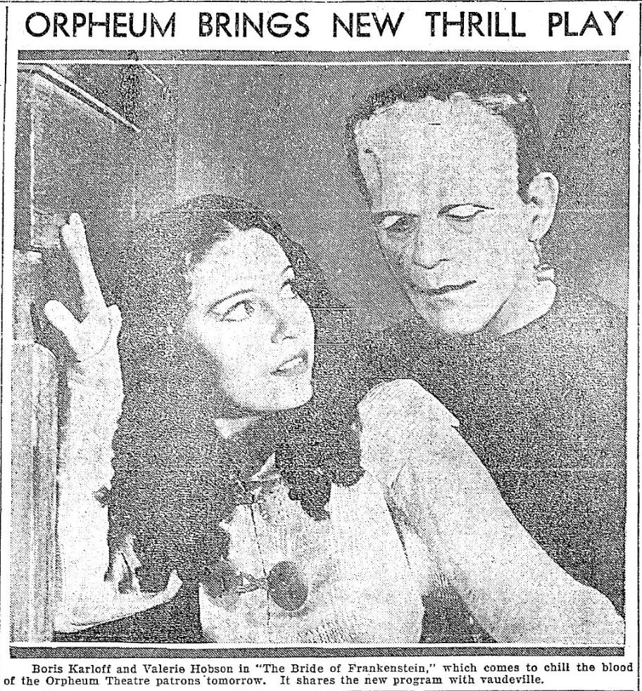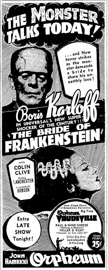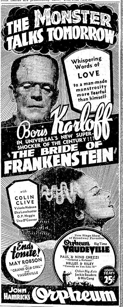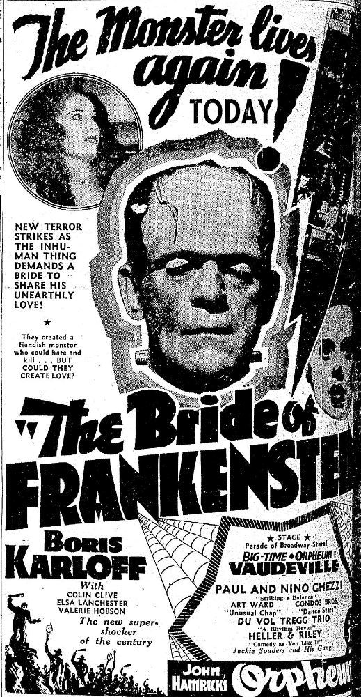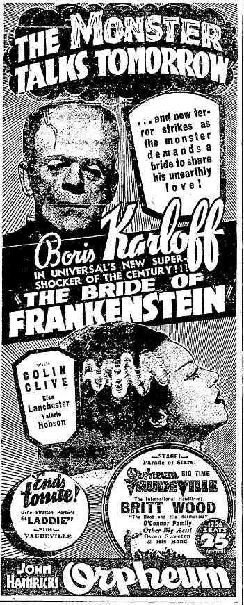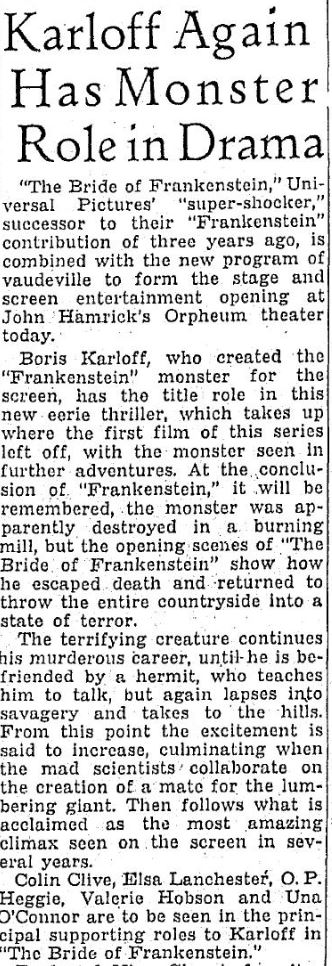 Below you will find a collection of print media from the initial runs of "Bride of Frankenstein" in the Pacific Northwest. This is the first time I noticed simultaneous Seattle and Portland releases. While the ads are similar or the same it's cool to see the different vaudeville acts in each city.