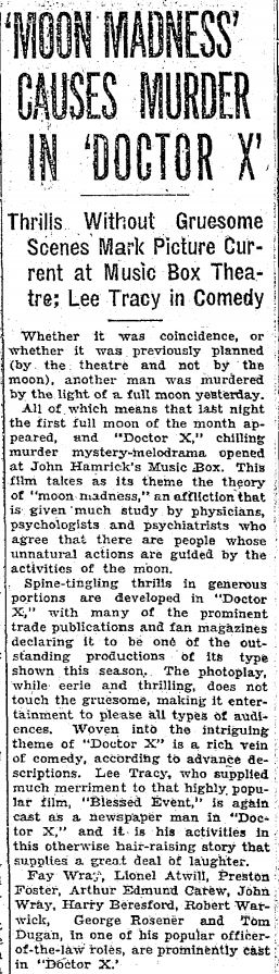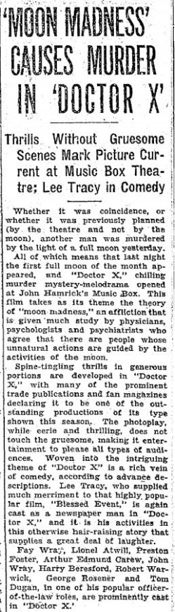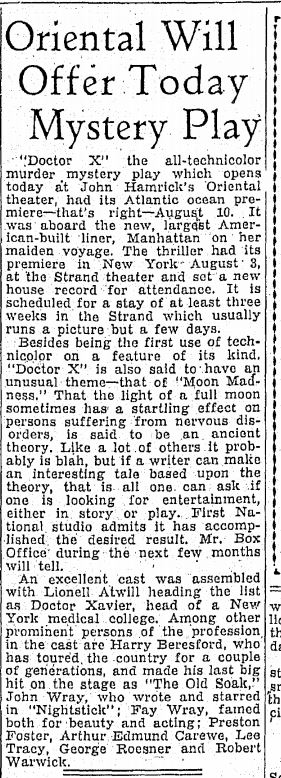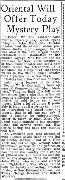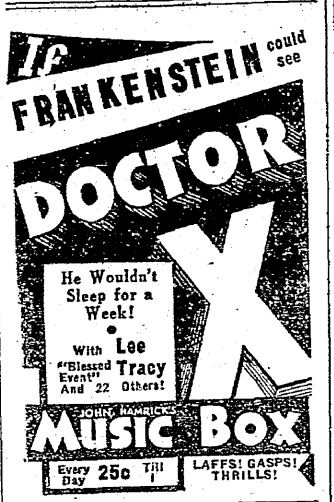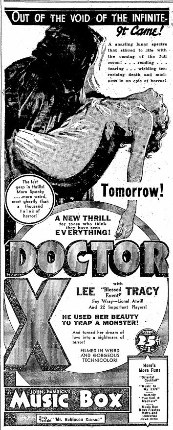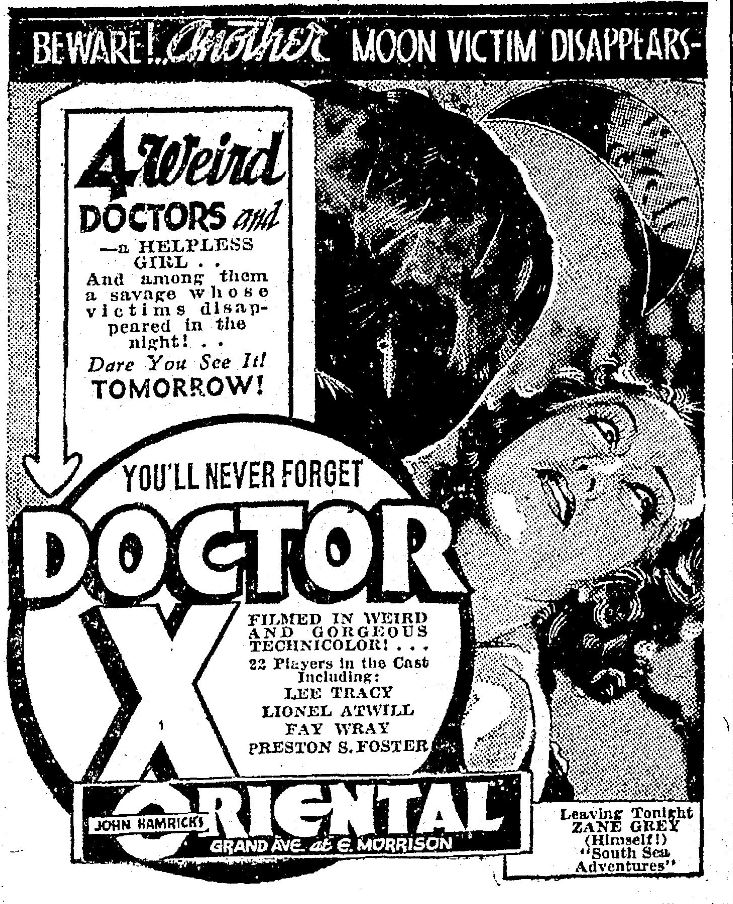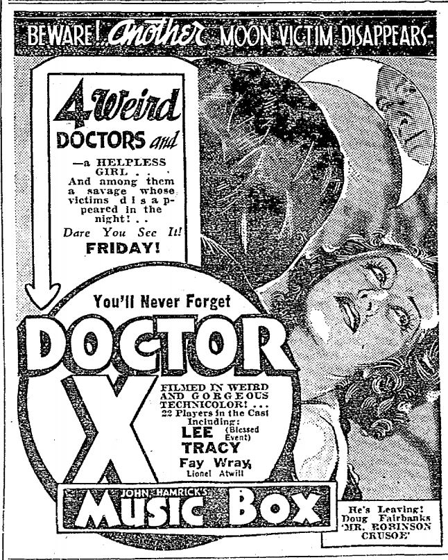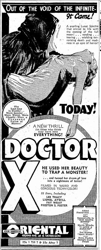 Doctor X is another classic most famous for being the first color horror film. This played Portland first, then moved up the coast to Seattle.