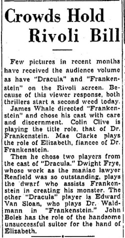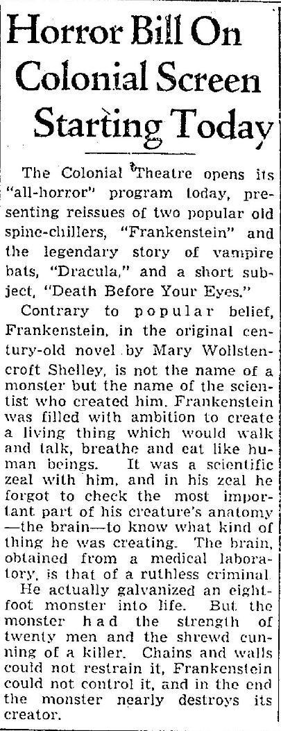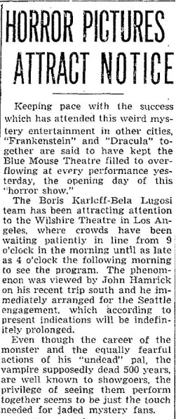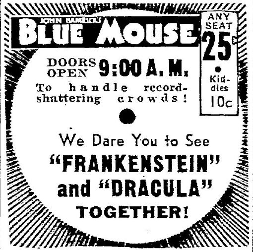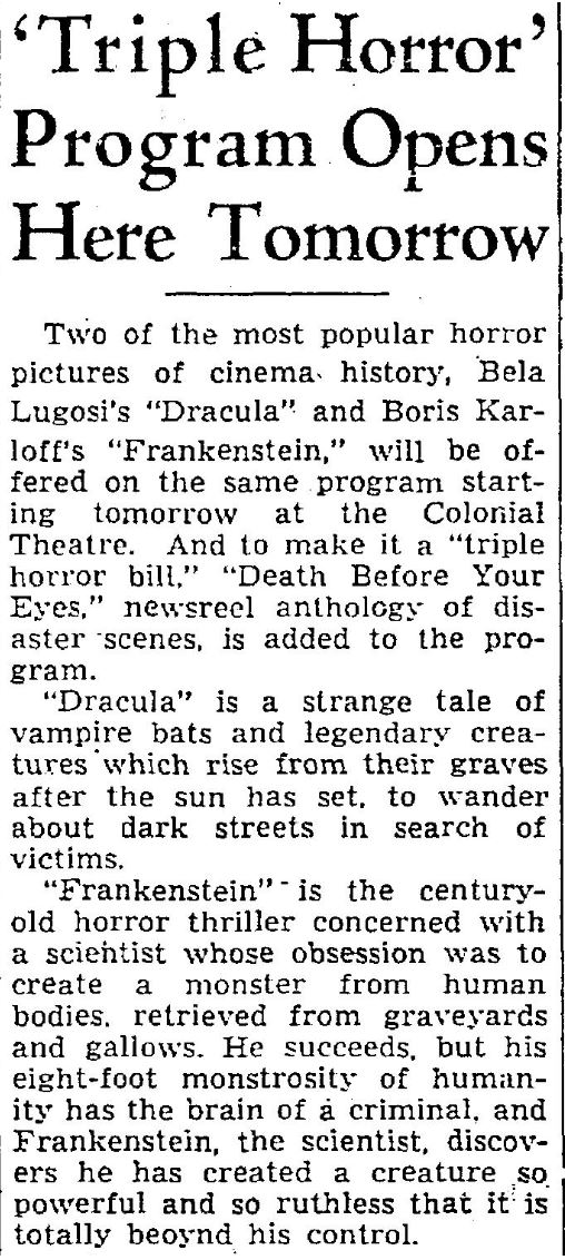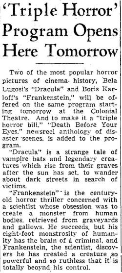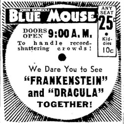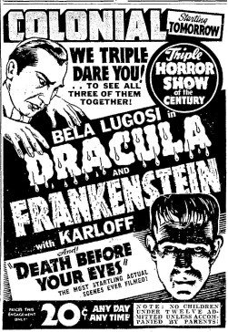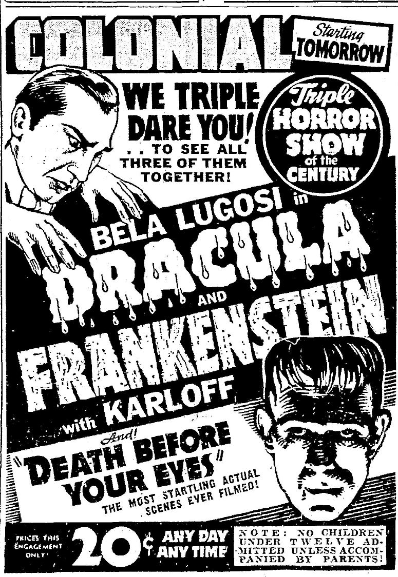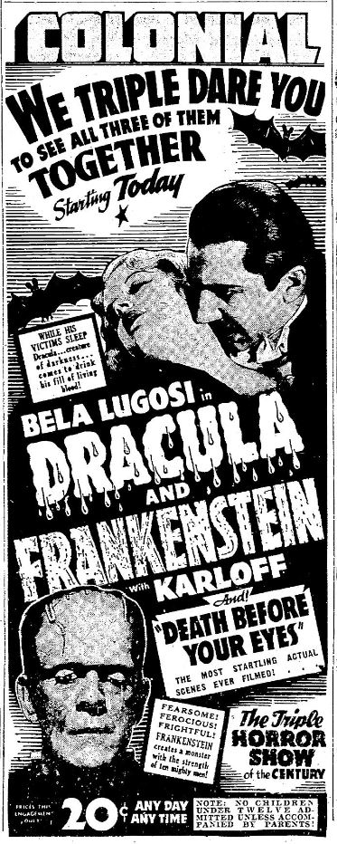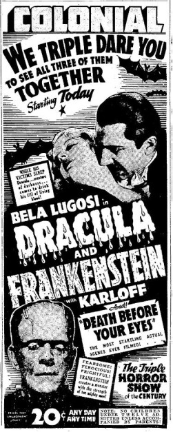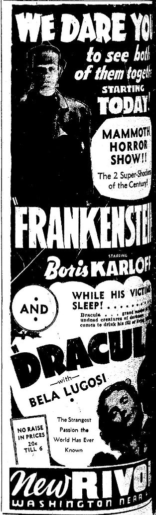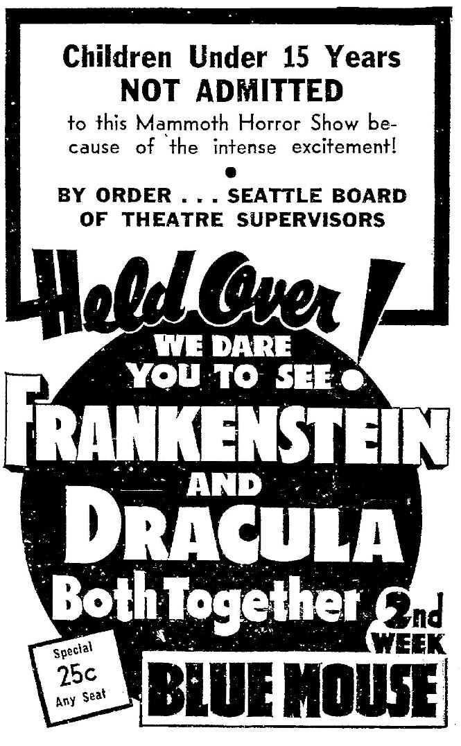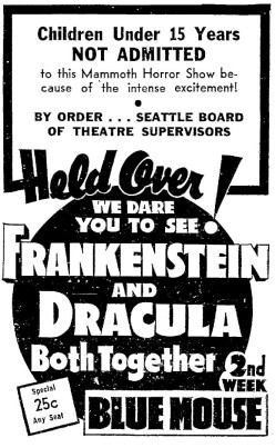 Universal quickly moved the double-bill to a theater which paid by percentage as opposed to a straight rental. They then sent the double-bill up the coast to Seattle where it proved that this wasn't a fluke and then sent it all over the country. It even came back for another Seattle run at the Colonial with an added feature of "Death Before Your Eyes." For more detail on this saga, see the excellent Greenbriar Picture Shows article.