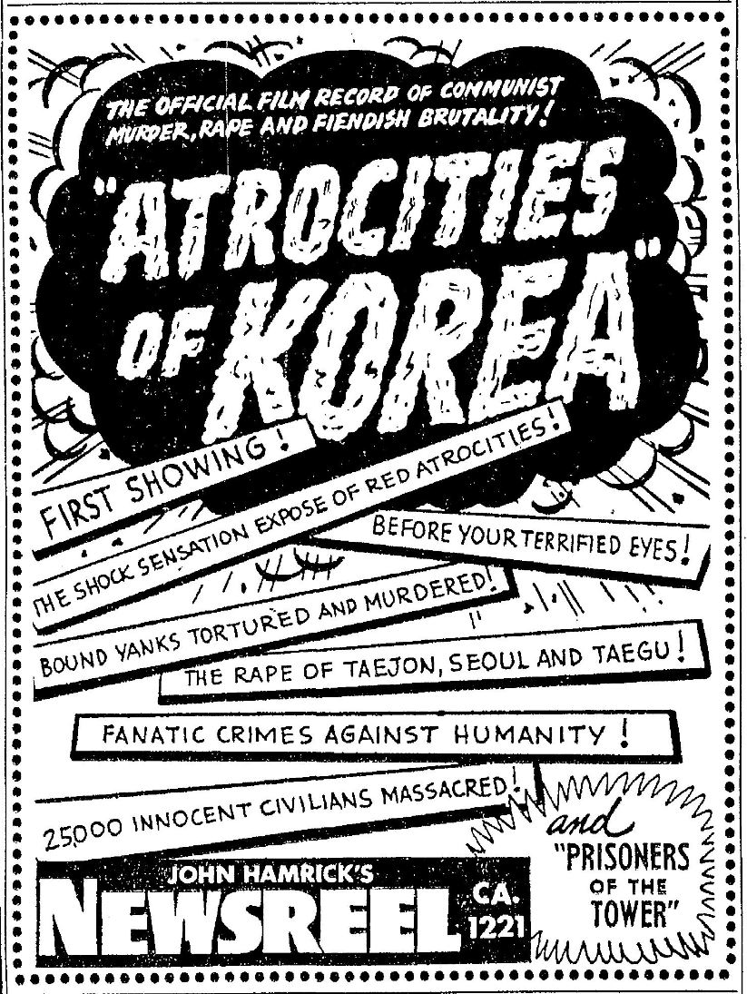 Before TV some cities had theaters that would show nothing but newsreels so people could visually catch up on world events. As I can't find any information on either of the titles depicted in the following advertisement I have to assume that is the case here. Note the lurid and disturbing depictions of the things people could expect to see. Who knows what was actually in these films?