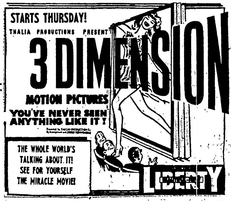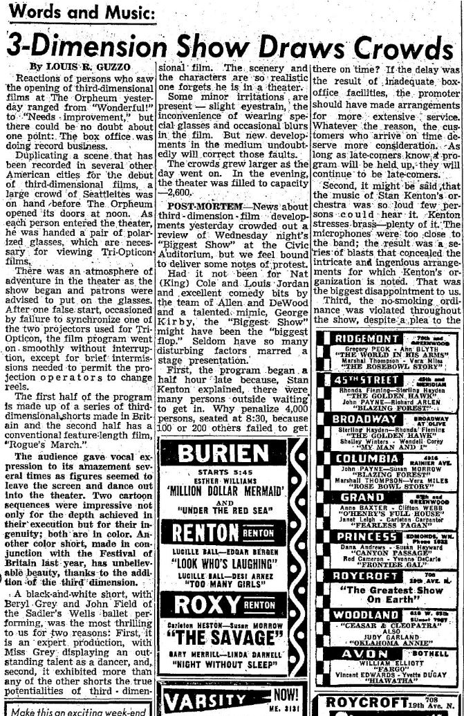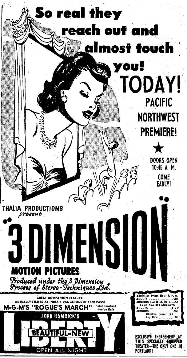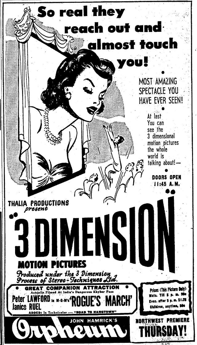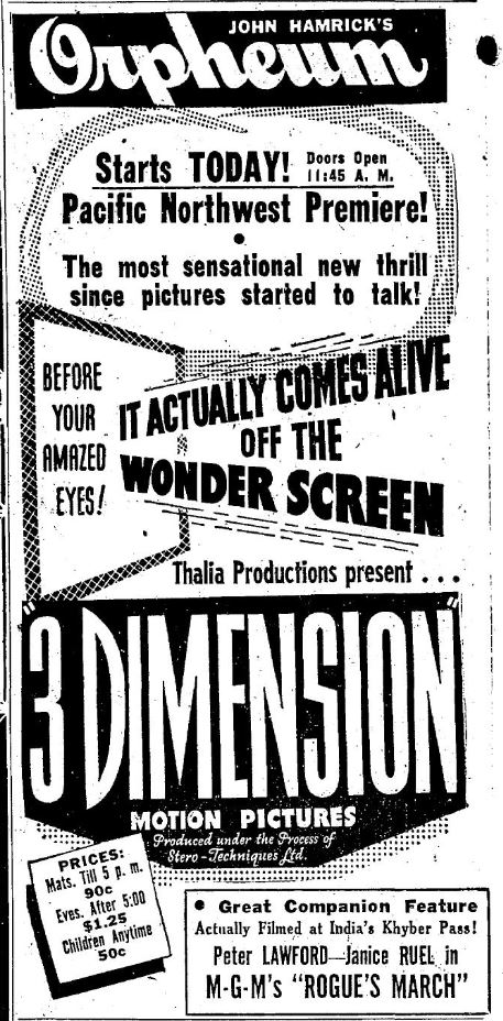 While 3D was introduced by Arch Obeler in late 1952 with "Bwana Devil" it didn't really break wide until 1953. The Pacific Northwest's first taste of the third dimension on the big screen was a program called simply "3 Dimension" released by Thalia Productions. I can't find anything about this other than Lou Guzzo's article from the Seattle Times which indicates it's a compilation of 3D shorts.