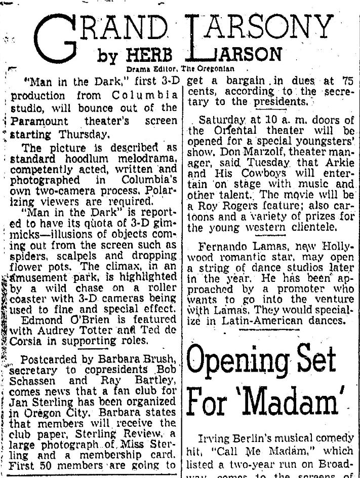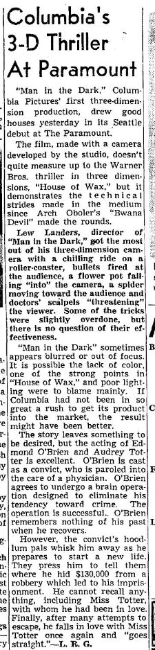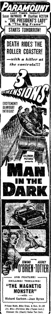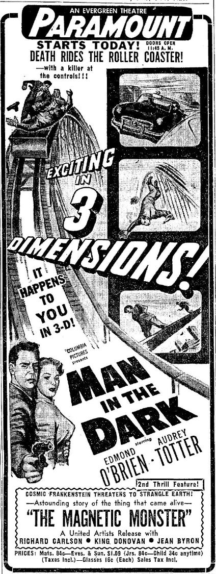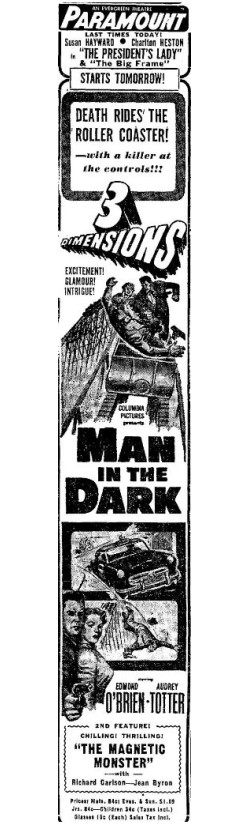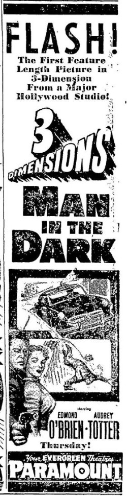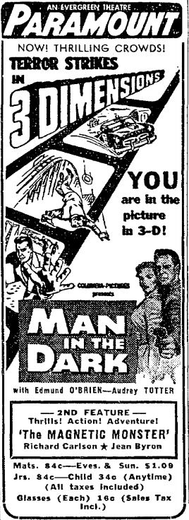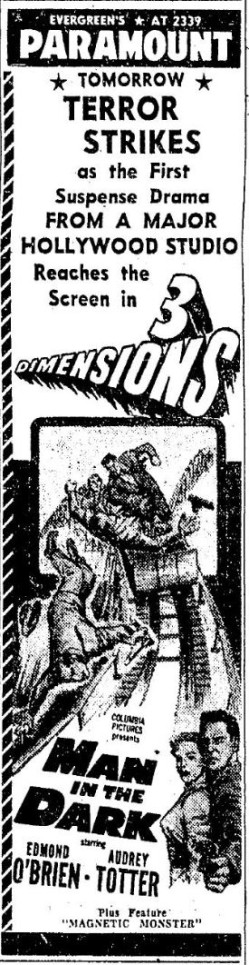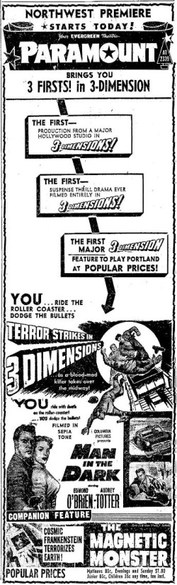 3D mania continues! "Man in the Dark" was released two days before "House of Wax," making it the first 3D feature from a major studio. Arch Obeler's "Bwana Devil" was still first.