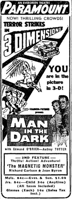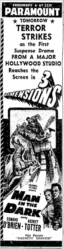 The following is a collection of print media from the initial runs of 1953's "Man in the Dark" in the Pacific Northwest. It played both Seattle and Portland with 1953's sci-fi classic "The Magnetic Monster."