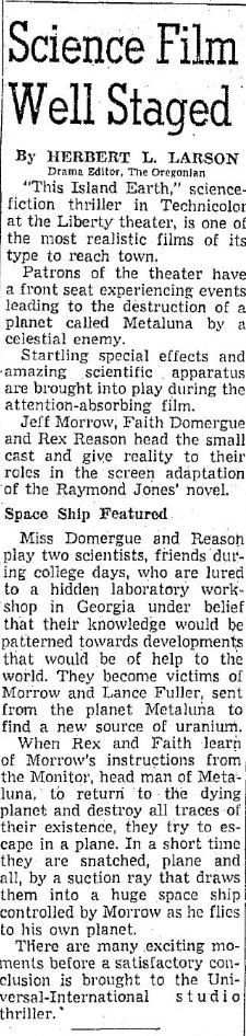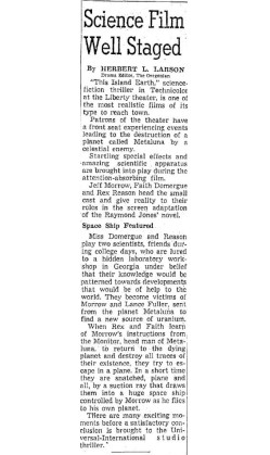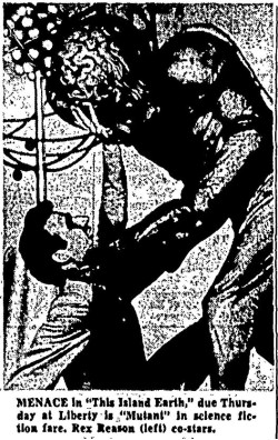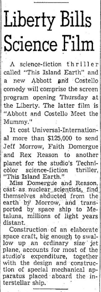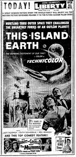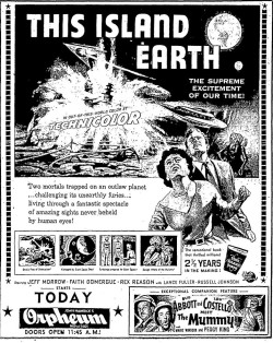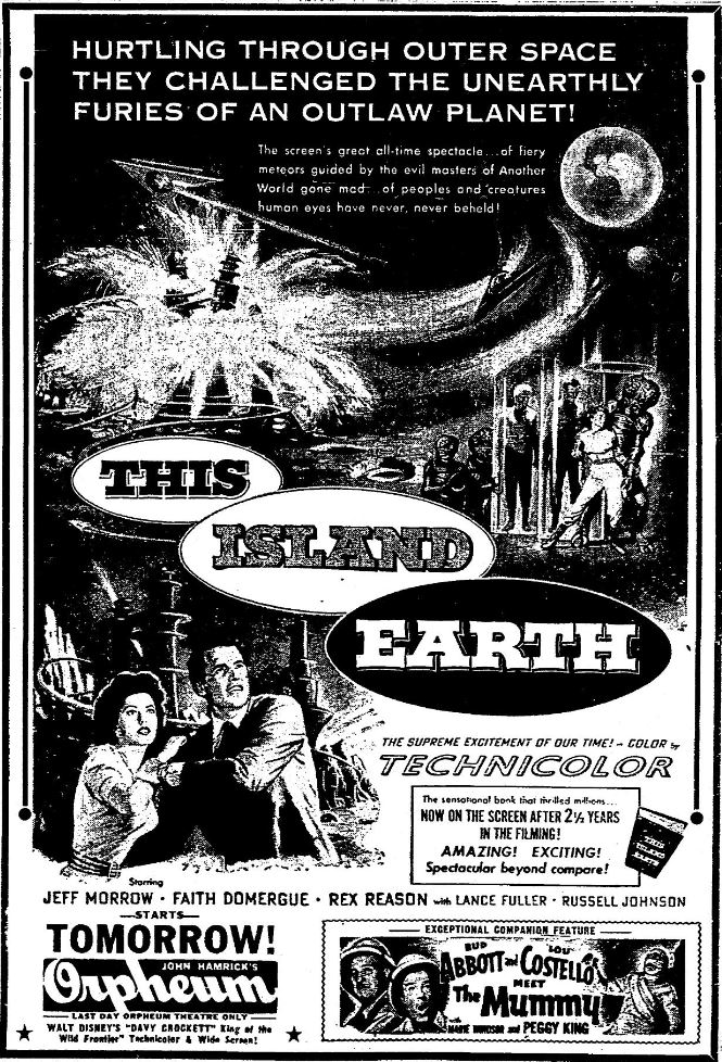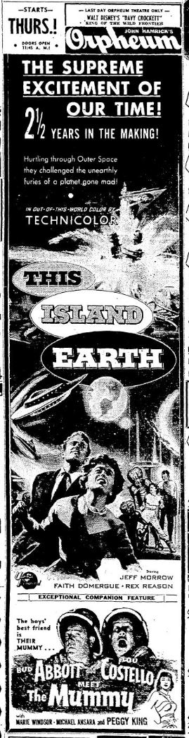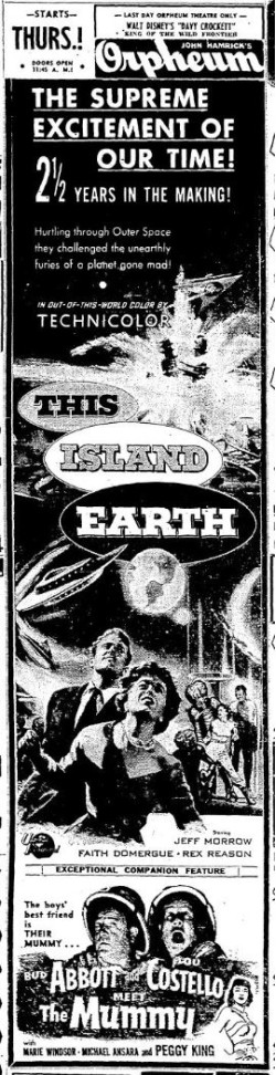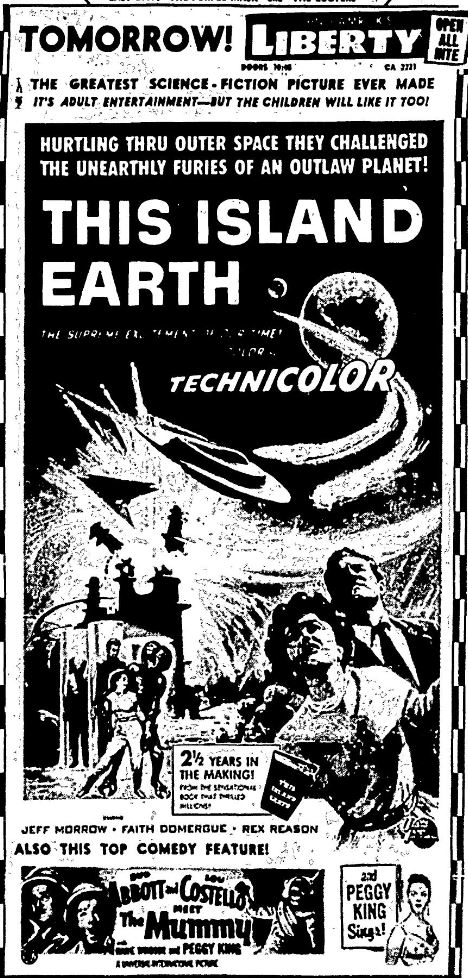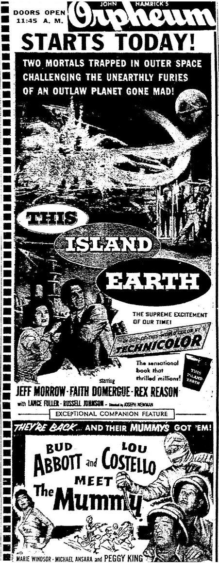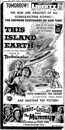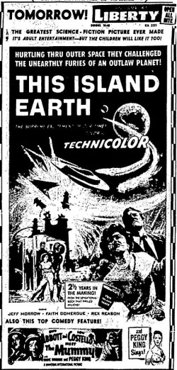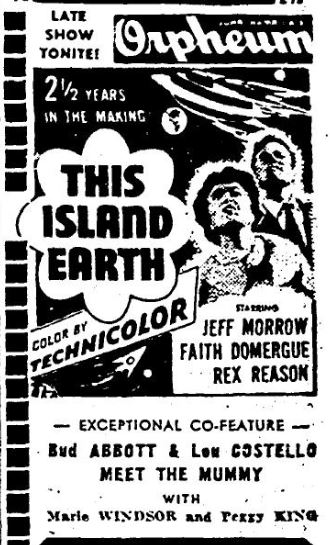 The following is a collection of print media from the initial runs of 1955's "This Island Earth" in the Pacific Northwest. "Abbott and Costello Meet the Mummy " was the second movie at both locations.