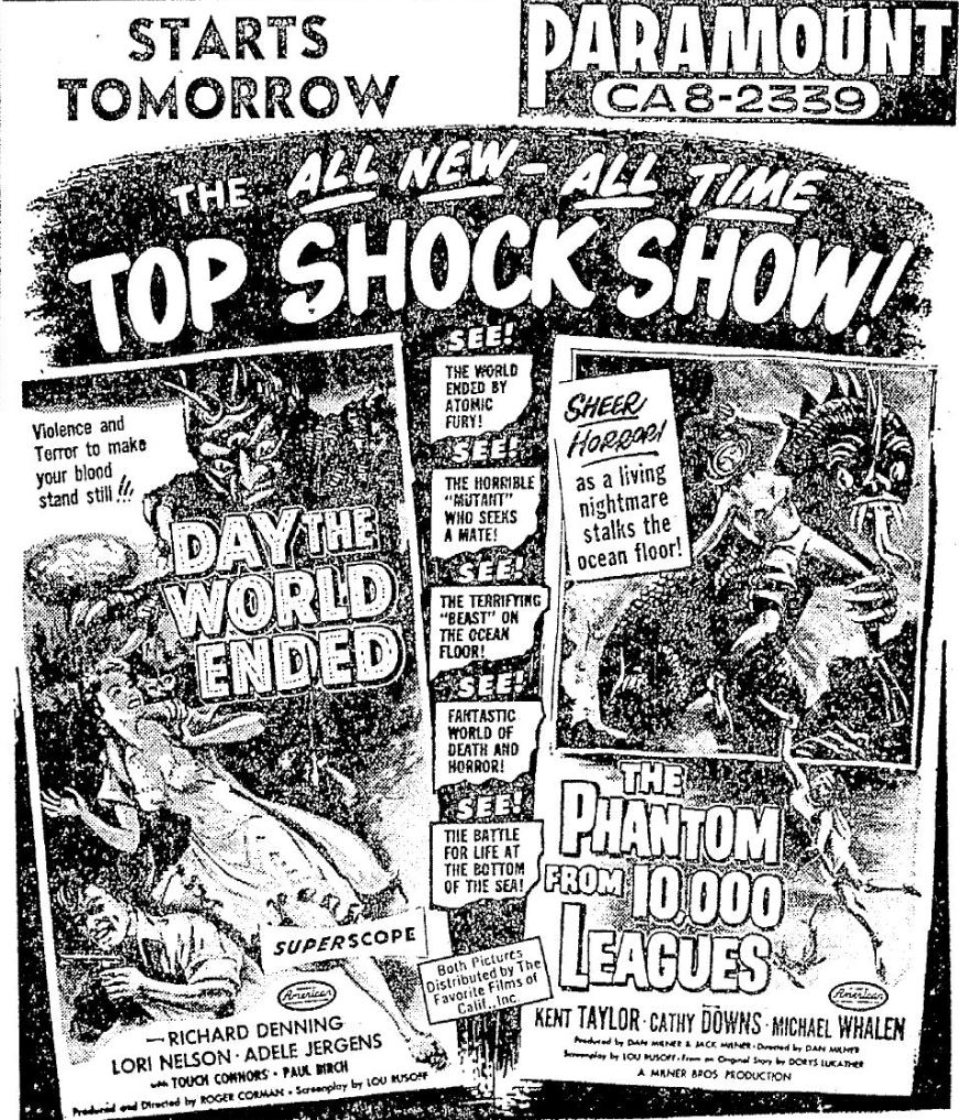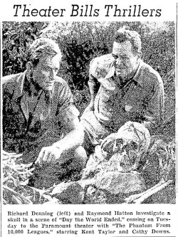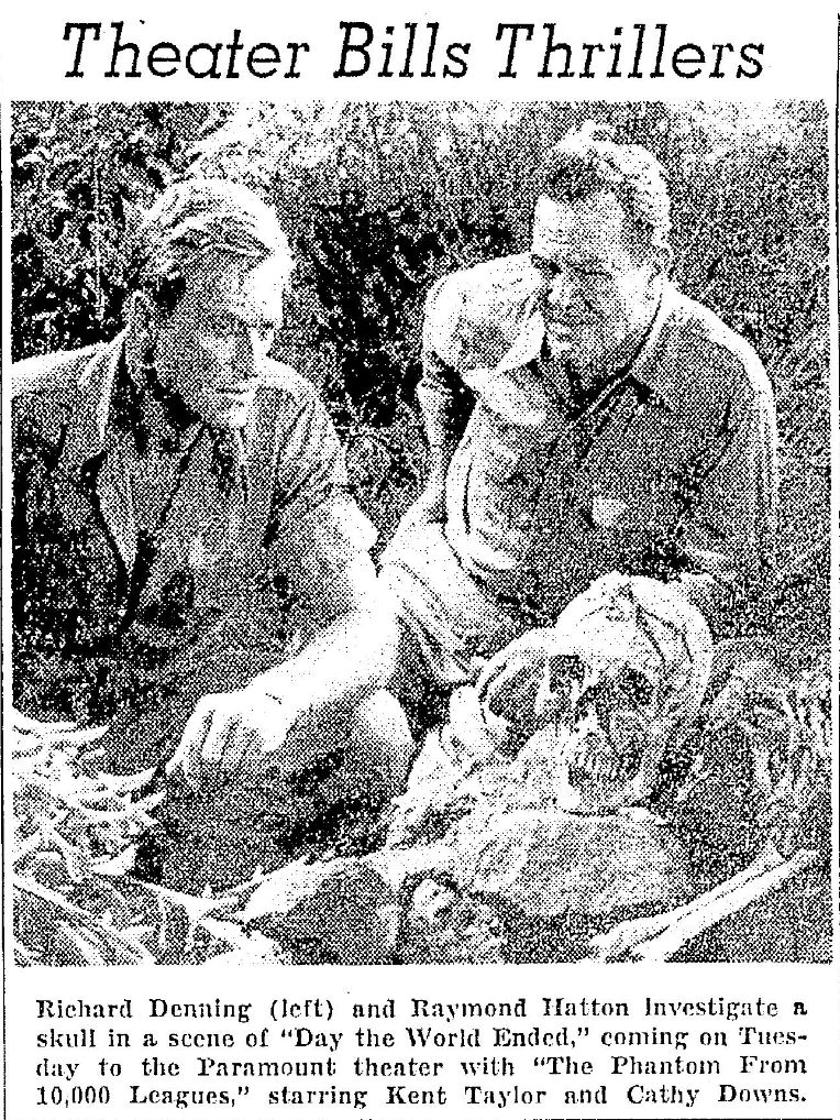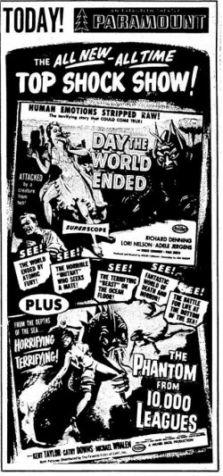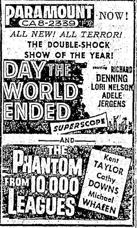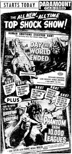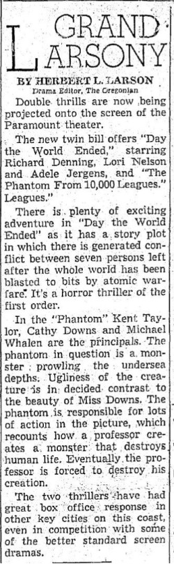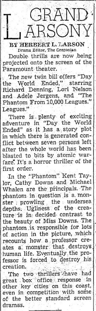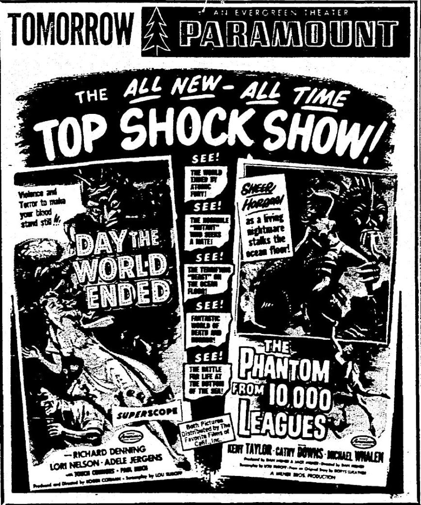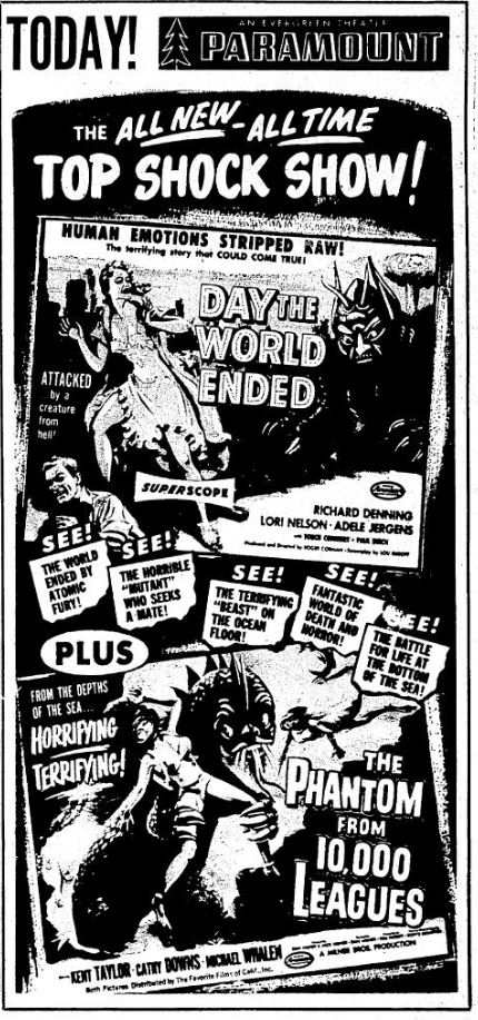 The following is a collection of print media from the initial runs of 1955's "Day the World Ended" in the Pacific Northwest. "The Phantom from 10,000 Leagues" was the second movie in both Portland and Seattle.