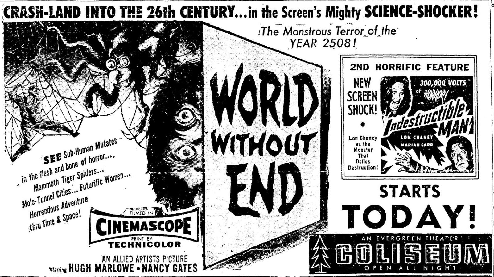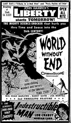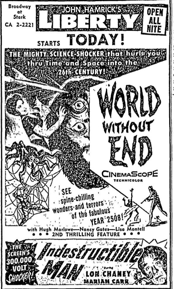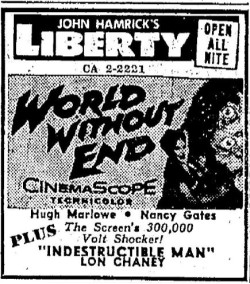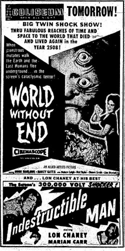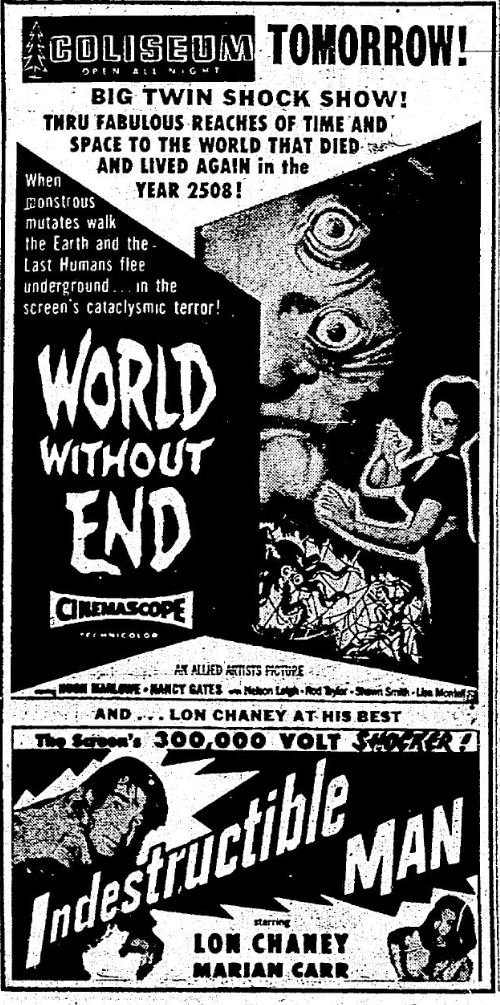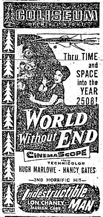 The following is a collection of print media from the initial runs of 1956's "World Without End" in the Pacific Northwest. "Indestructible Man" was the second movie in both Portland and Seattle.