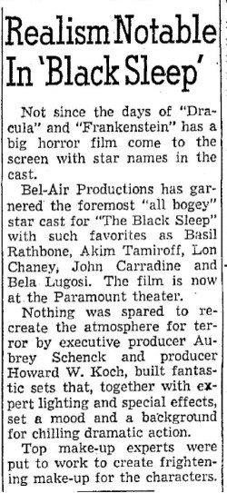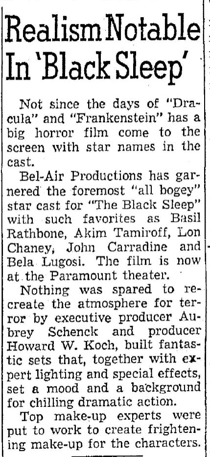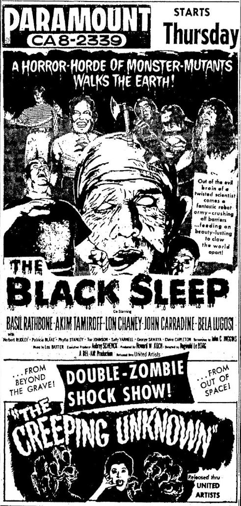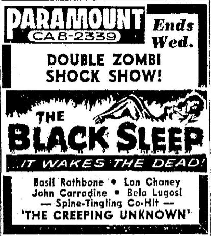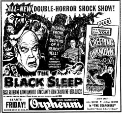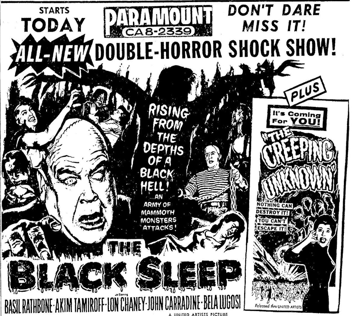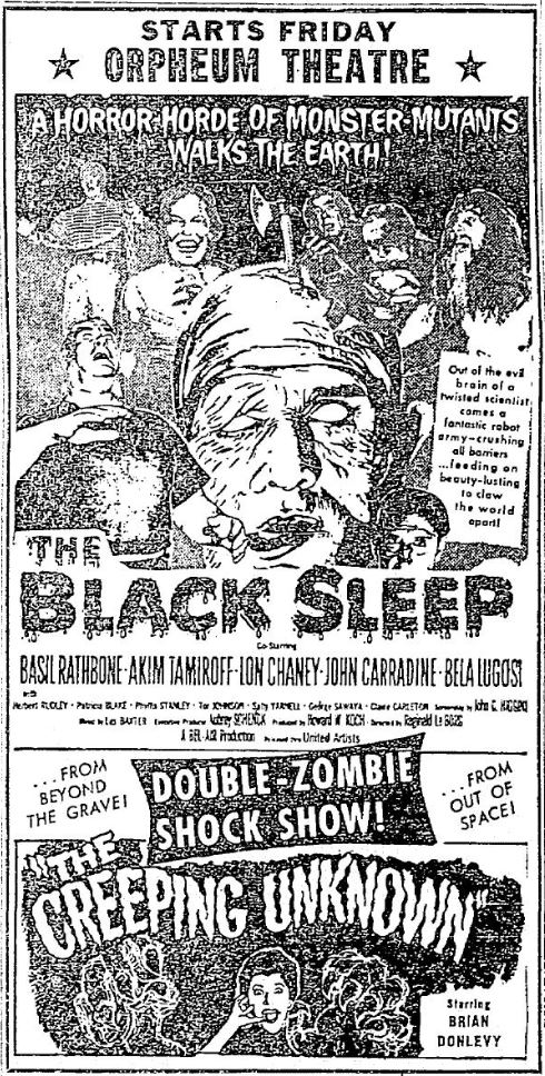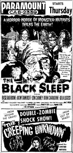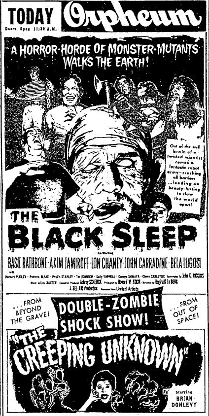 The following is a collection of print media from the initial runs of 1956's "The Black Sleep" in the Pacific Northwest. "The Creeping Unknown" was the second movie in both Portland and Seattle.