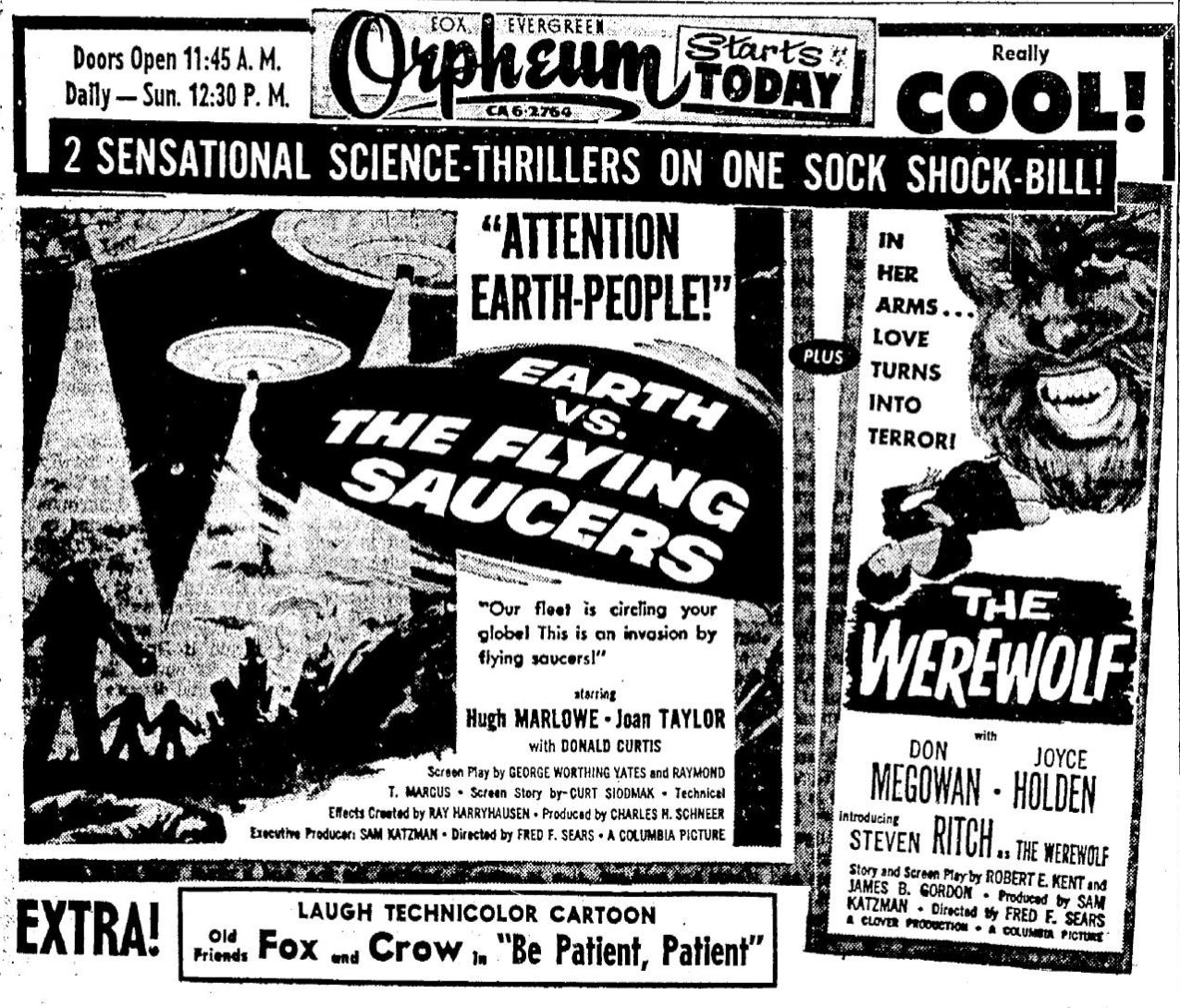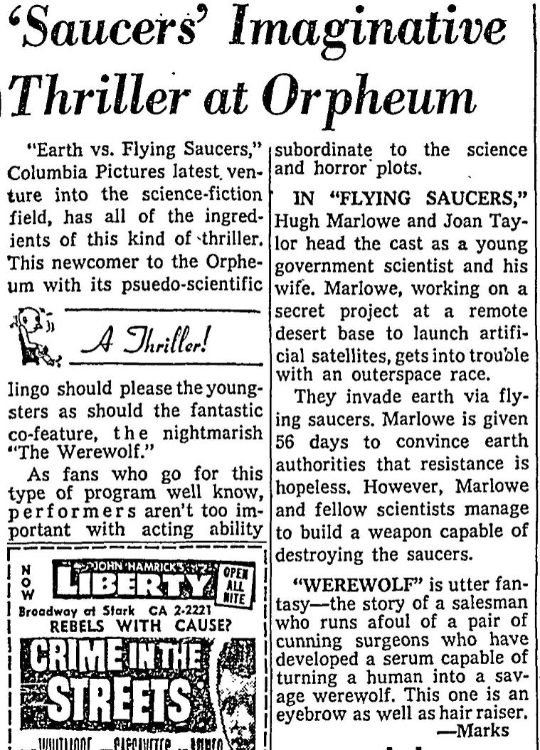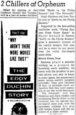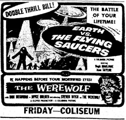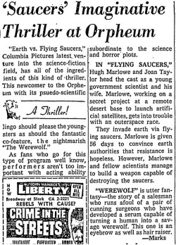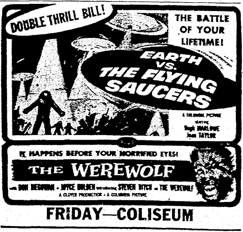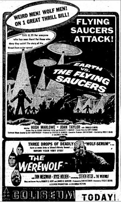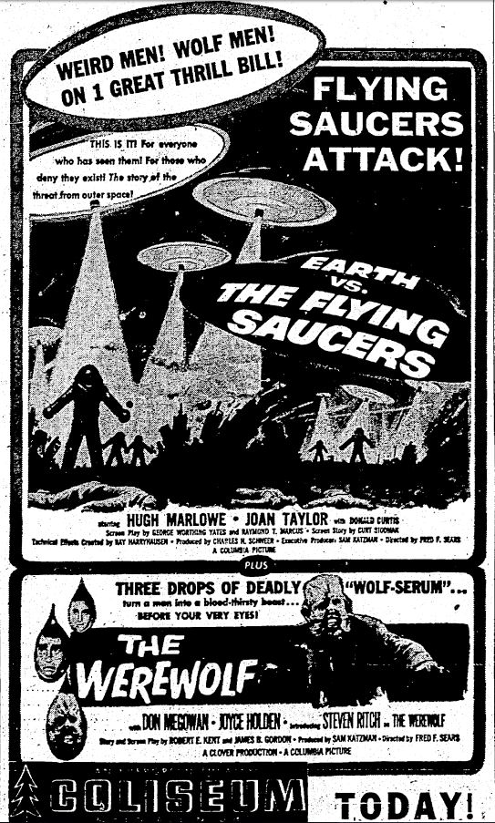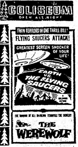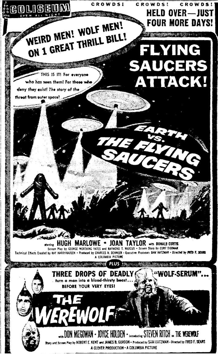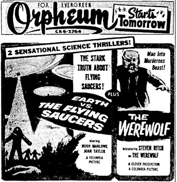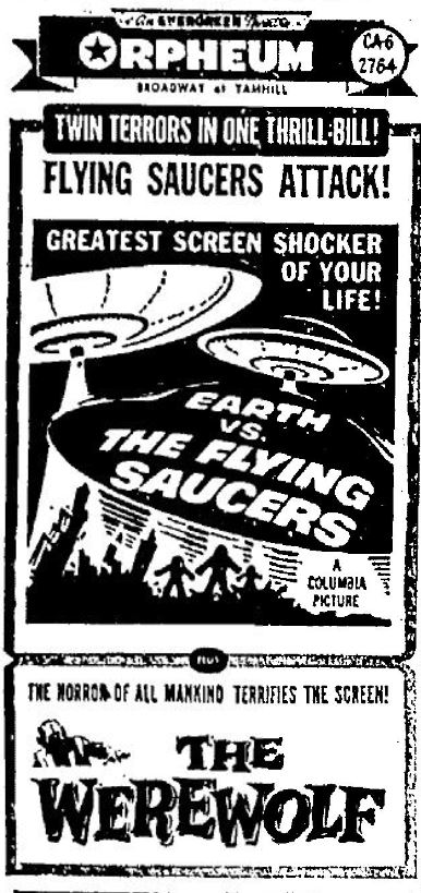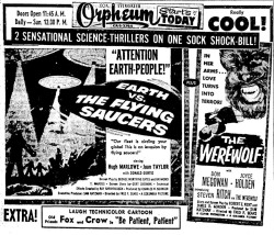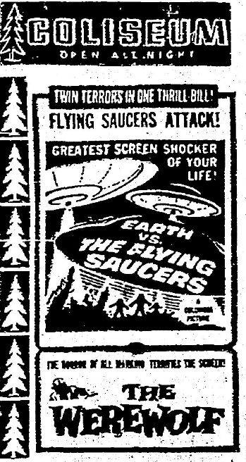 The following is a collection of print media from the initial runs of 1956's "Earth vs. the Flying Saucers" in the Pacific Northwest. "The Werewolf" was the second movie in both Portland and Seattle.