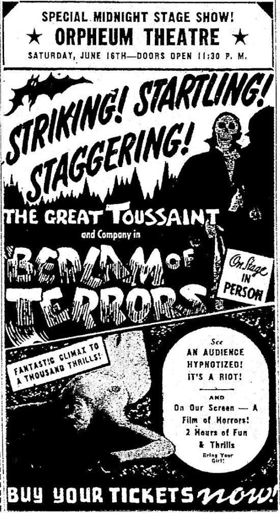 Here's a June 18, 1956 ad for a spook show at the Orpheum in Seattle.