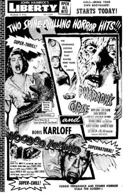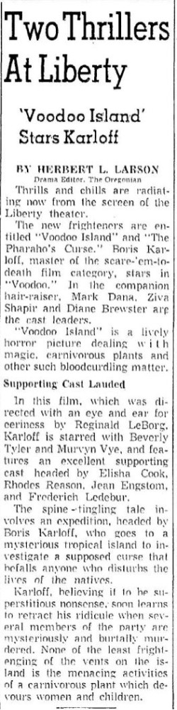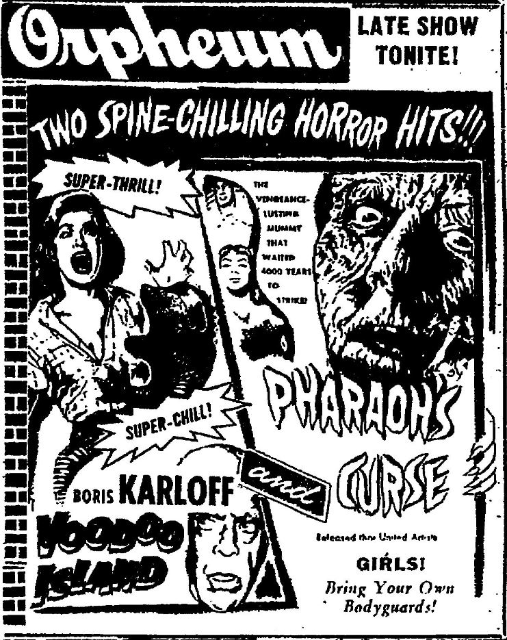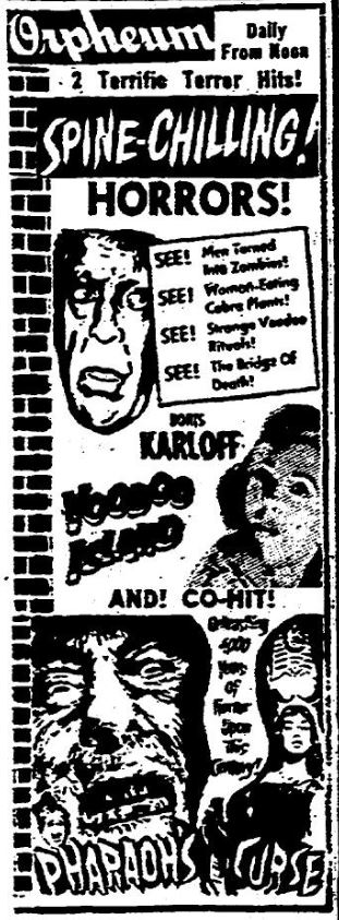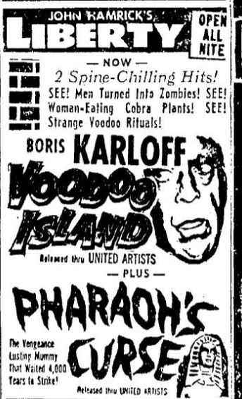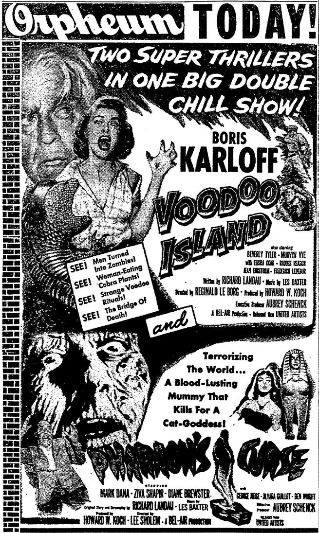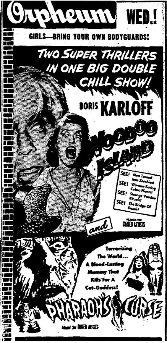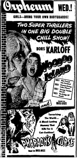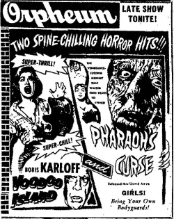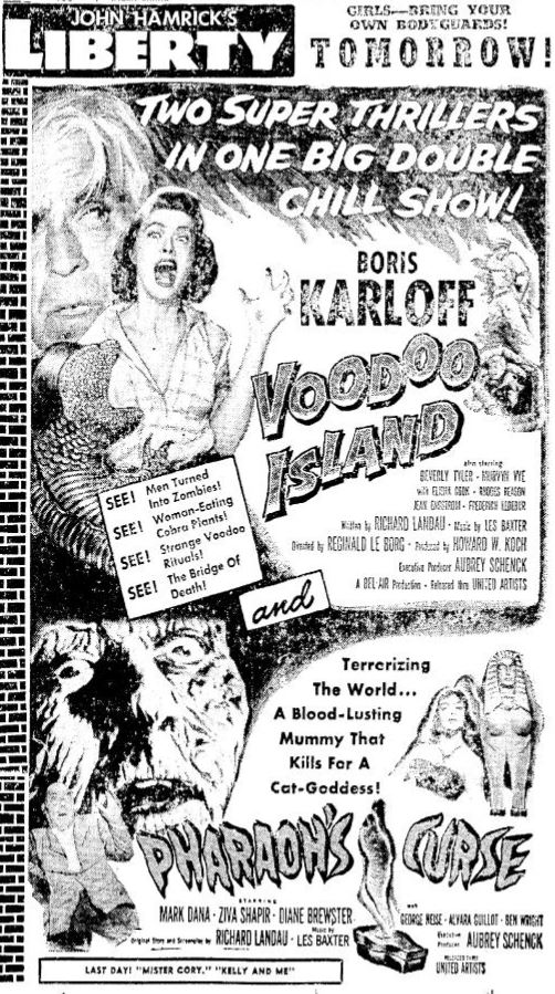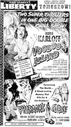 The following is a collection of print media from the initial runs of 1957's "Voodoo Island" in the Pacific Northwest. "Pharoah's Curse" was the second movie in both Portland and Seattle.