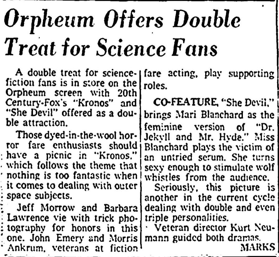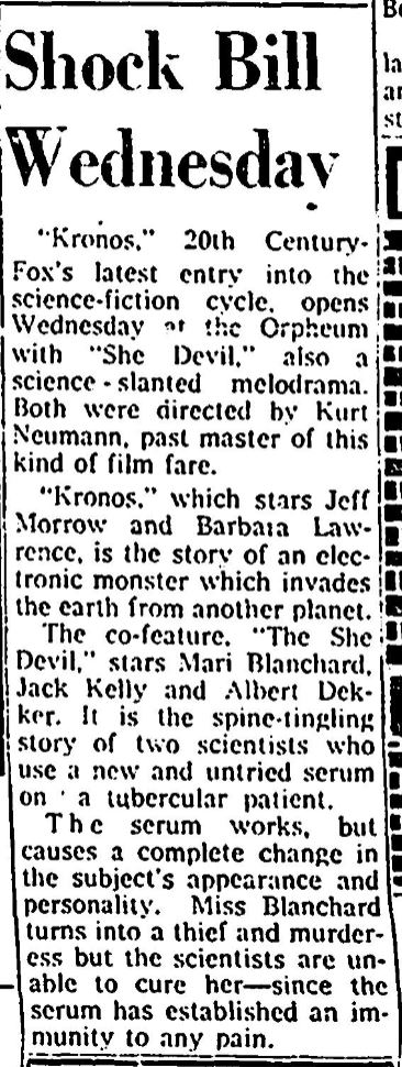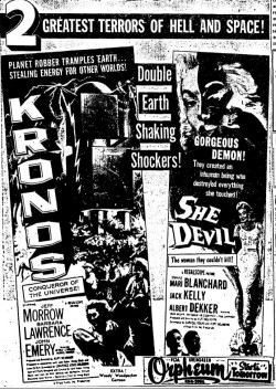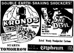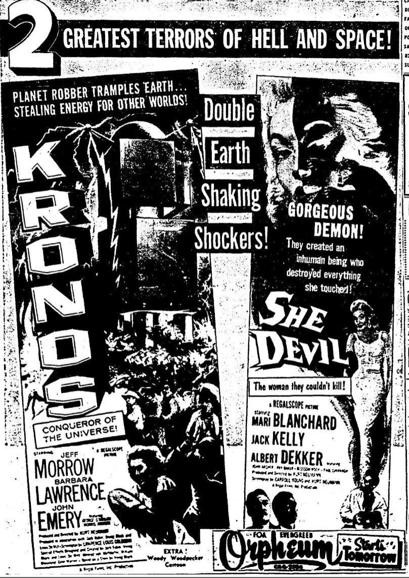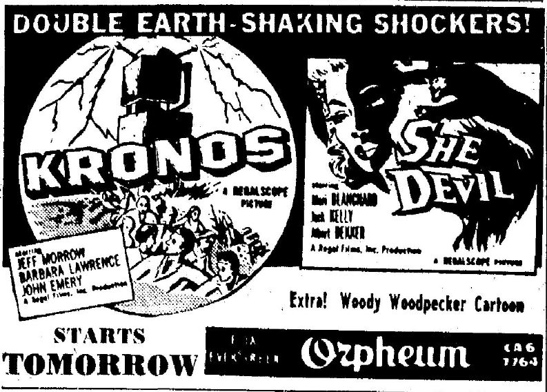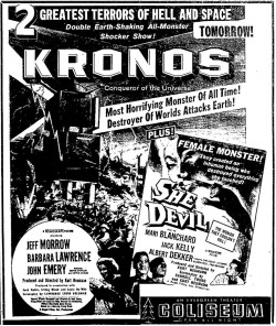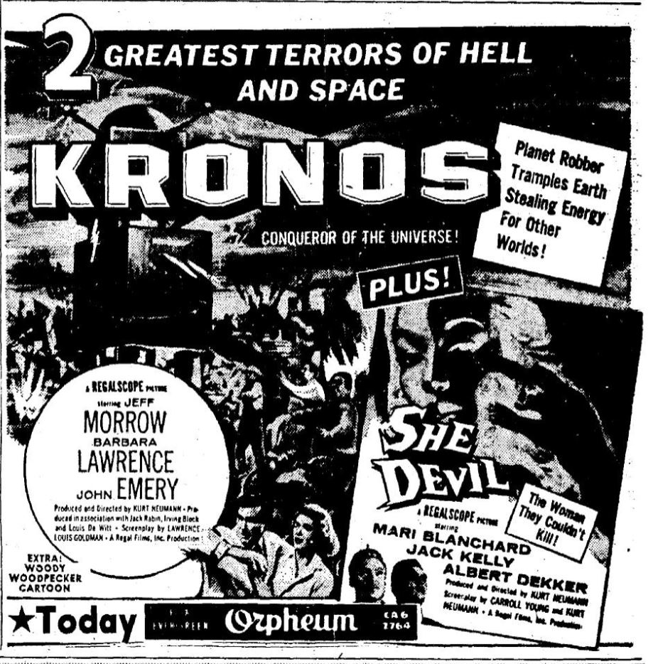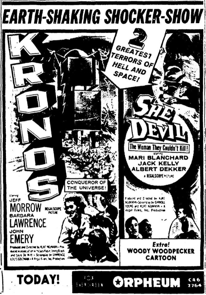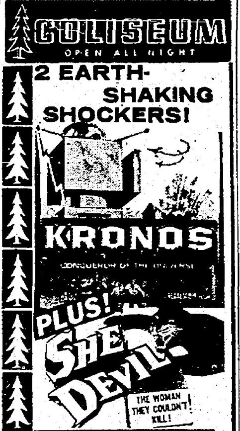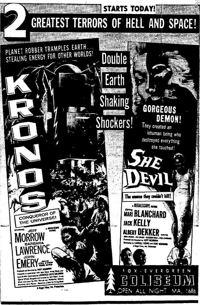 The following is a collection of print media from the initial runs of 1957's "Kronos" in the Pacific Northwest. "She Devil," another Kurt Neumann film, was the second feature in both cities.