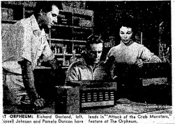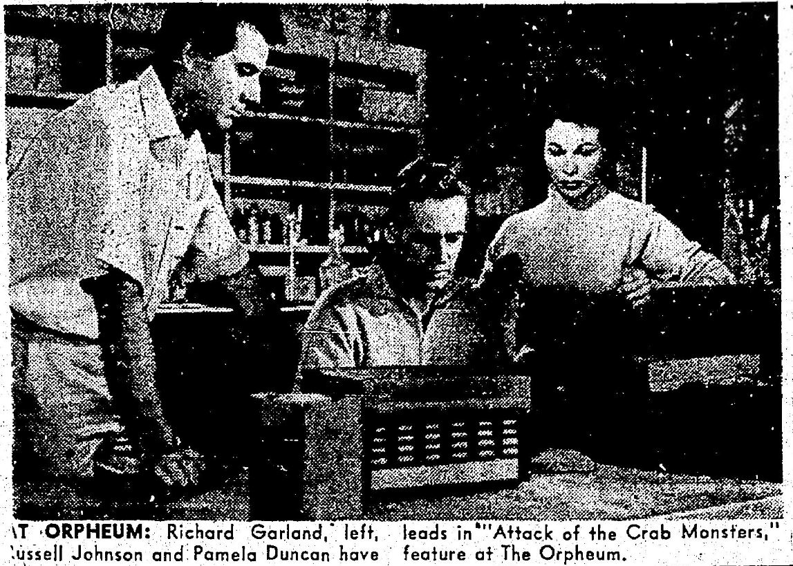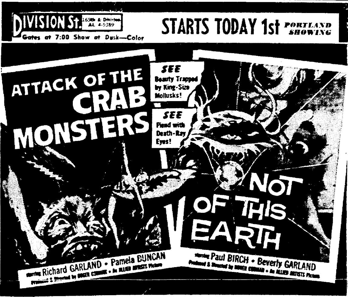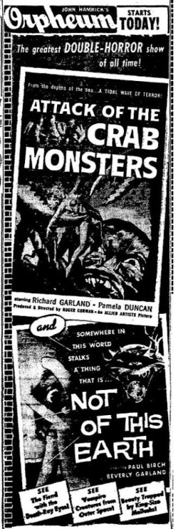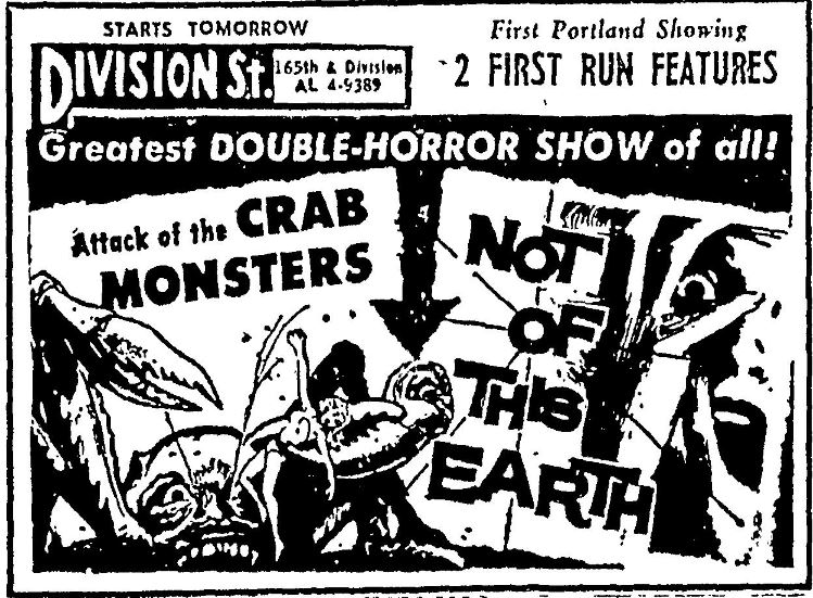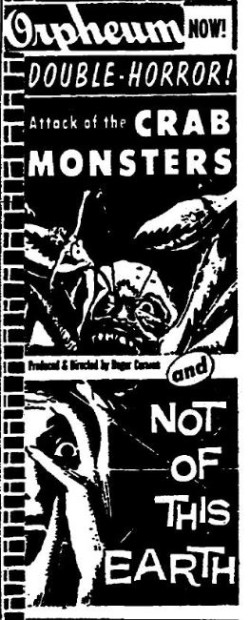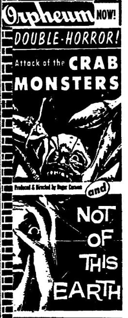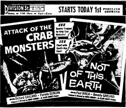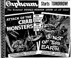 The following is a collection of print media from the initial runs of 1957's "Attack of the Crab Monsters" in the Pacific Northwest. "Not of This Earth," another Roger Corman film, was the second feature in both cities.