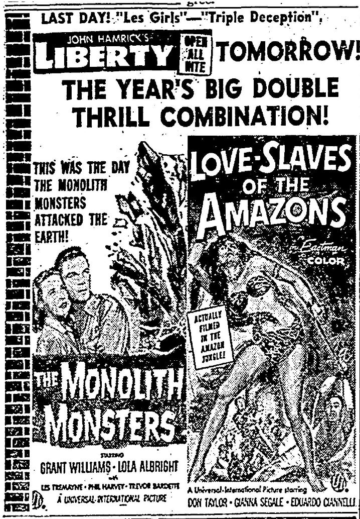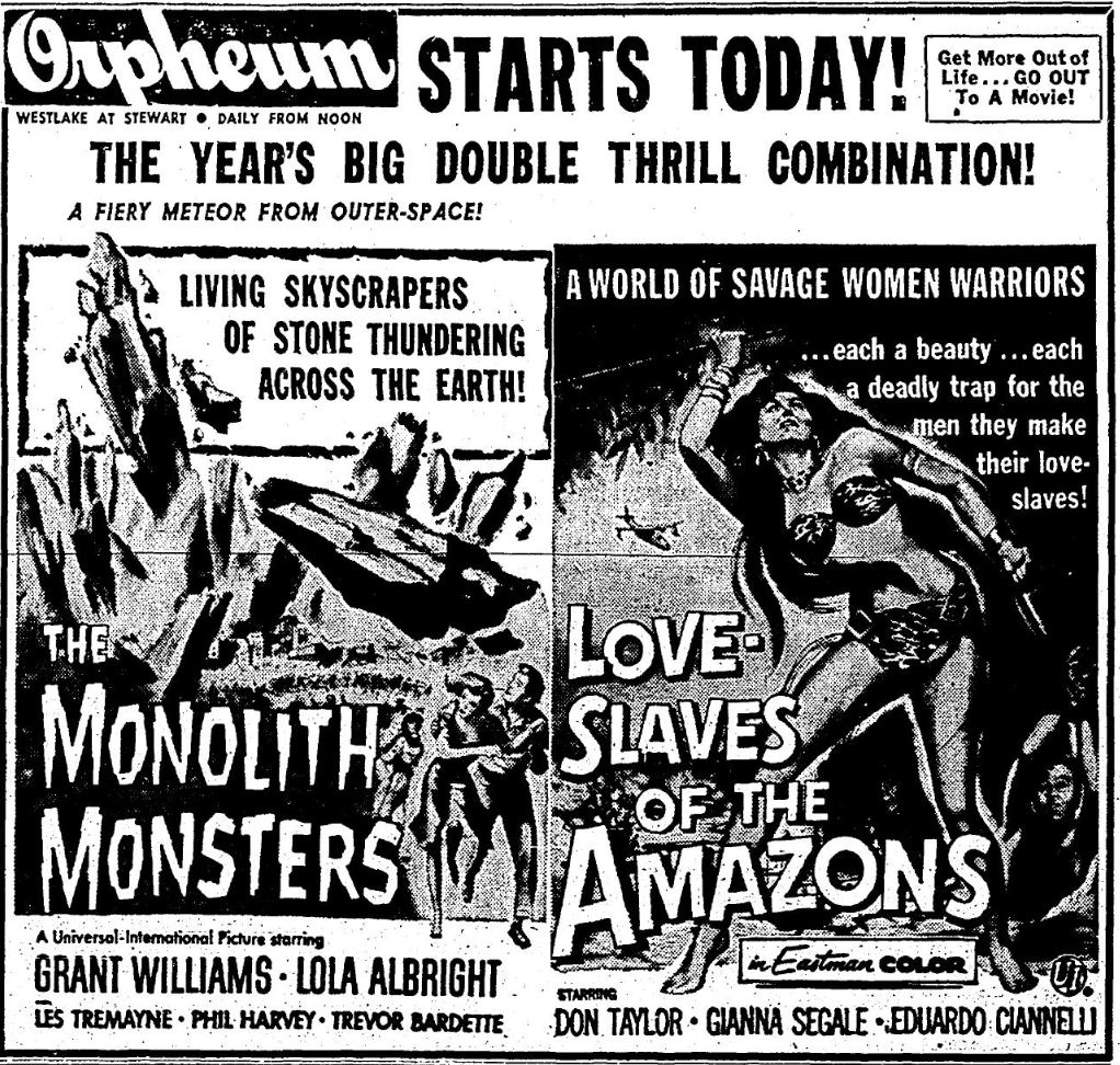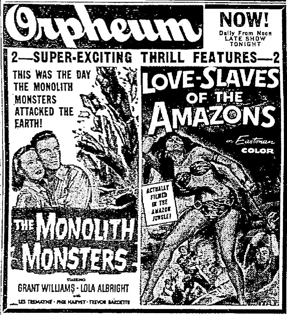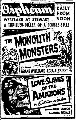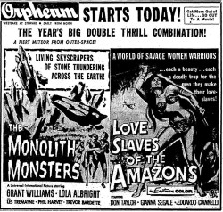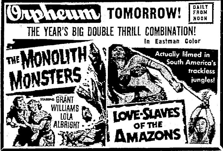 The following is a collection of print media from the initial runs of 1957's "The Monolith Monsters" in the Pacific Northwest. "Love Slaves of the Amazons" was the second feature in both cities.