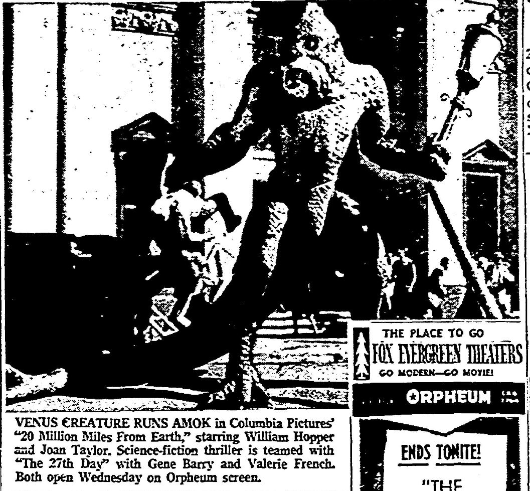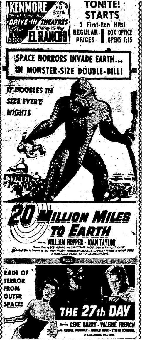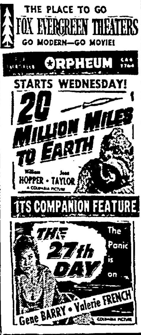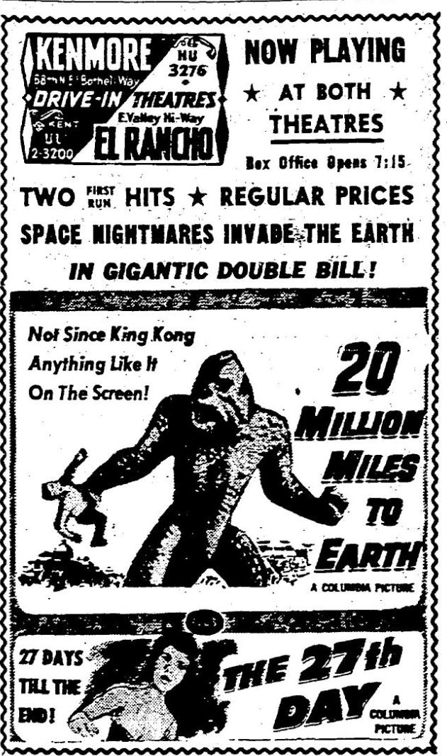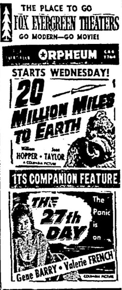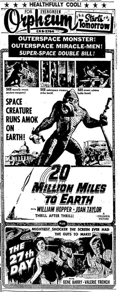The following is a collection of print media from the initial runs of 1957's "20 Million Miles to Earth" in the Pacific Northwest. "The 27th Day" was the second feature in both cities.