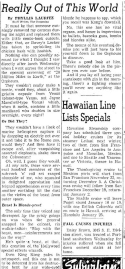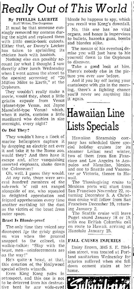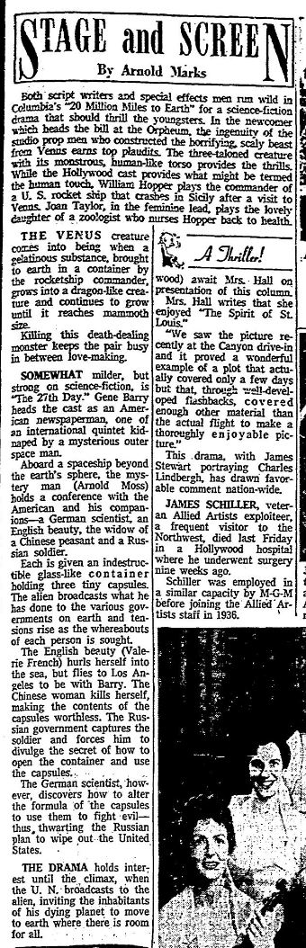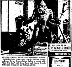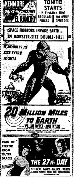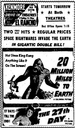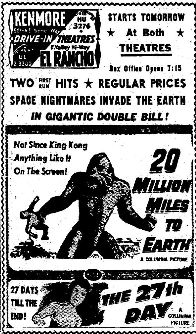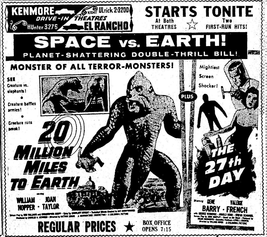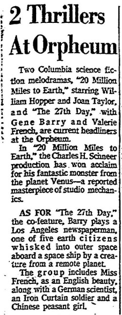 The following is a collection of print media from the initial runs of 1957's "20 Million Miles to Earth" in the Pacific Northwest. "The 27th Day" was the second feature in both cities.