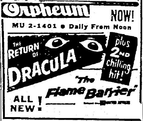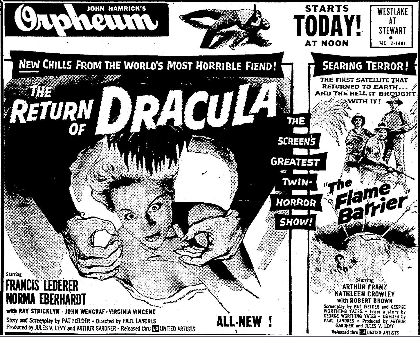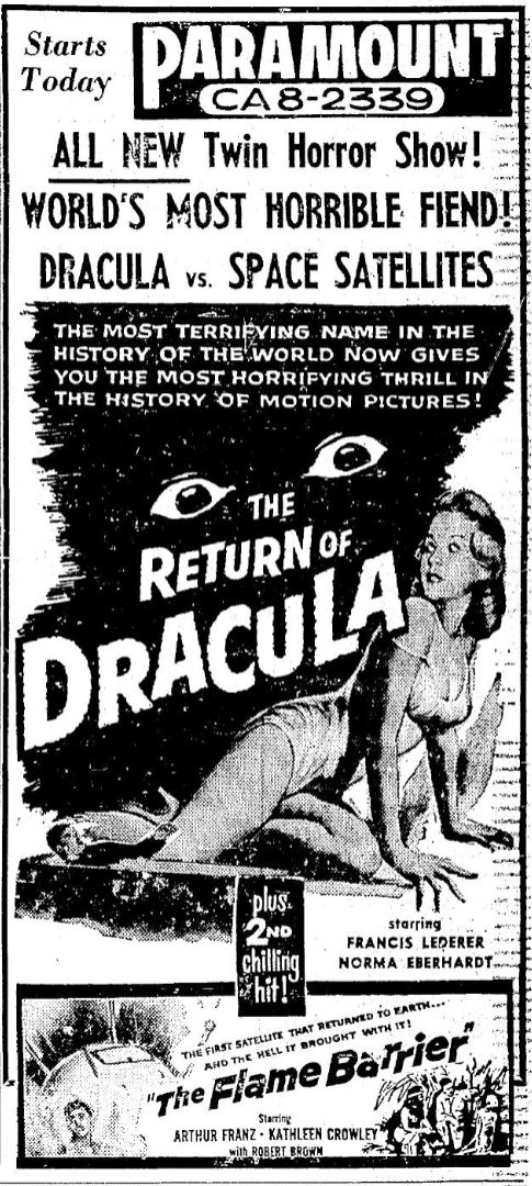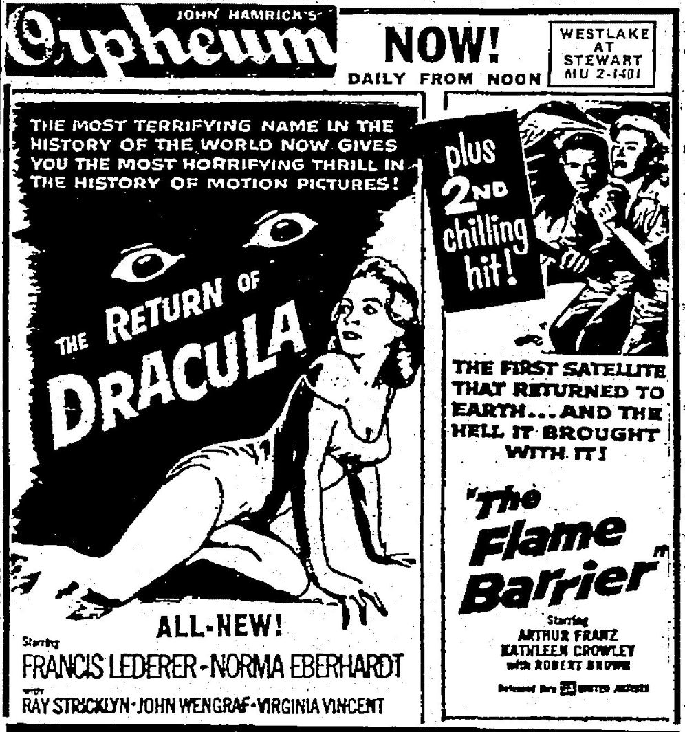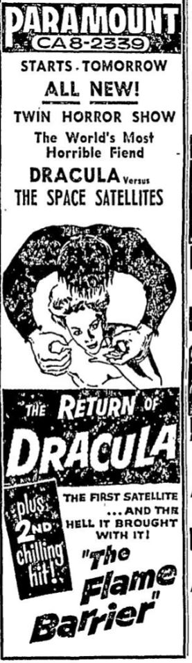 The following is a collection of print media from the initial runs of 1958's "The Return of Dracula" in the Pacific Northwest. "The Flame Barrier" (1958) was the second feature in both Seattle and Portland.
