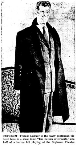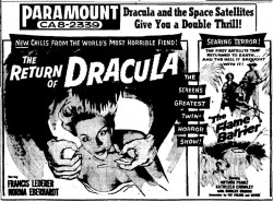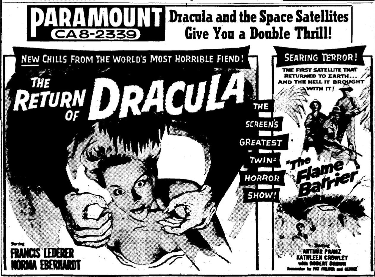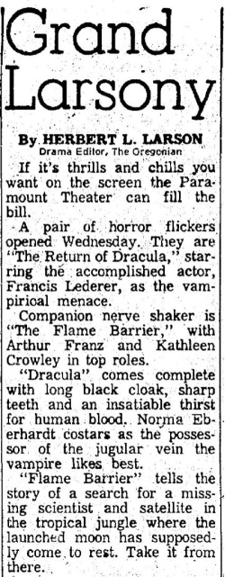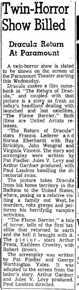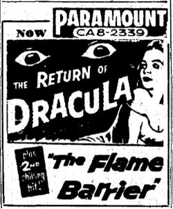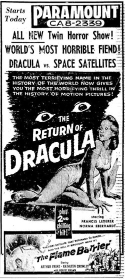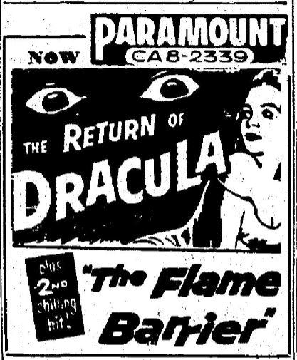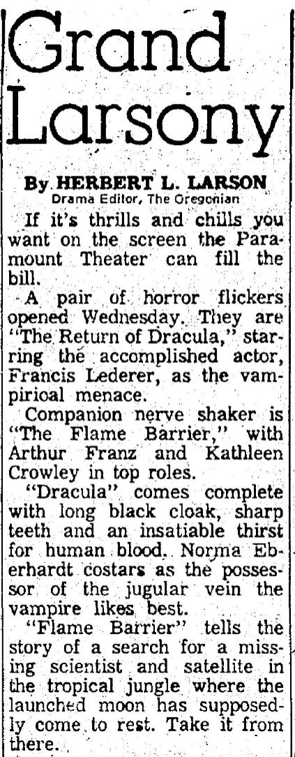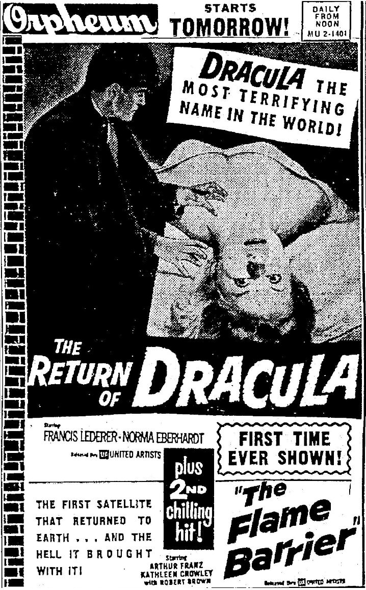 The following is a collection of print media from the initial runs of 1958's "The Return of Dracula" in the Pacific Northwest. "The Flame Barrier" (1958) was the second feature in both Seattle and Portland.