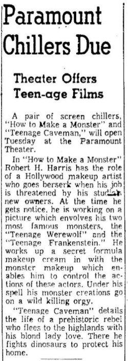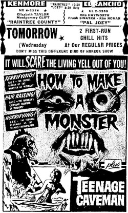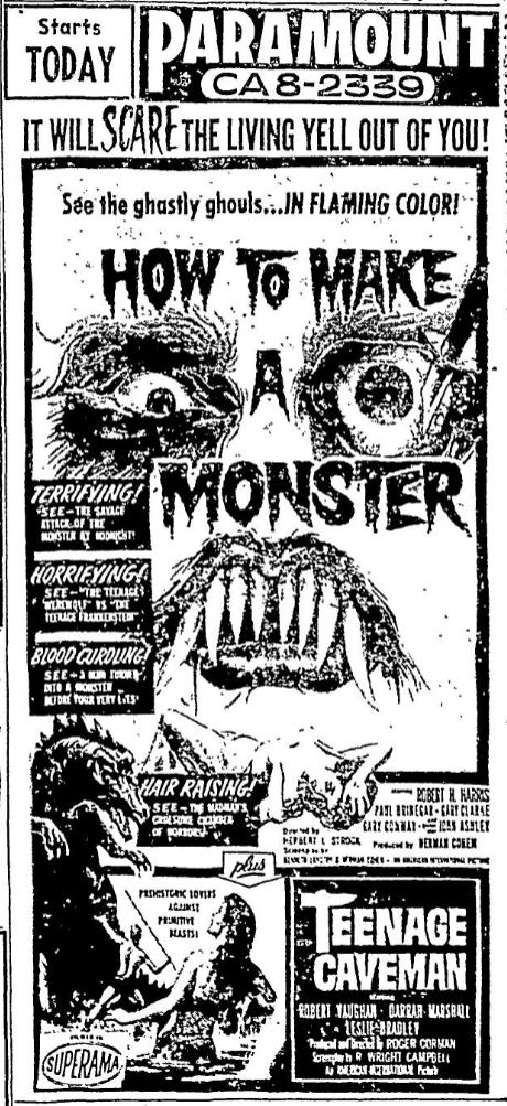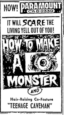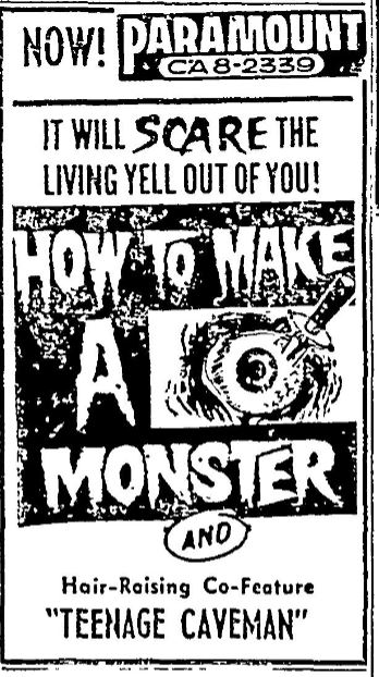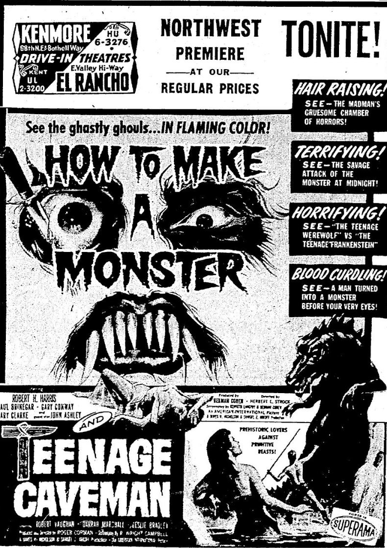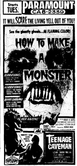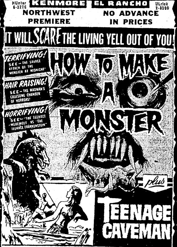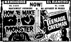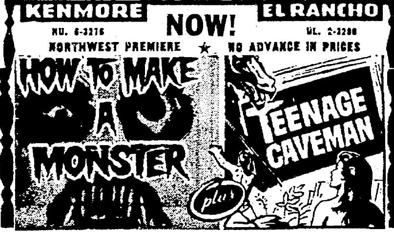 The following is a collection of print media from the initial runs of 1958's "How to Make a Monster" in the Pacific Northwest. "Teenage Caveman" (1958) was the second feature in both Seattle and Portland. Note the Seattle ads claiming "NORTHWEST PREMIERE" even though the billing ran in portland over a month before.
