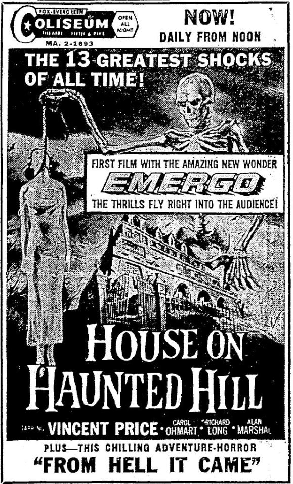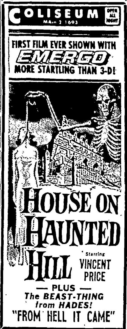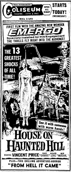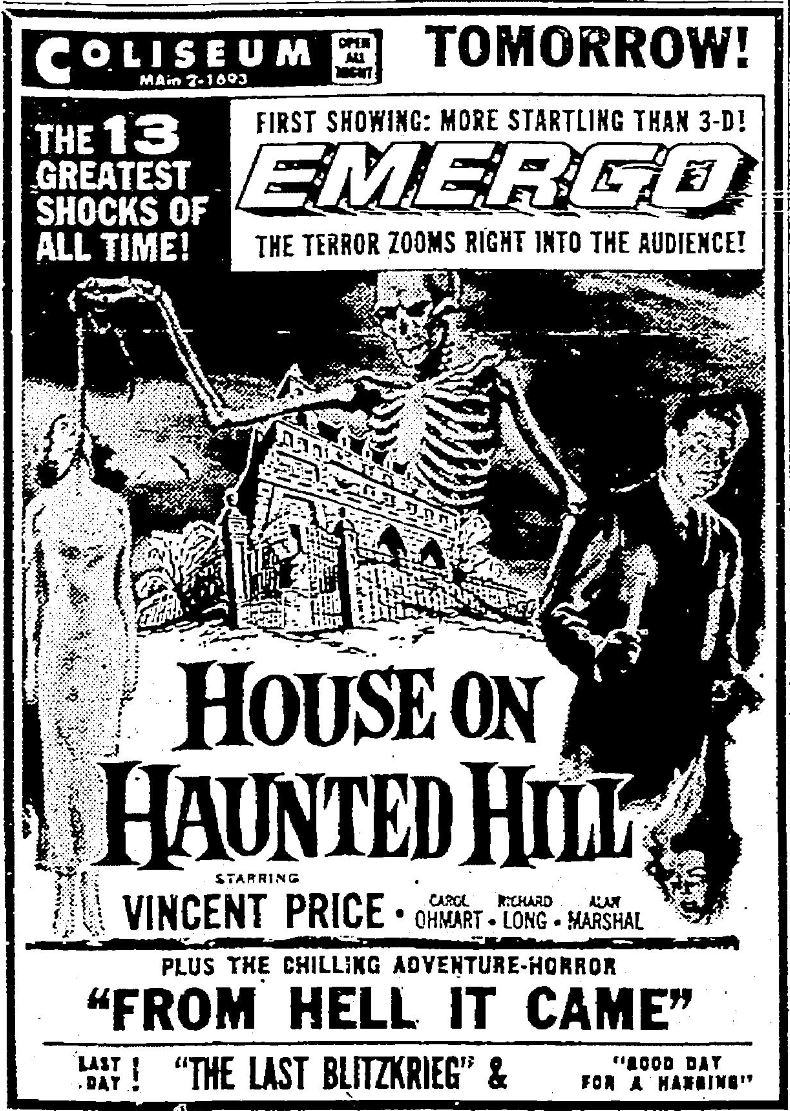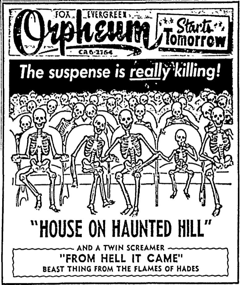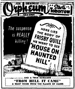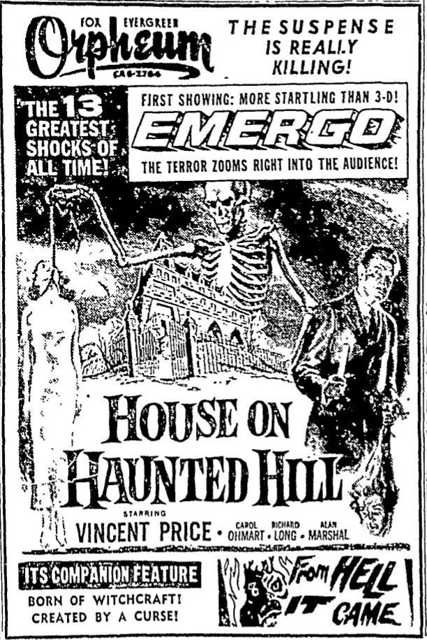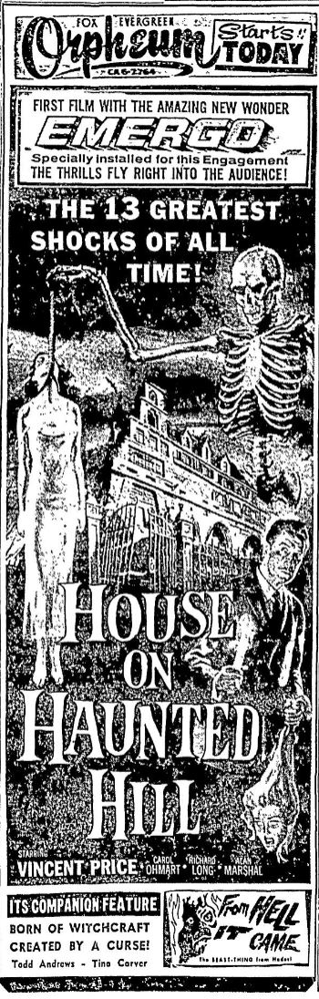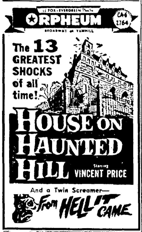The following is a collection of print media from the initial runs of 1959's "House on Haunted Hill" in the Pacific Northwest. "From Hell It Came" (1957) was the second feature in both Seattle and Portland. Based on the amount of local press this release got HOHH was a huge one from William Castle.