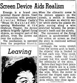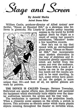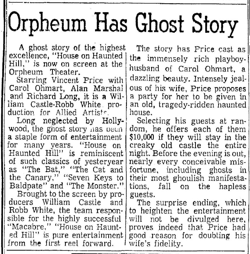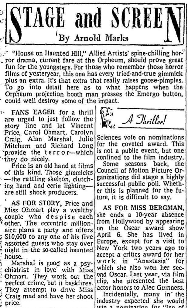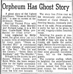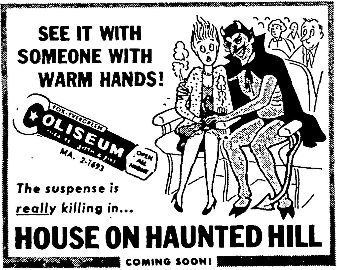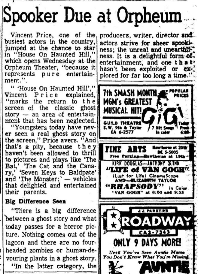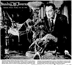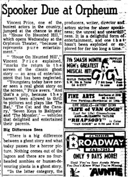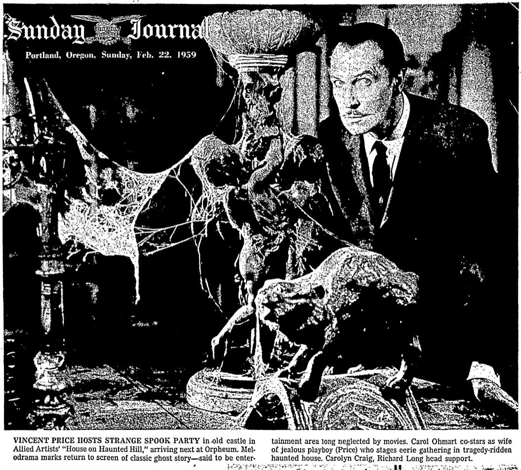 The following is a collection of print media from the initial runs of 1959's "House on Haunted Hill" in the Pacific Northwest. "From Hell It Came" (1957) was the second feature in both Seattle and Portland. Based on the amount of local press this release got HOHH was a huge one from William Castle.