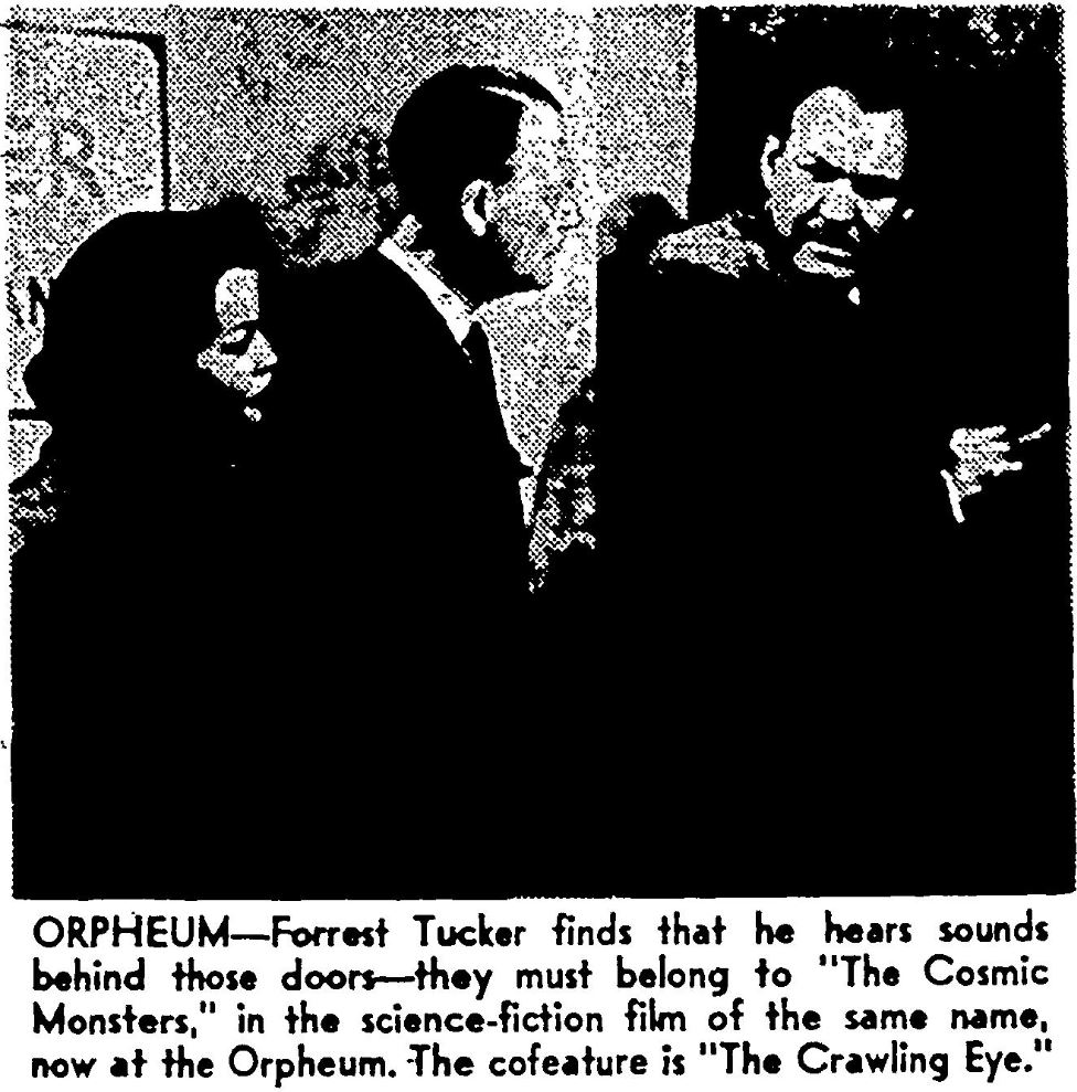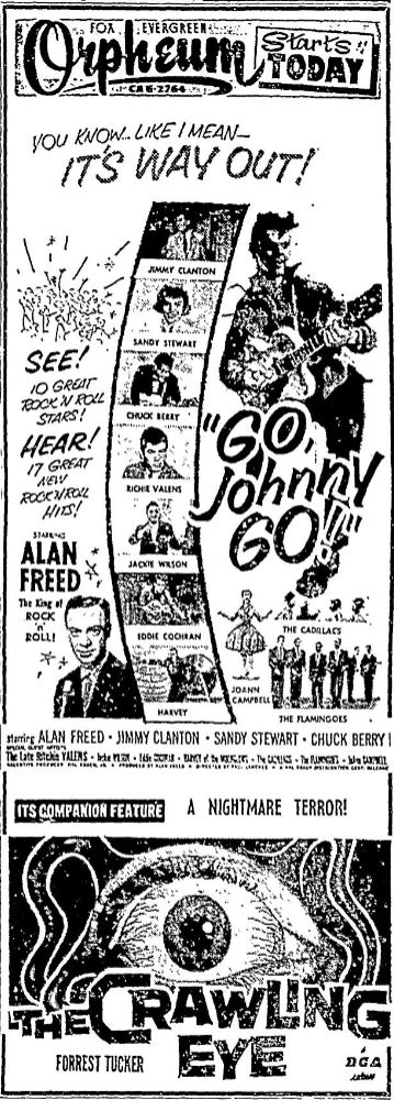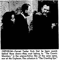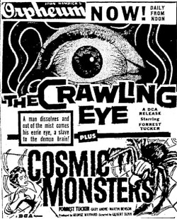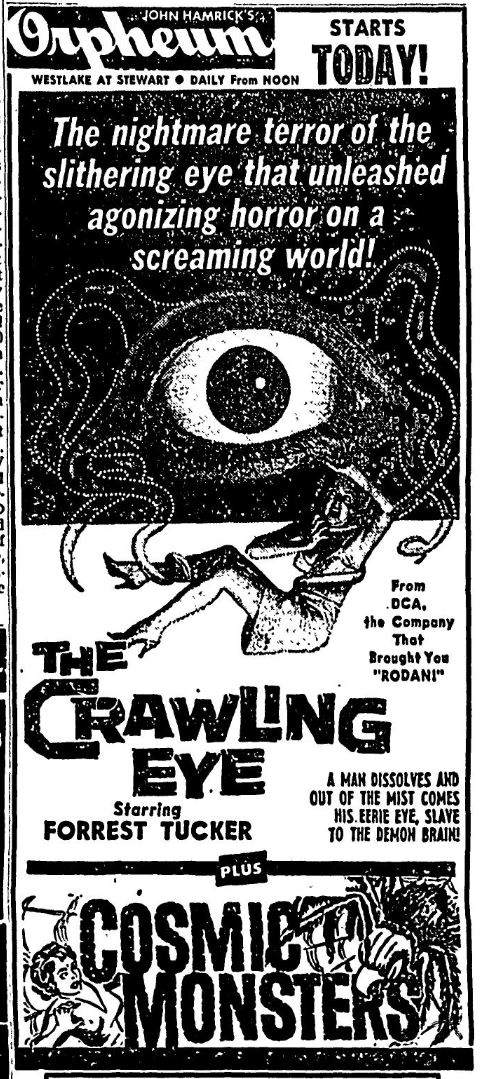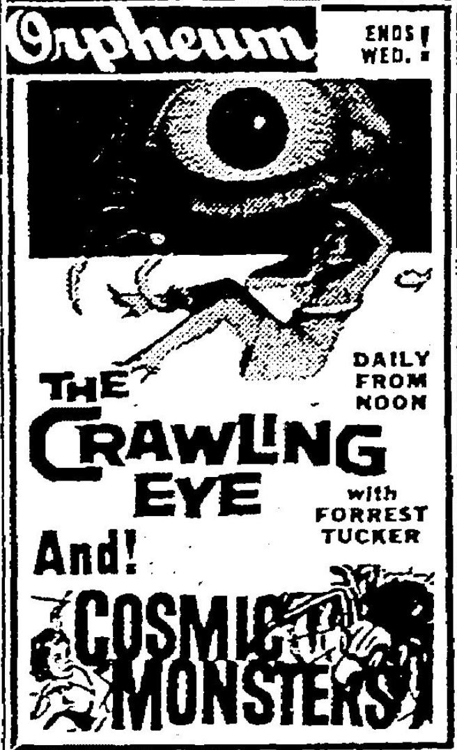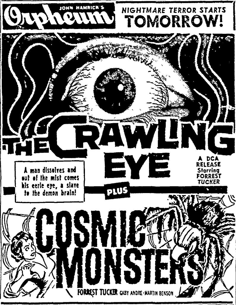 The following is a collection of print media from the initial runs of 1958's "The Crawling Eye" in the Pacific Northwest. "The Cosmic Monsters" (1958) was the second feature in Seattle. In Portland "The Crawling Eye" played second fiddle to rock and roll movie "Go, Johnny, Go!"