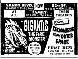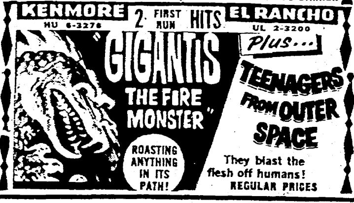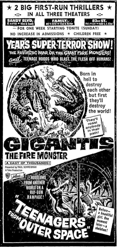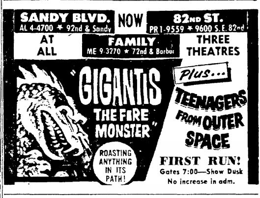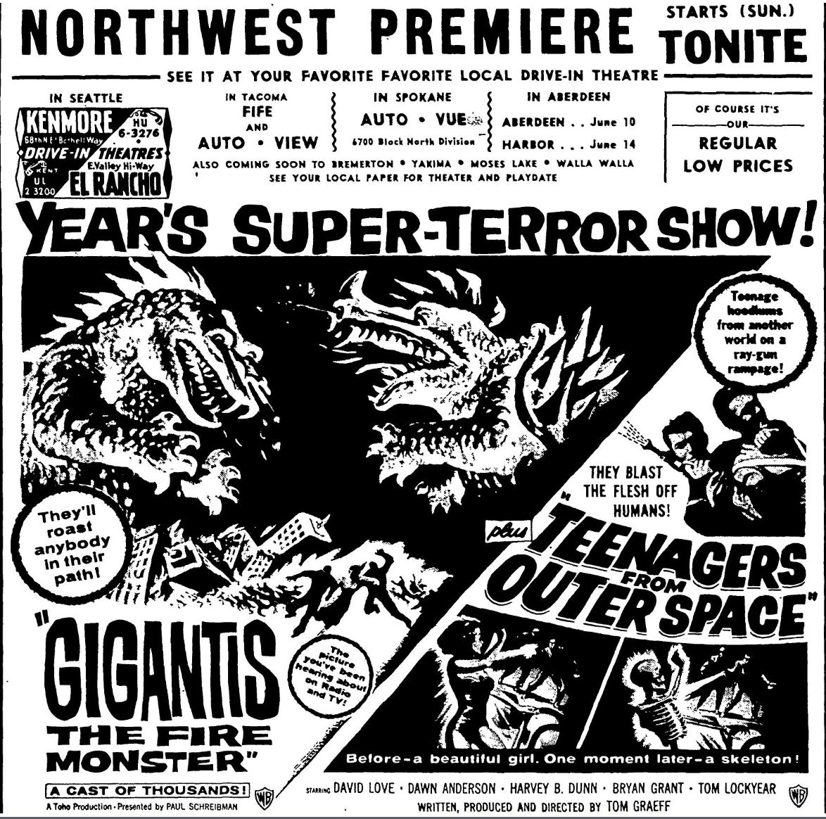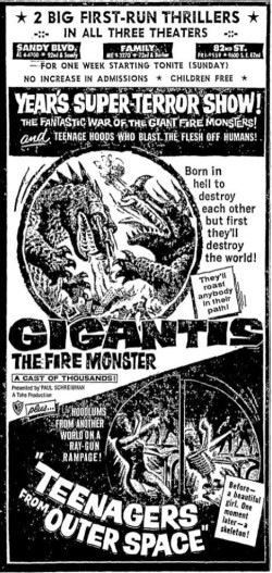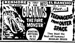 The following is a collection of print media from the initial runs of 1959's "Gigantis, the Fire Monster" in the Pacific Northwest. "Teenagers from Outer Space" was the second feature in both Seattle and Portland.