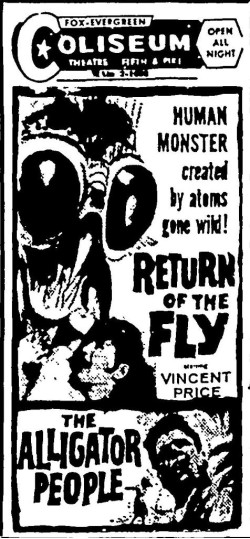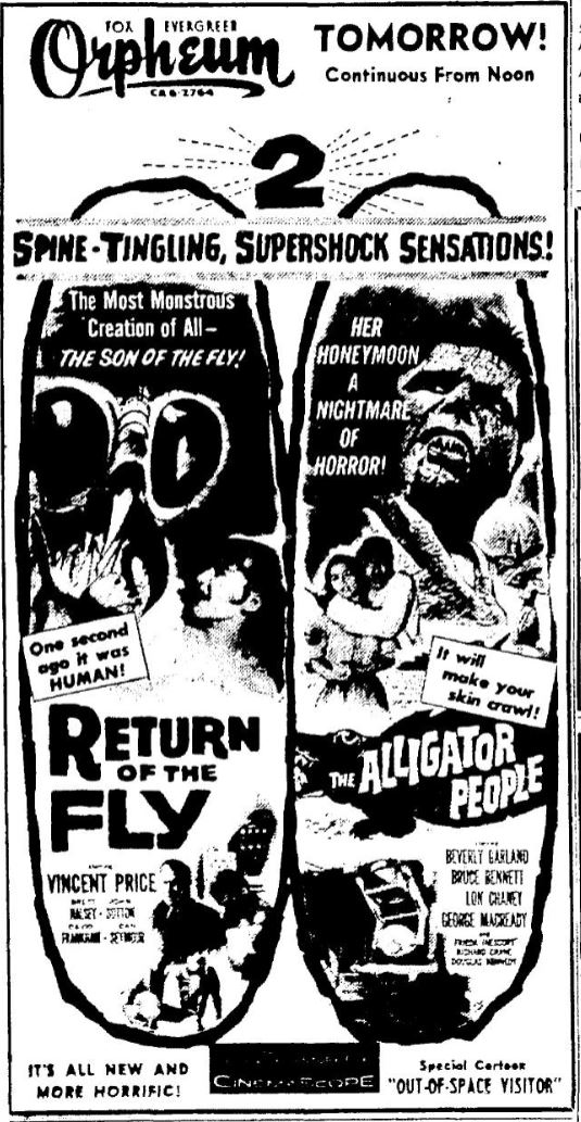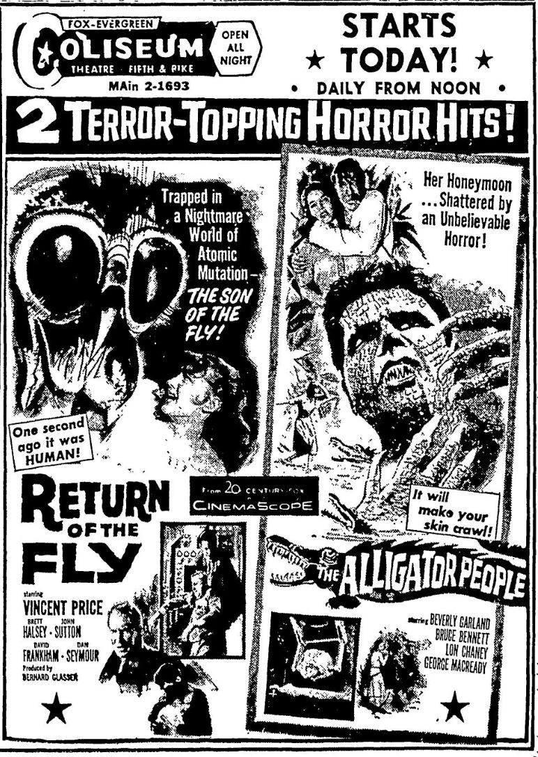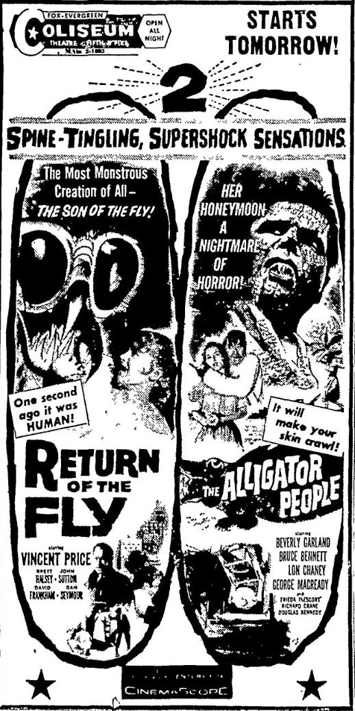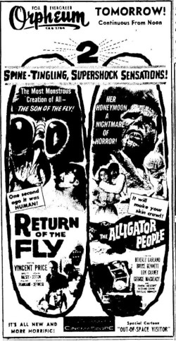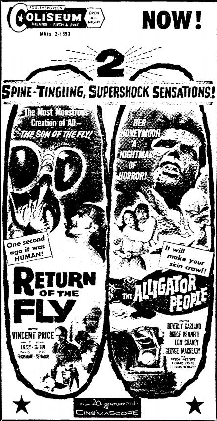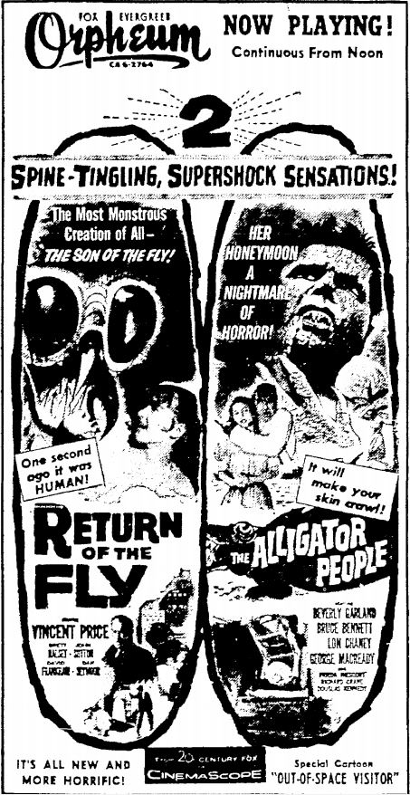 The following is a collection of print media from the initial runs of 1959's "Return of the Fly" in the Pacific Northwest. "The Alligator People" was the second feature in both Seattle and Portland.