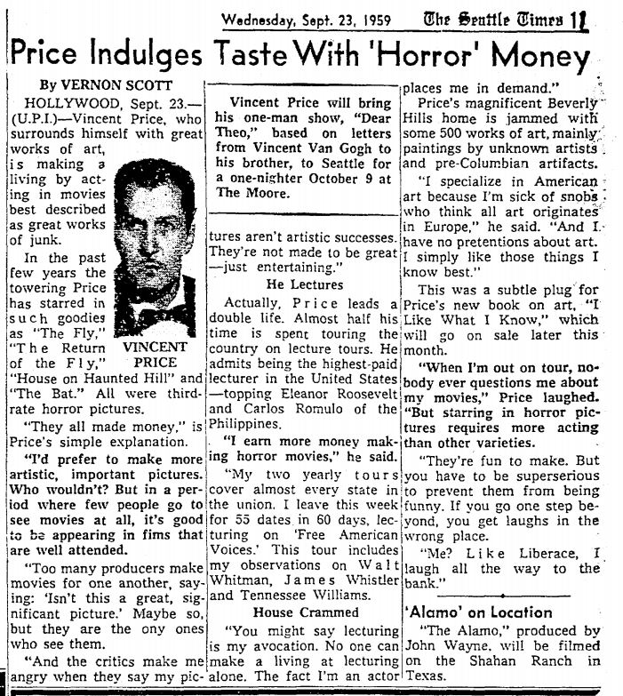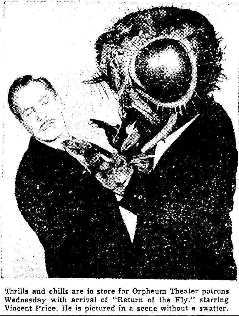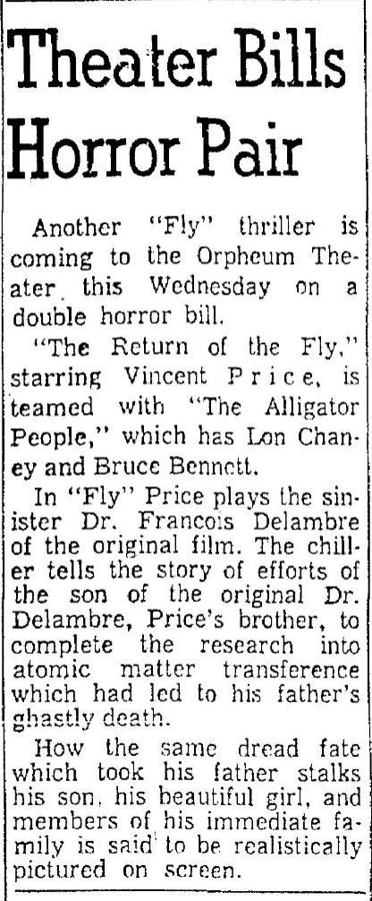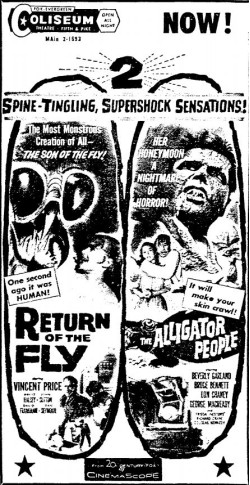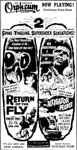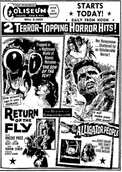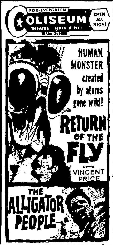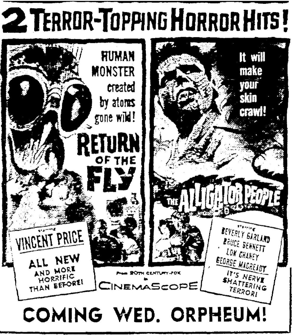 The following is a collection of print media from the initial runs of 1959's "Return of the Fly" in the Pacific Northwest. "The Alligator People" was the second feature in both Seattle and Portland.
