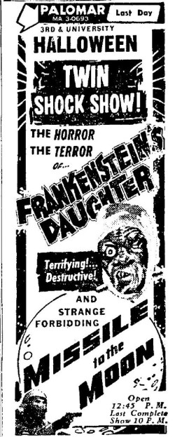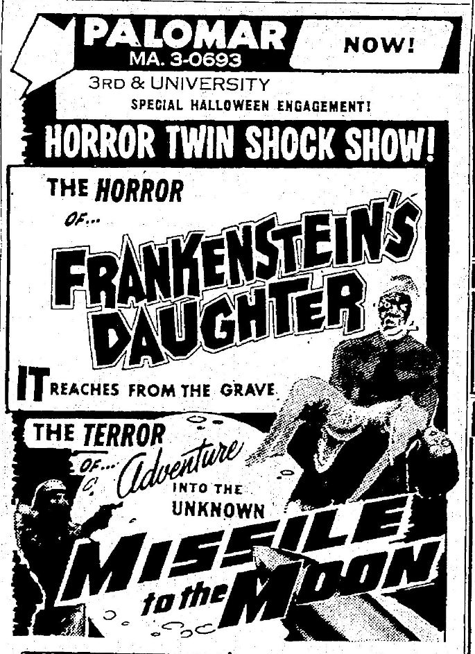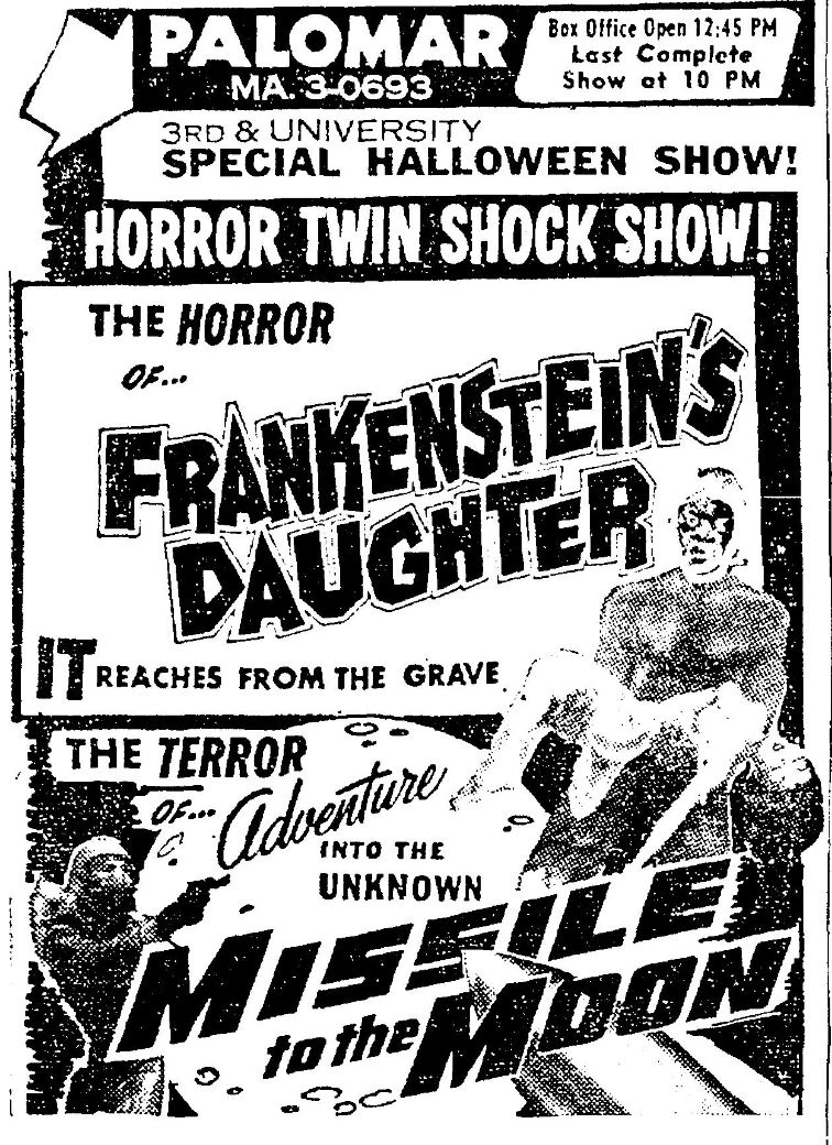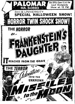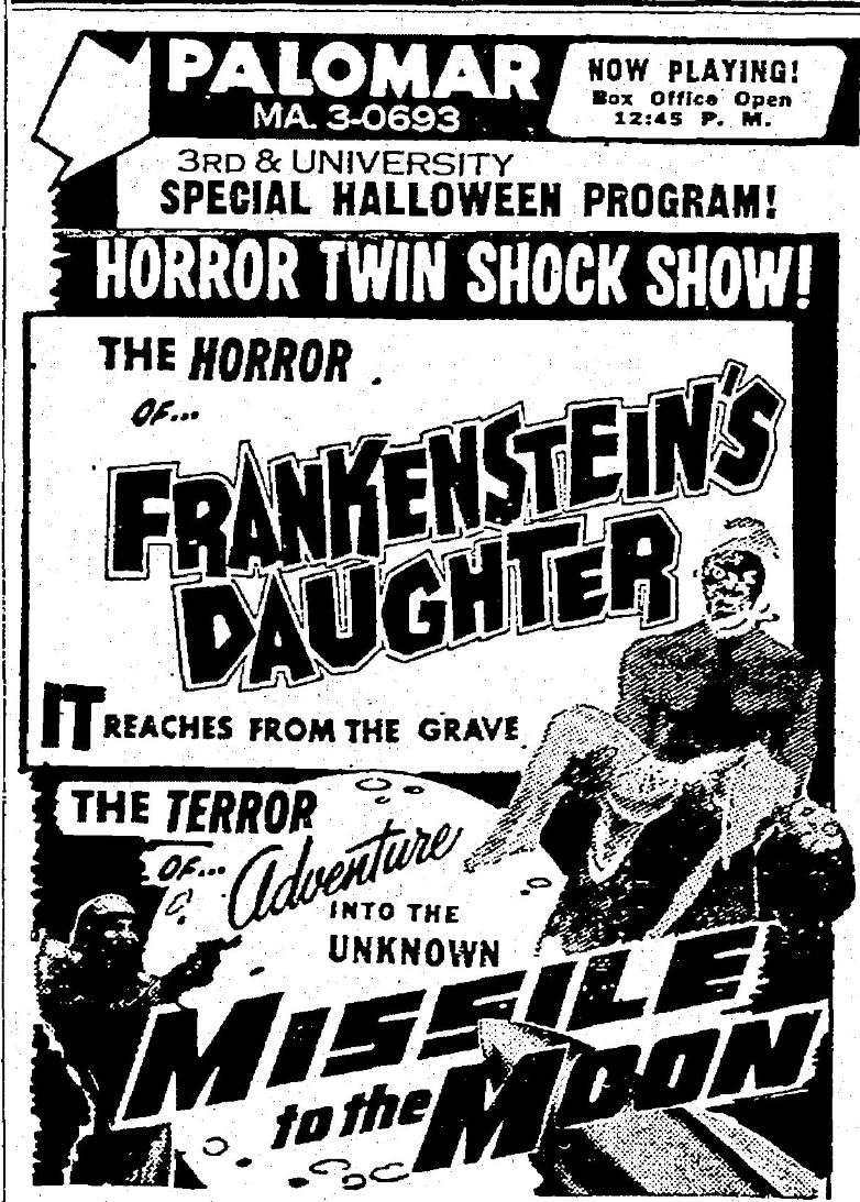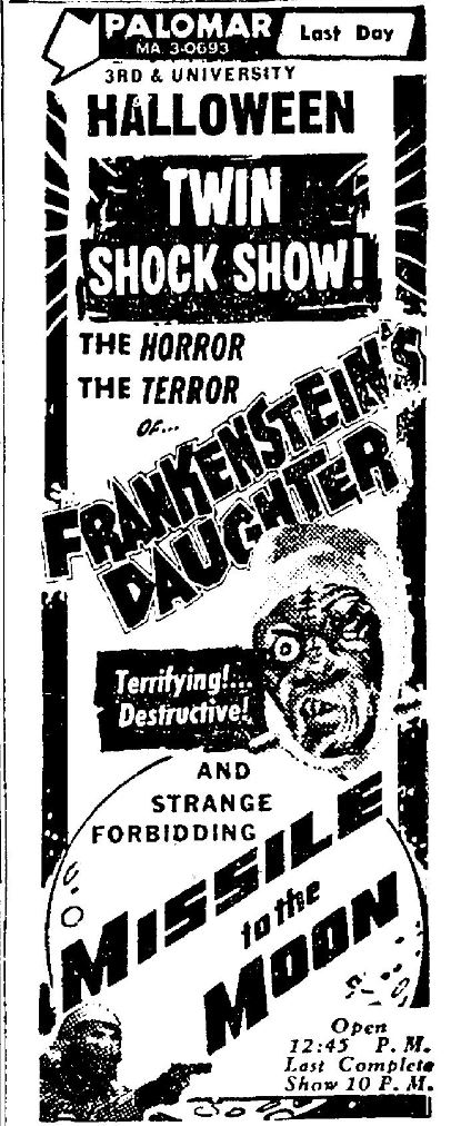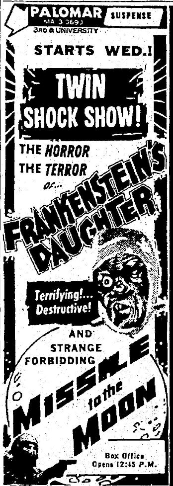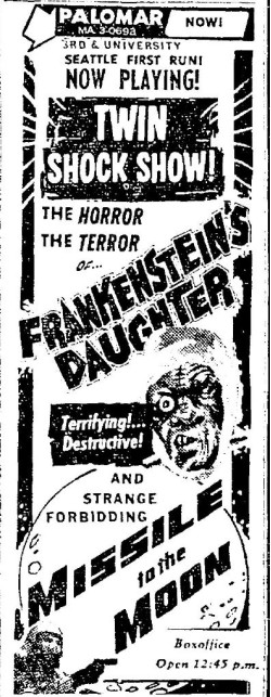 The following is a collection of print media from the initial runs of 1958's "Frankenstein's Daughter" in the Pacific Northwest. "Missile to the Moon" was the second feature. Portland was seemingly spared as I can only find hard evidence that this turkey of a double-feature played Seattle.