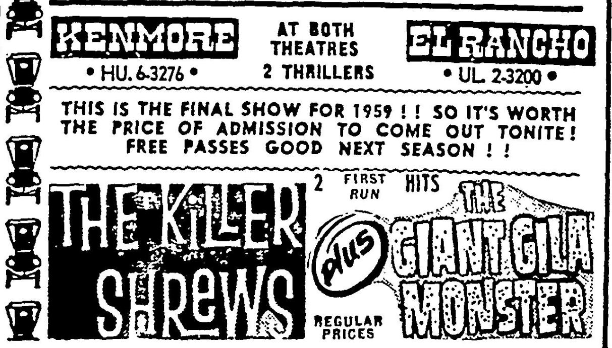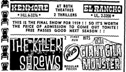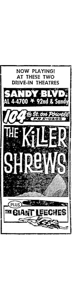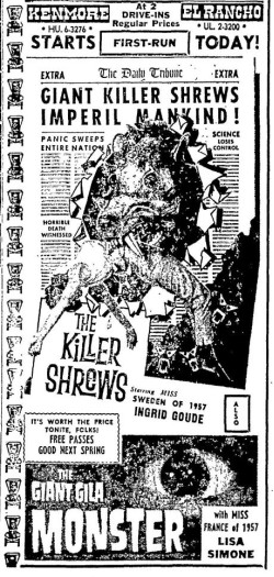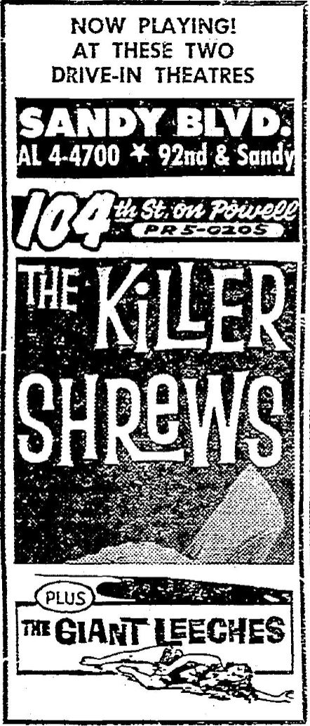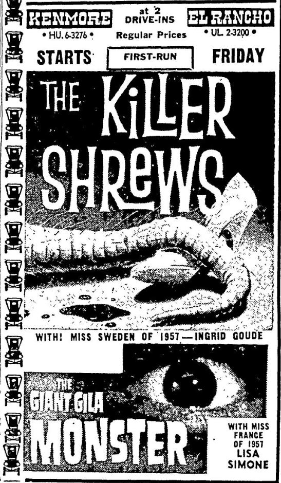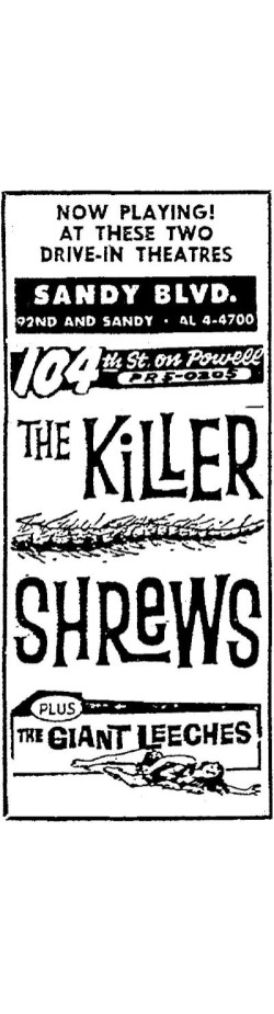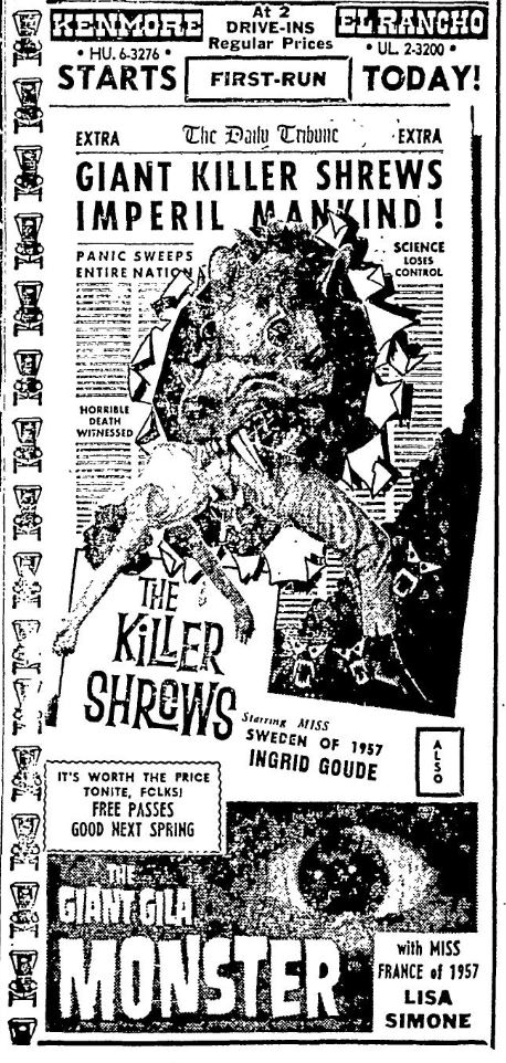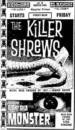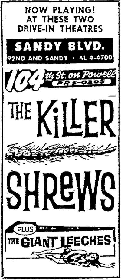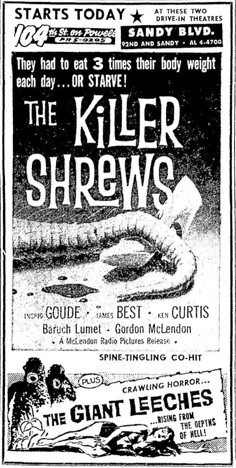 The following is a collection of print media and trailers from the initial runs of 1959's "The Killer Shrews" in the PNW. Seattle got "The Giant Gila Monster" for a second feature while Portland got "The Giant Leeches" months later.