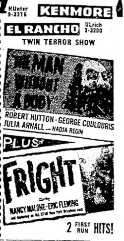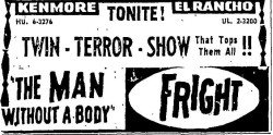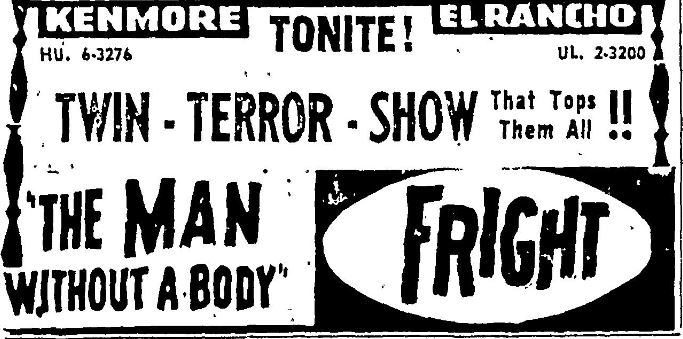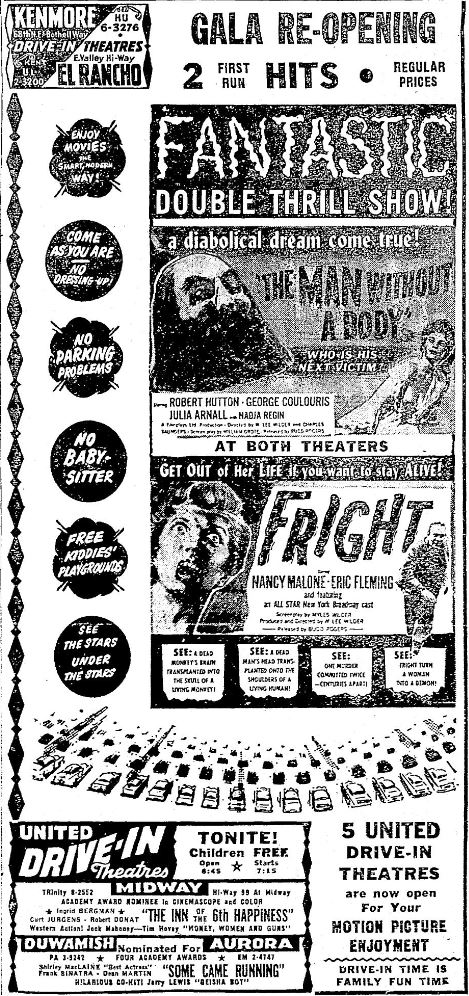 The following is a collection of print media (+ trailers) from the initial run of 1957's "The Man Without a Body" and 1956's "Fright" in Seattle. I couldn't find anything pertaining to either film playing in Portland.