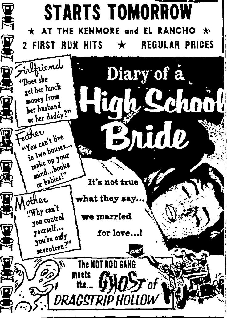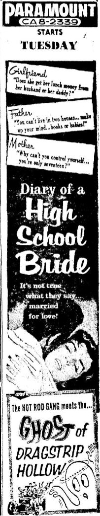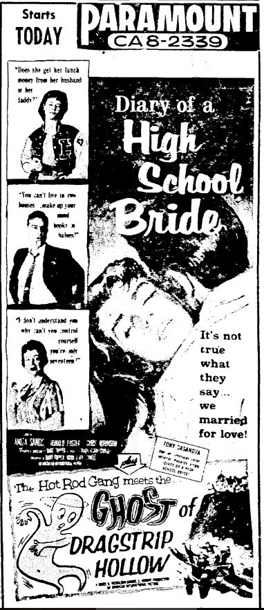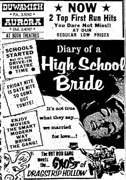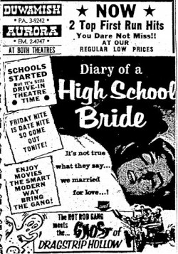The following is a collection of print media from the initial runs of 1959's "Diary of a High School Bride" in the Pacific Northwest. "Ghost of Dragstrip Hollow" (1959) was the second feature in both Seattle and Portland.