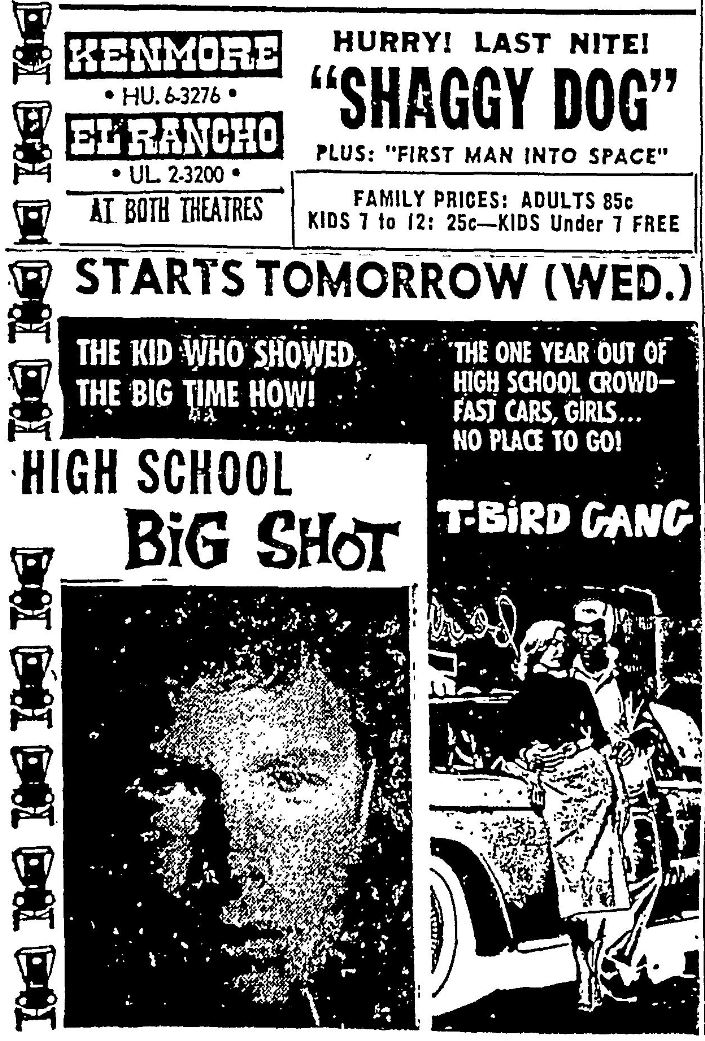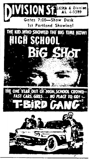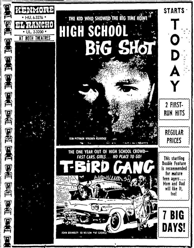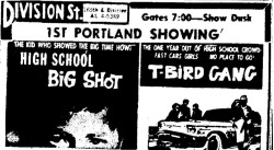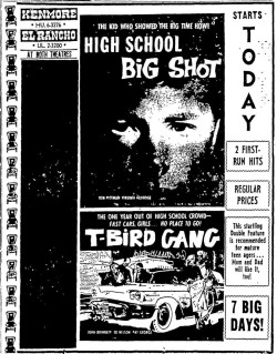 The following is a collection of print media from the initial runs of 1959's "High School Big Shot" in the Pacific Northwest. "T-Bird Gang" (1959) was the second feature in both Seattle and Portland.