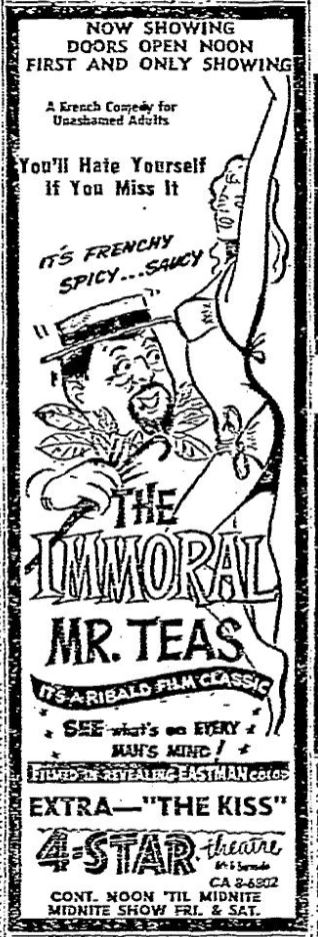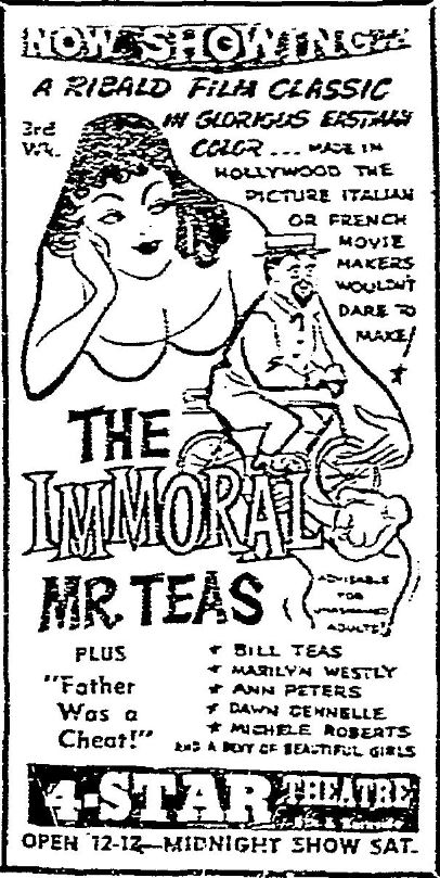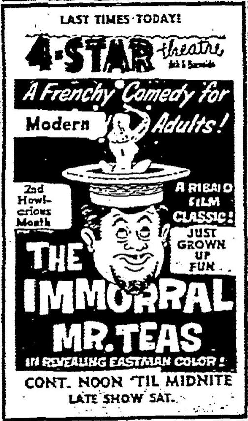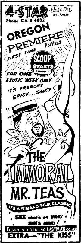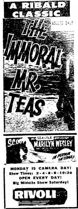 The following is a collection of print media (and a clip) from the initial runs of 1959's "The Immoral Mr. Teas" in the Pacific Northwest. This only appeared to run in Seattle for a week but hung around in Portland for a couple of months!