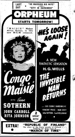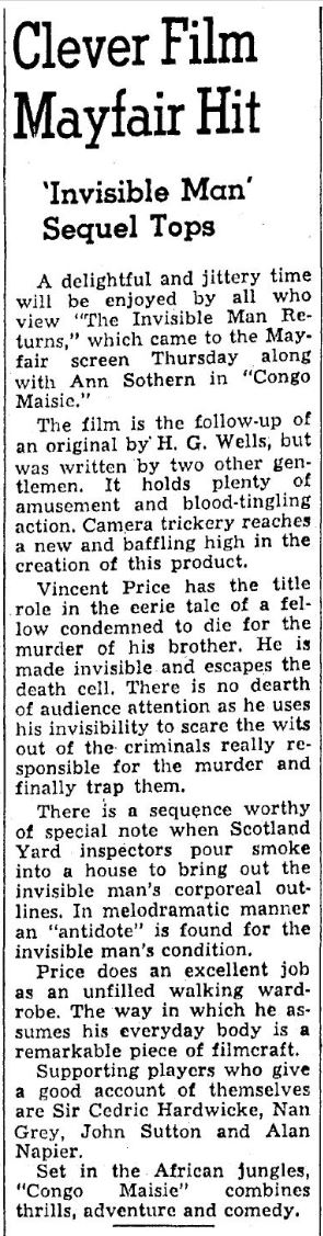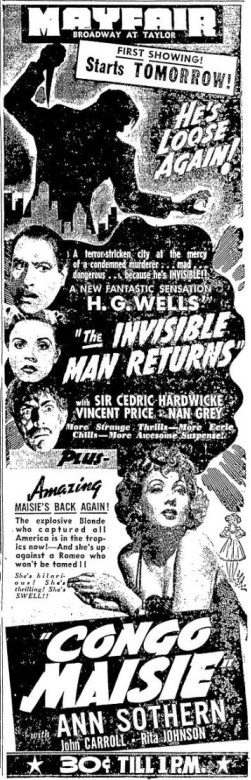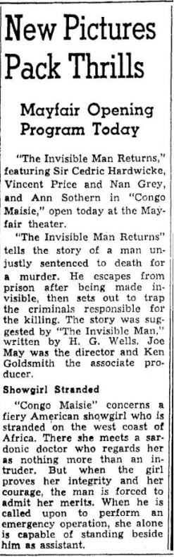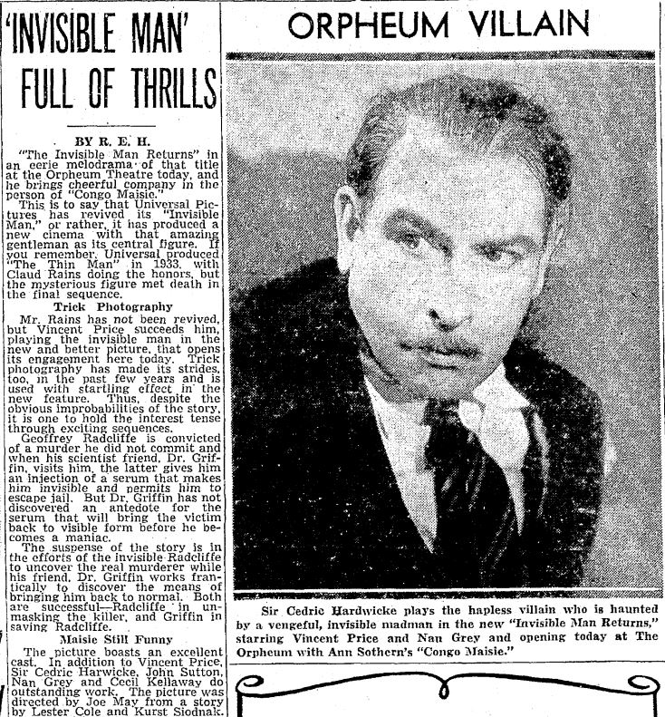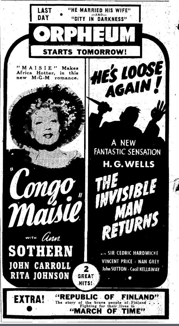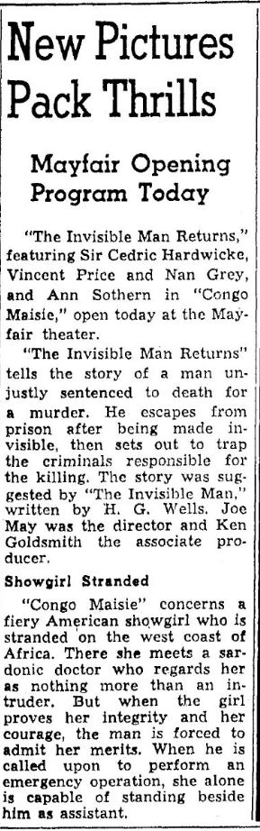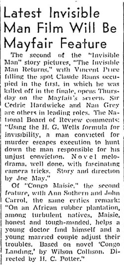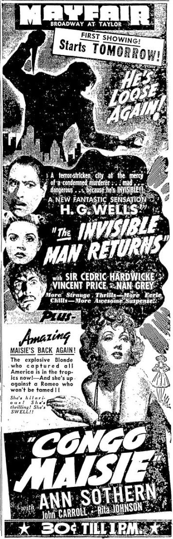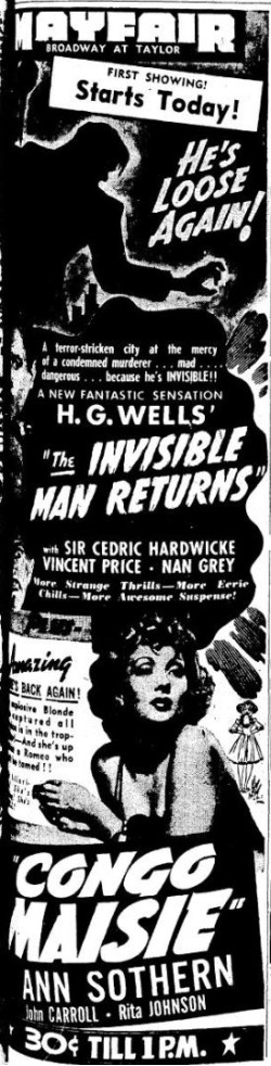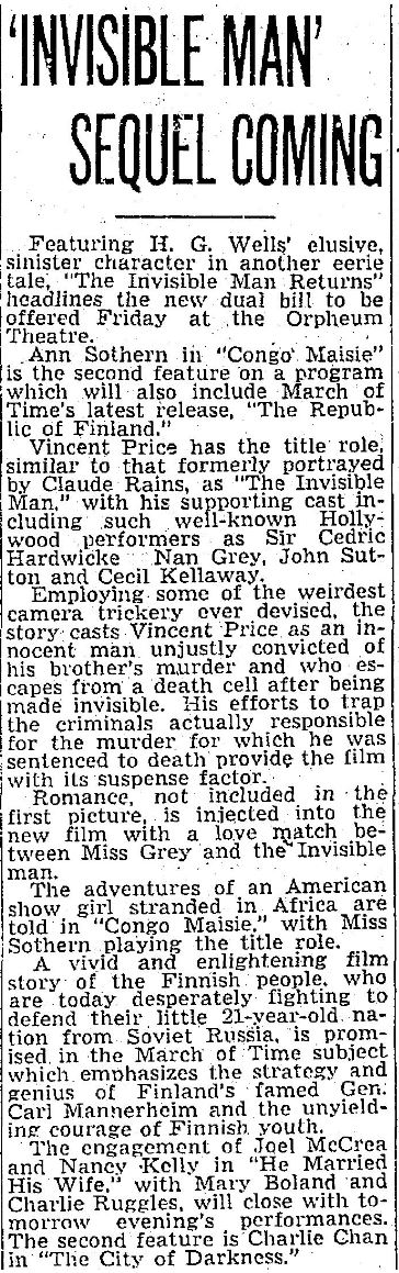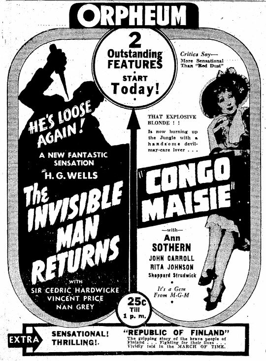 The following is a collection of print media from the initial runs of 1940's "The Invisible Man Returns" in the Pacific Northwest.