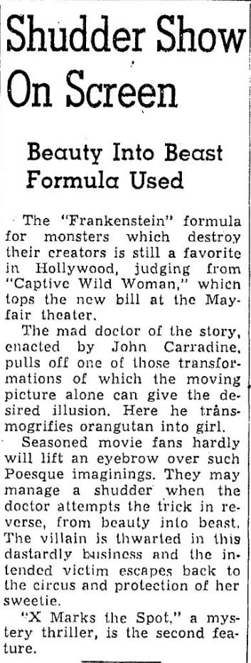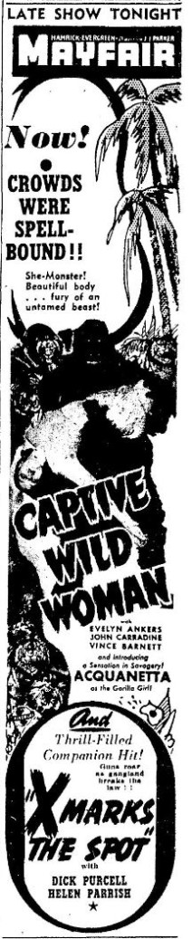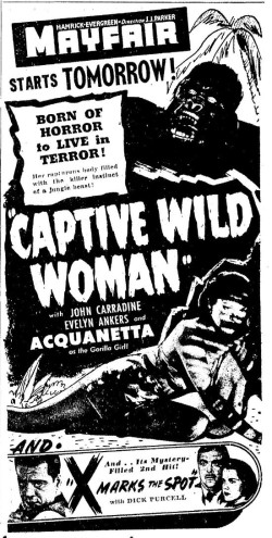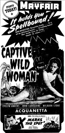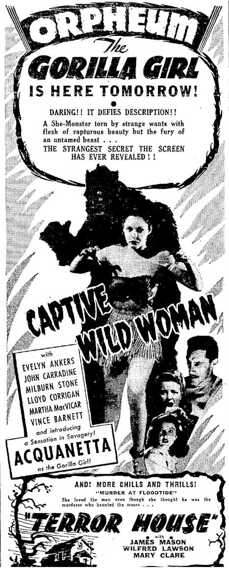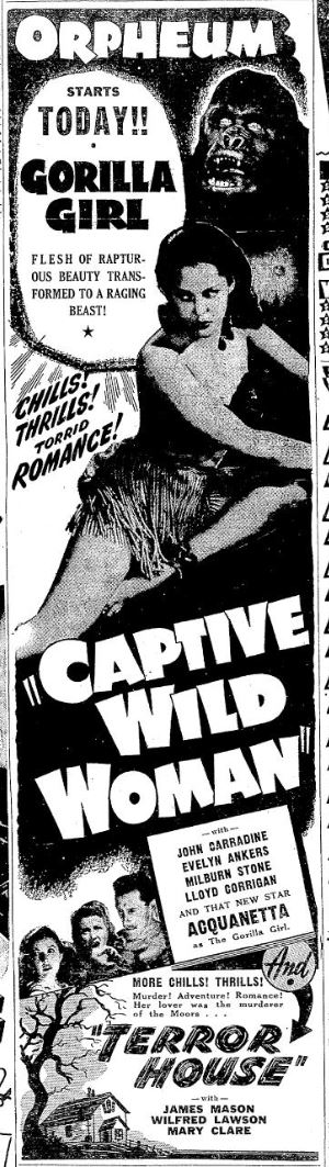 The following is a collection of print media from the initial runs of 1943's "Captive Wild Woman" in the Pacific Northwest.