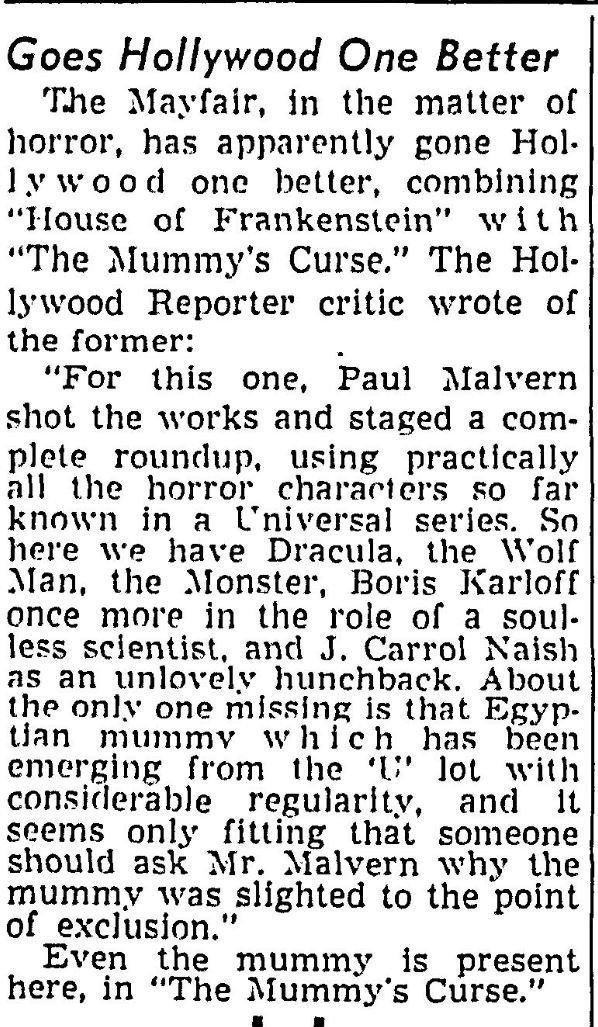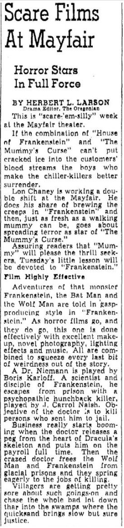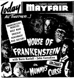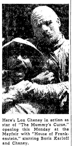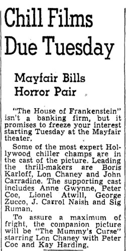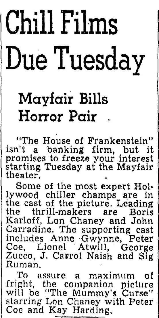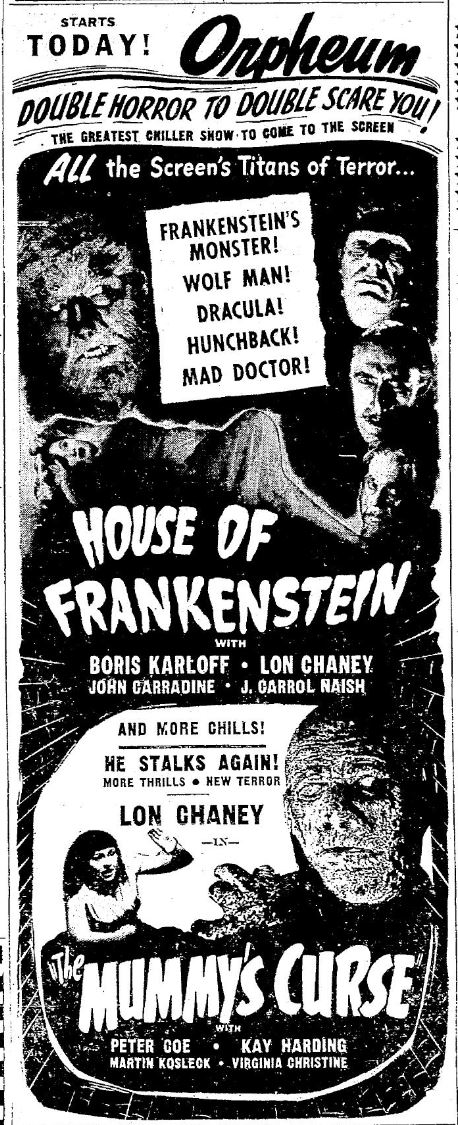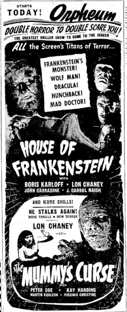 The following is a collection of print media (and two trailers!) from the initial runs of 1944's "House of Frankenstein" and "The Mummy's Curse" in the Pacific Northwest. What a fun double bill!