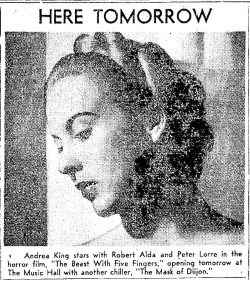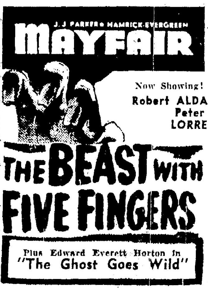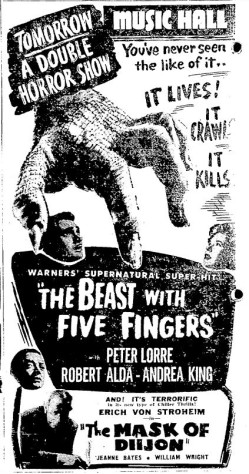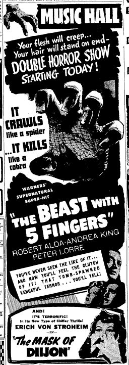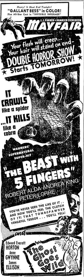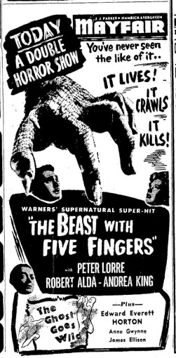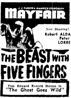 The following is a collection of print media from the initial runs of 1946's "The Beast with Five Fingers" in the Pacific Northwest.
