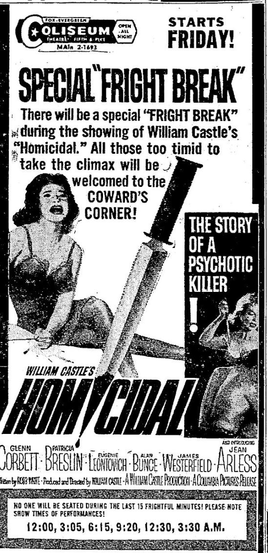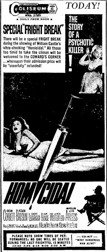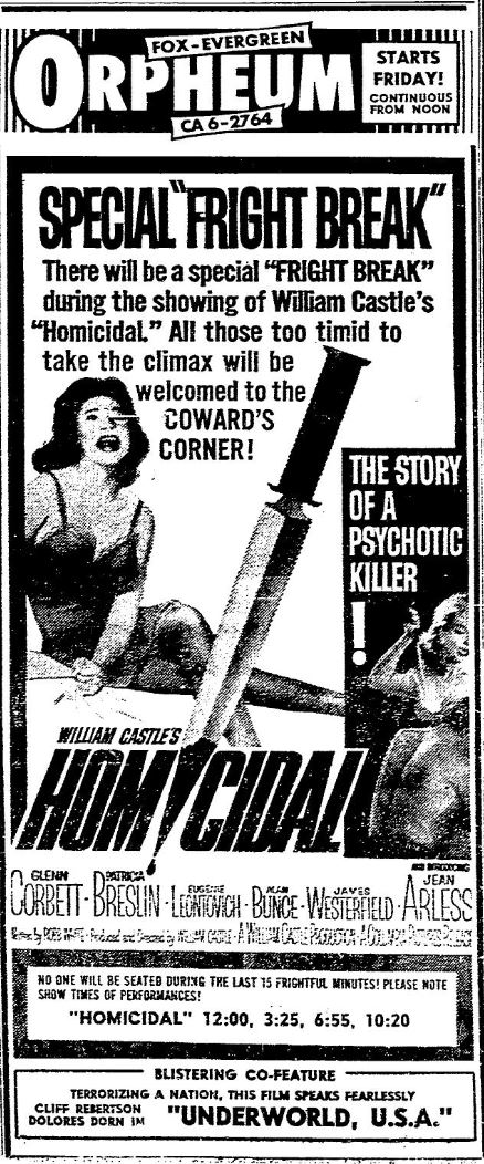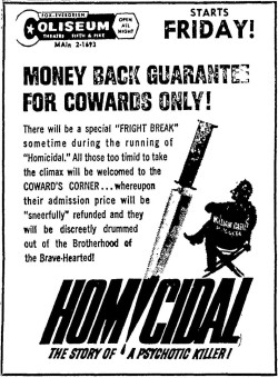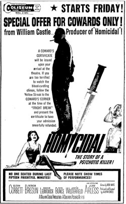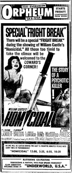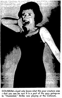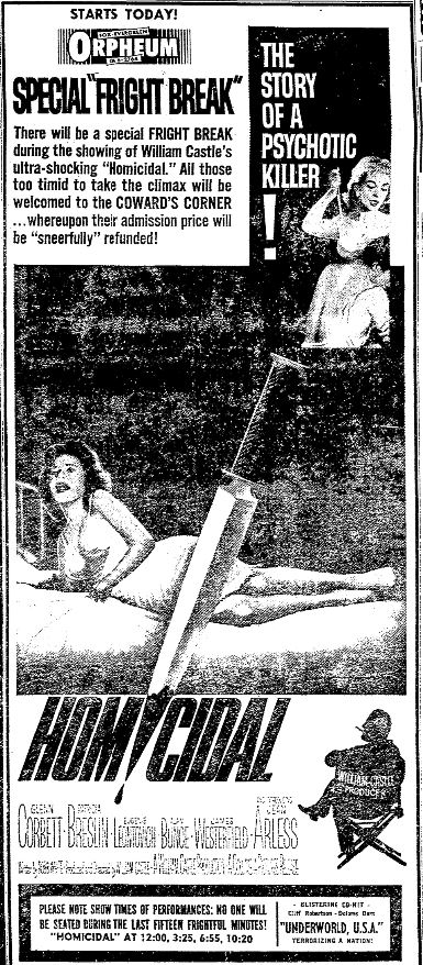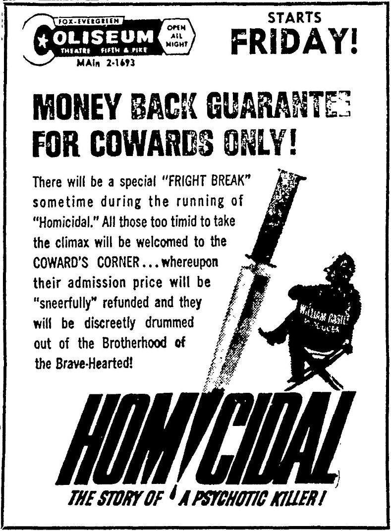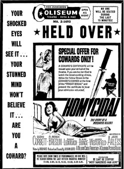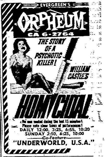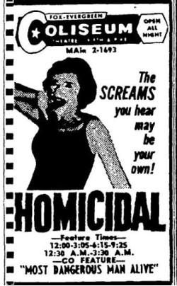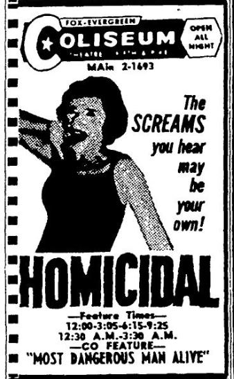 This is a collection of media from the initial releases of "Homicidal" (1961) in the Pacific Northwest.