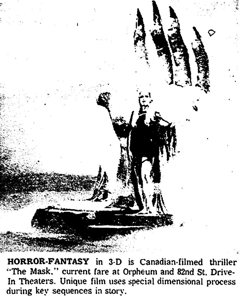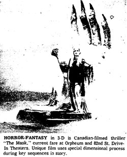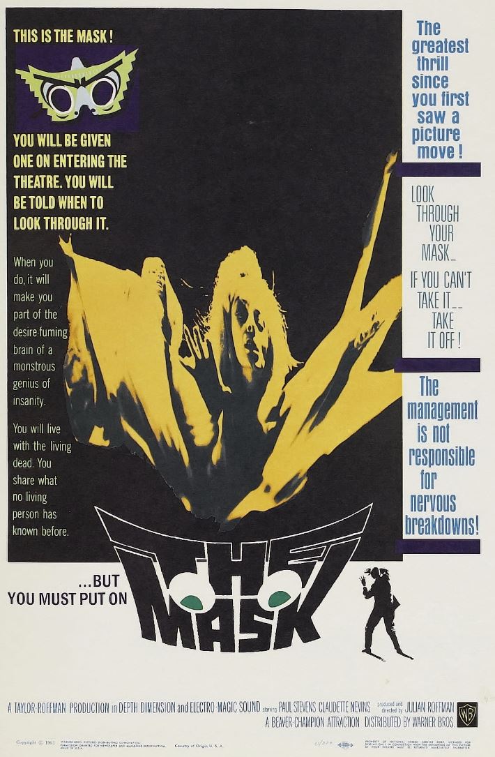 The Mask is a 1961 Canadian horror film that was produced in 3-D by Warner Bros. It was directed by Julian Roffman, and stars Paul Stevens, Claudette Nevins, and Bill Walker. The film tells the story of a psychiatrist, Dr. Allan Barnes, who receives a mysterious mask from one of his patients who committed suicide. Whenever he wears the mask, he experiences disturbing and violent visions that affect his personality and behavior. The film is notable for being the first Canadian film to be widely distributed in the United States, and the only Canadian 3-D feature. The film also features an introduction by magician Harry Blackstone, who instructs the audience to put on their 3-D glasses when they hear the command “Put the mask on now!” during the film. The Mask is considered a cult classic and a pioneer of psychedelic cinema