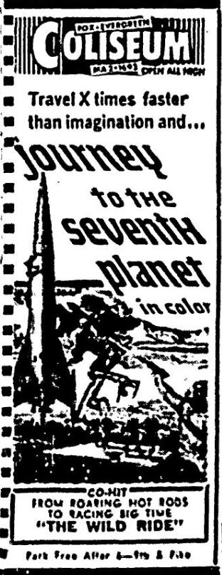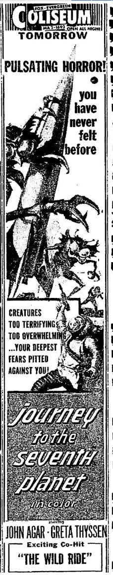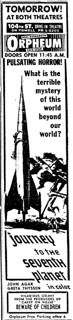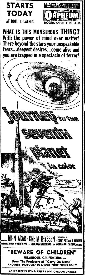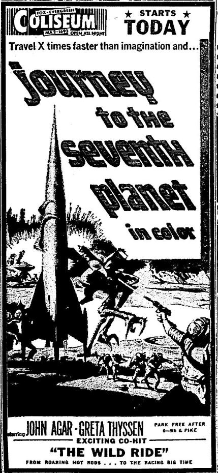 This is a collection of media from the initial releases of "Journey to the Seventh Planet" (1961) in the Pacific Northwest. For second features Seattle got "The Wild Ride" and Portland got "Beware of Children, (1960)."