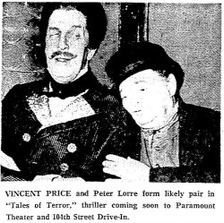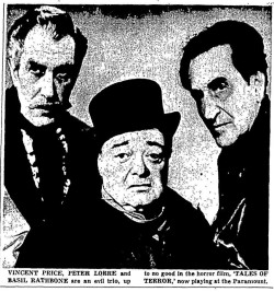 Stars: Vincent Price, Peter Lorre, Basil Rathbone, Maggie Pierce, Leona Gage