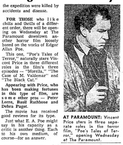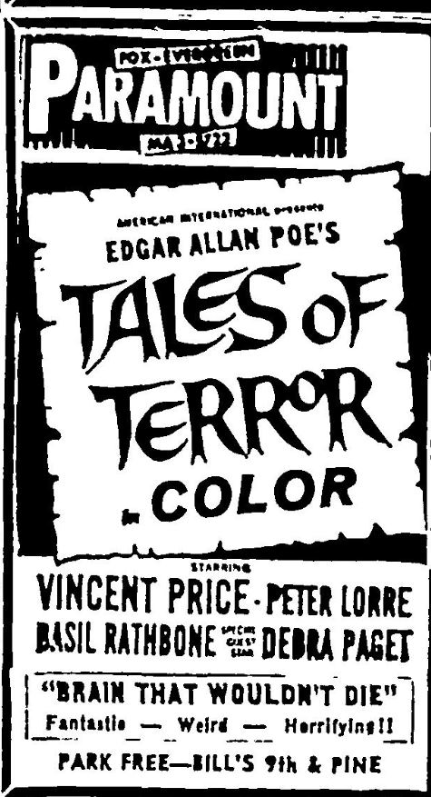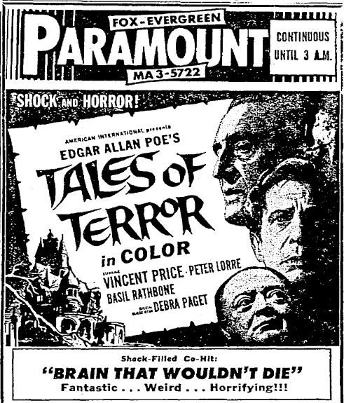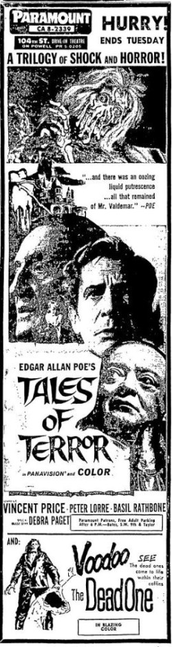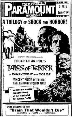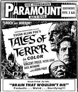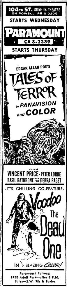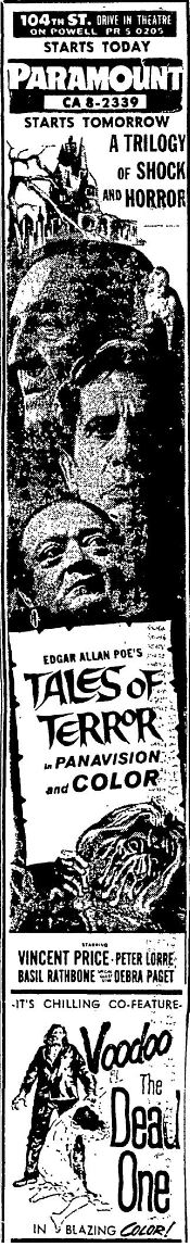 This is a collection of media from the initial releases of "Tales of Terror" (1962) in the Pacific Northwest. Portland got "The Dead One" (1961) for a second feature, and Seattle got 1962's "The Brain the Wouldn't Die."