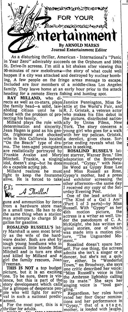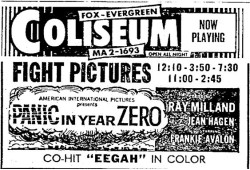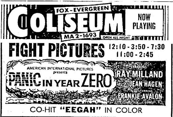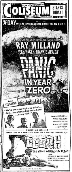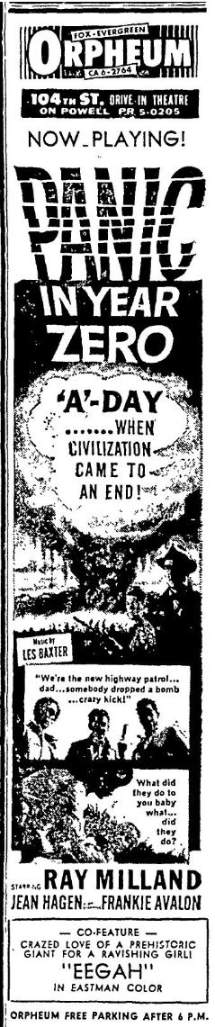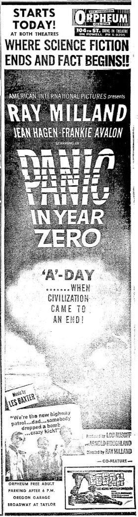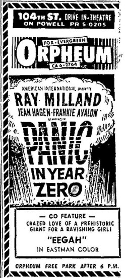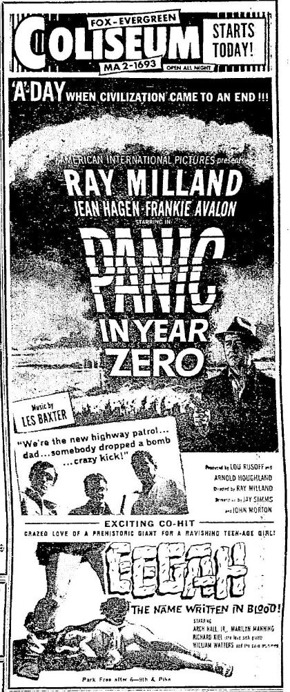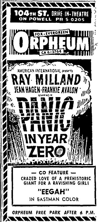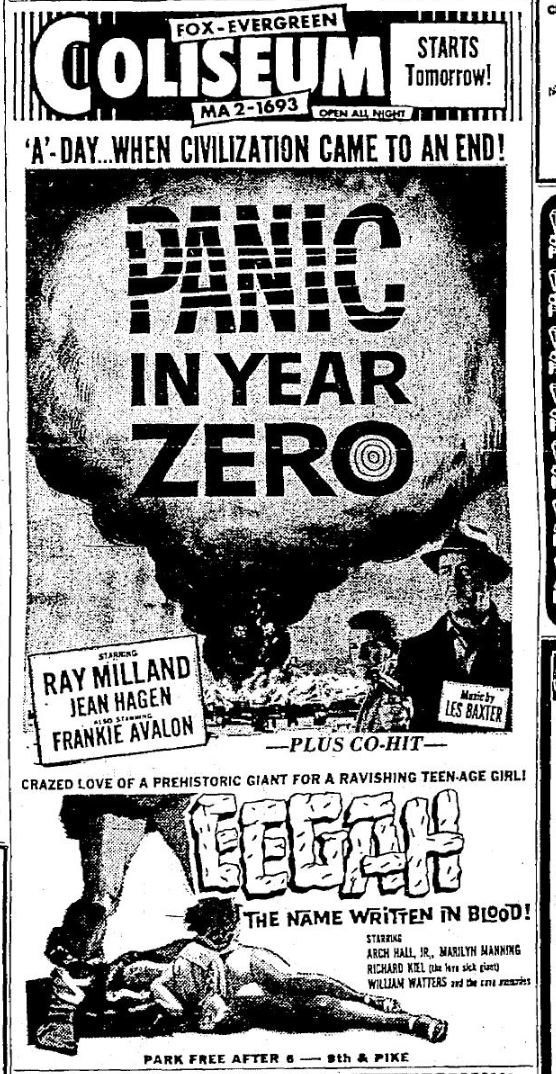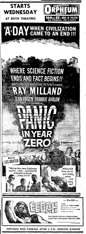 This is a collection of media from the initial releases of "Panic in Year Zero" (1962) in the Pacific Northwest. "Eegah" (1962) was the co-hit in both Seattle and Portland.