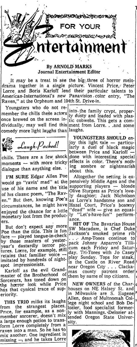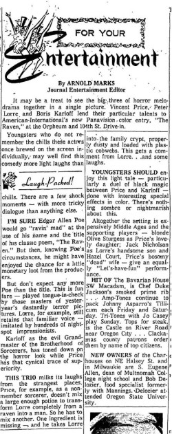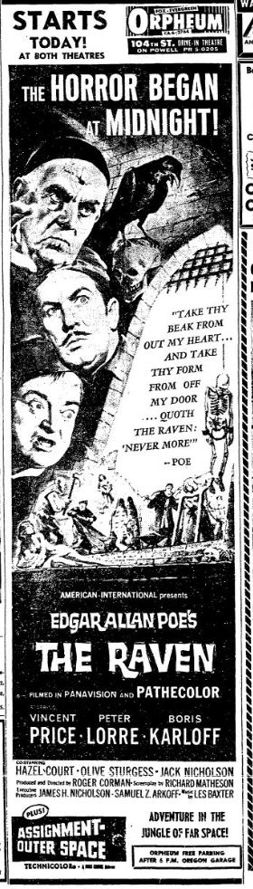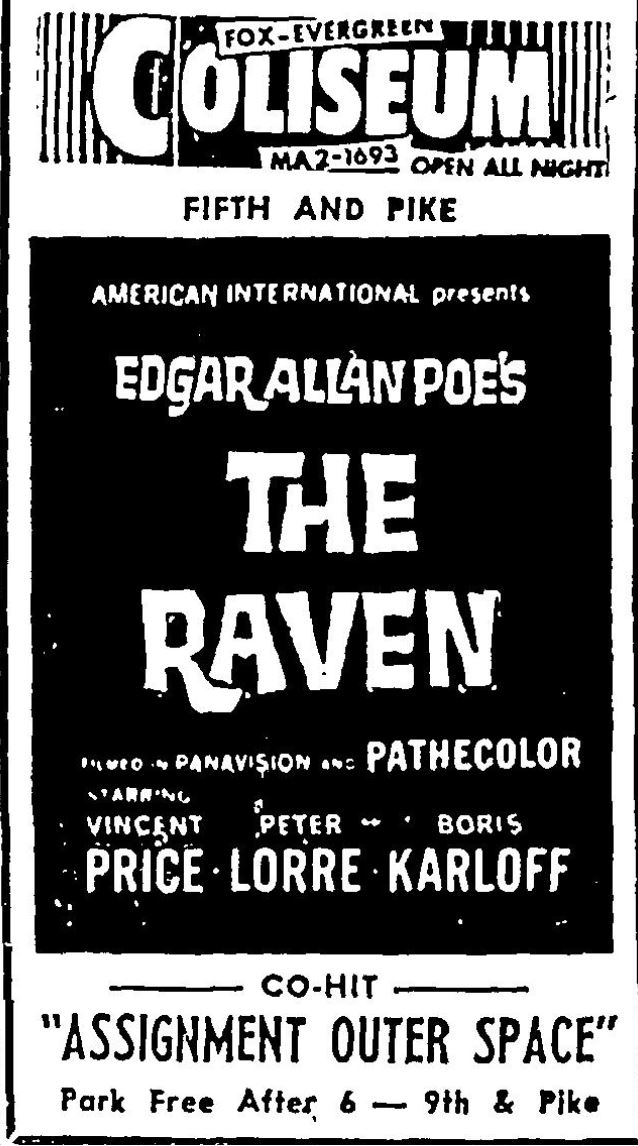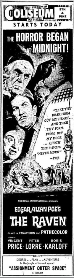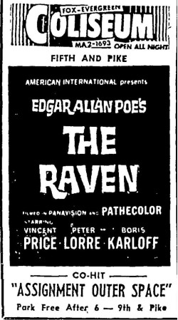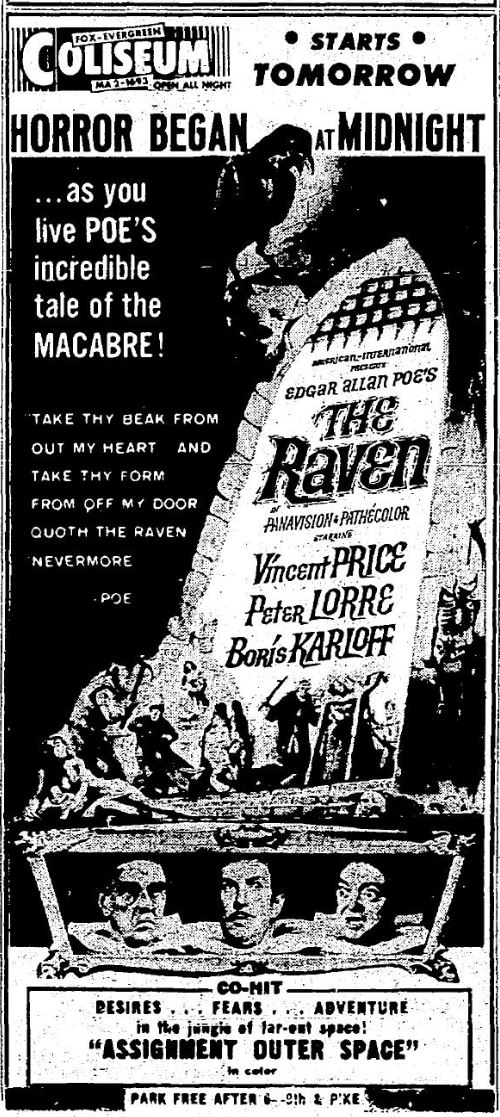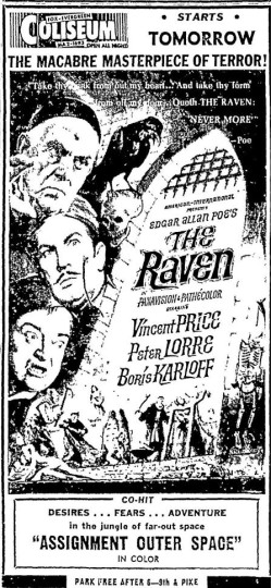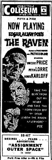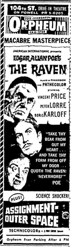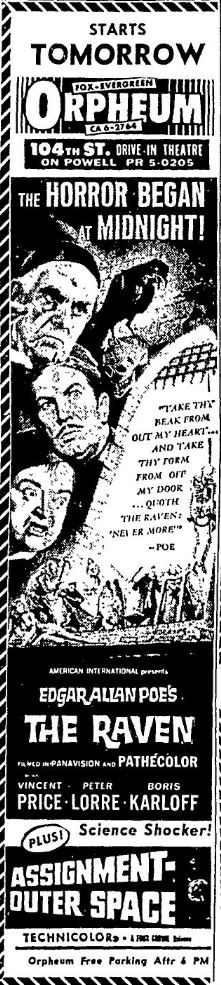 This is a collection of media from the initial releases of "The Raven" (1963) in the Pacific Northwest. "Assignment Outer Space" (1962) was the second feature.