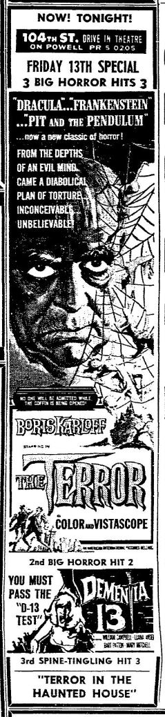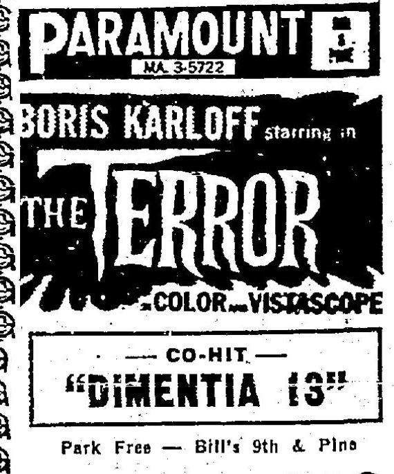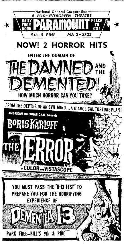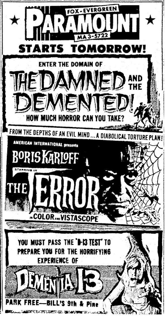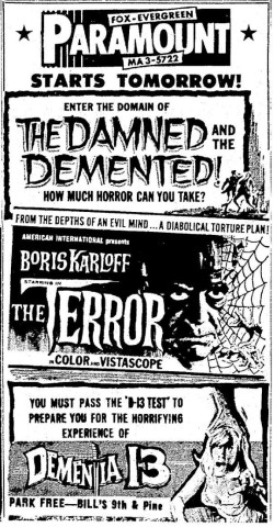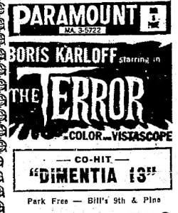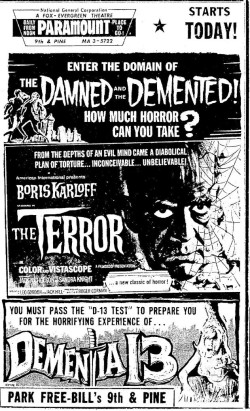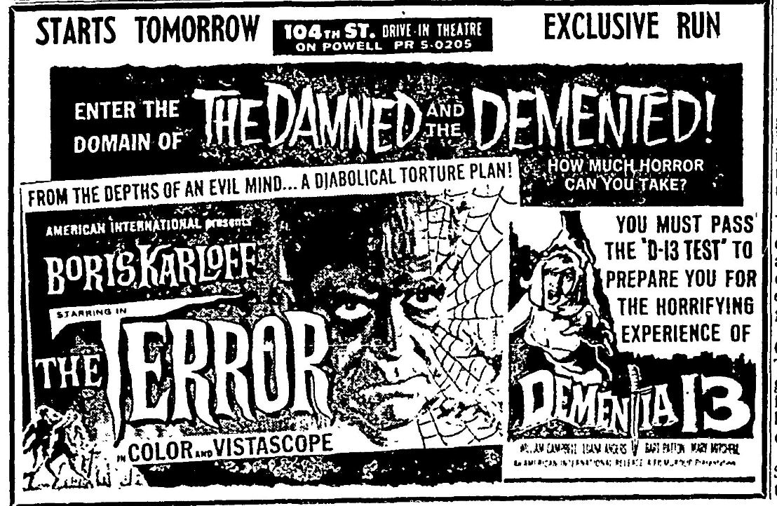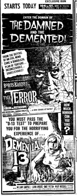 This is a collection of media from the initial runs of "The Terror" and "Dementia 13" (1963) in the Pacific Northwest.