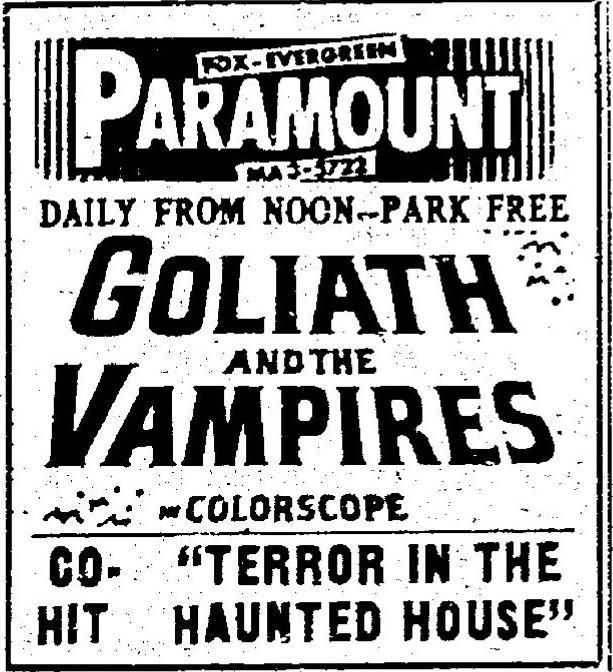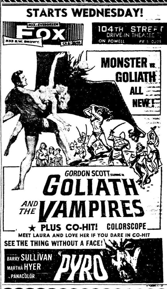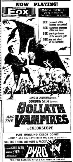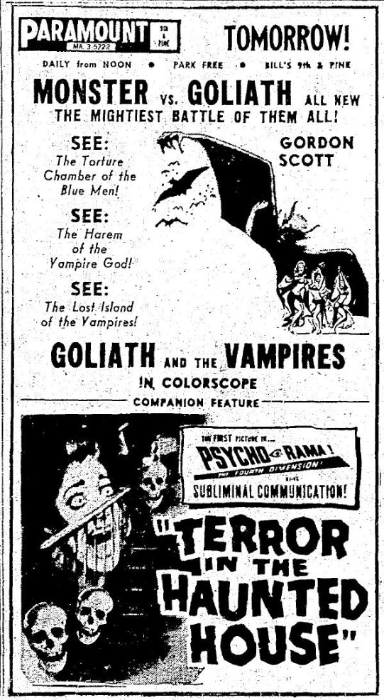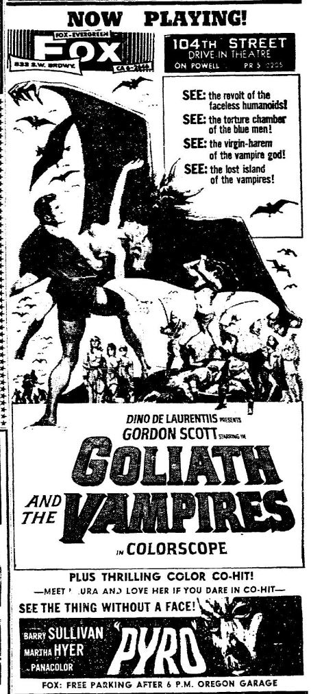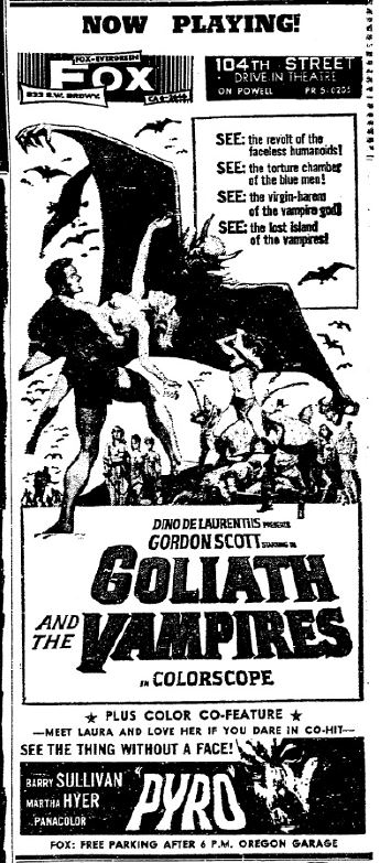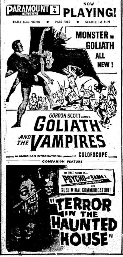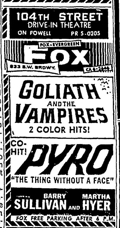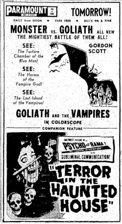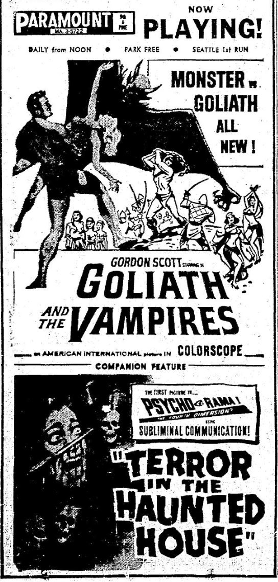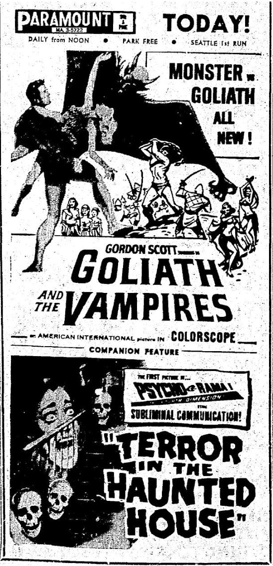 This is a collection of media from the initial runs of "Goliath and the Vampires" (1964) in the Pacific Northwest. Seattle got "Terror in the Haunted House" (AKA My World Dies Screaming, 1959) for a second feature while Portland got "Pyro... The Thing Without a Face" (1964)