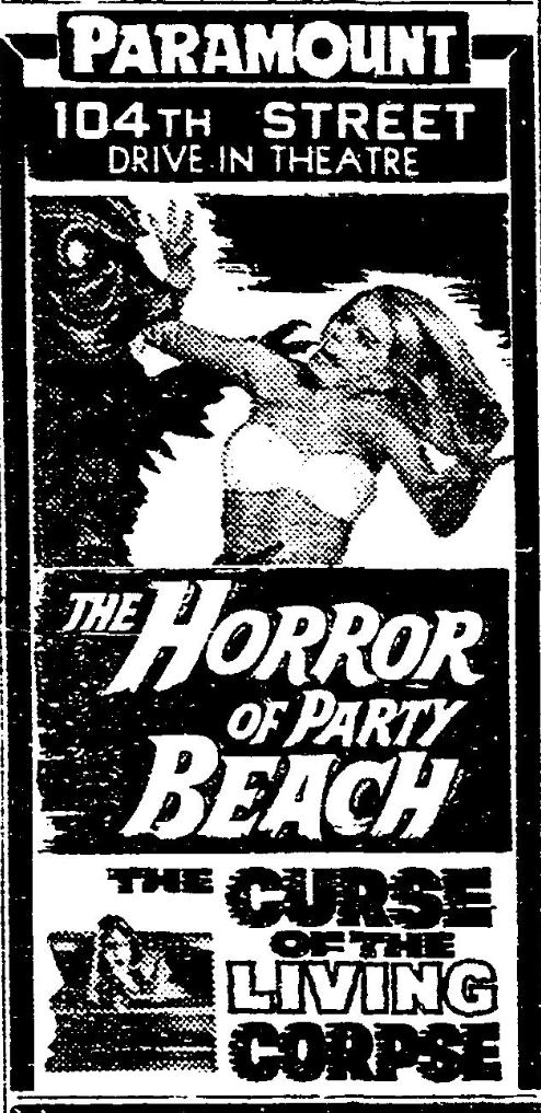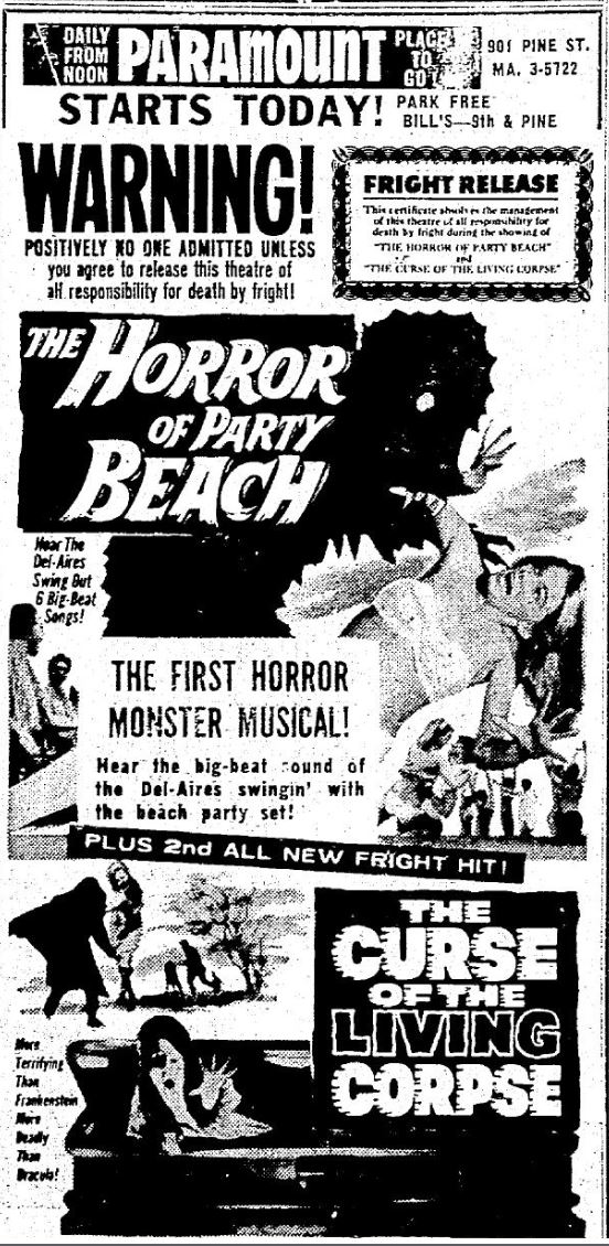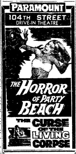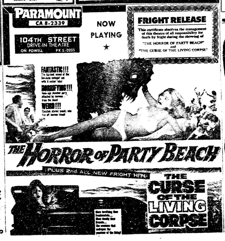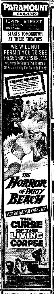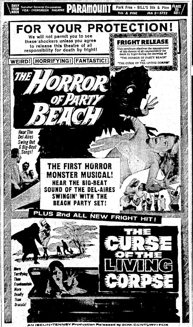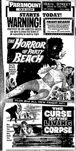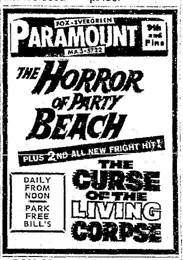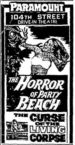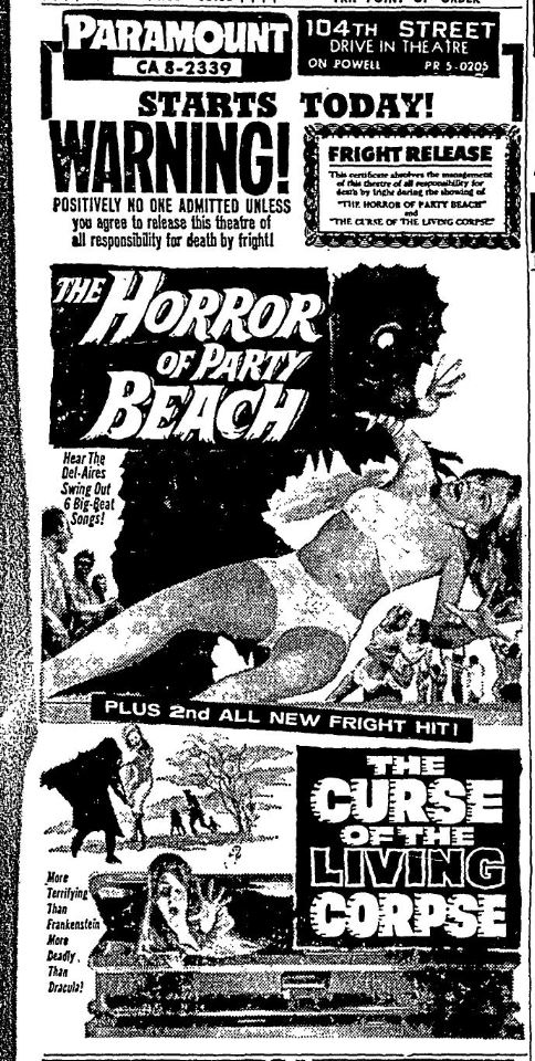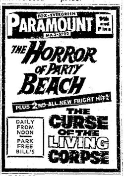 This is a collection of media from the initial runs of "The Horror of Party Beach" (1964) in the Pacific Northwest. As with everywhere else, the co-feature was "Curse of the Living Corpse" (1964)